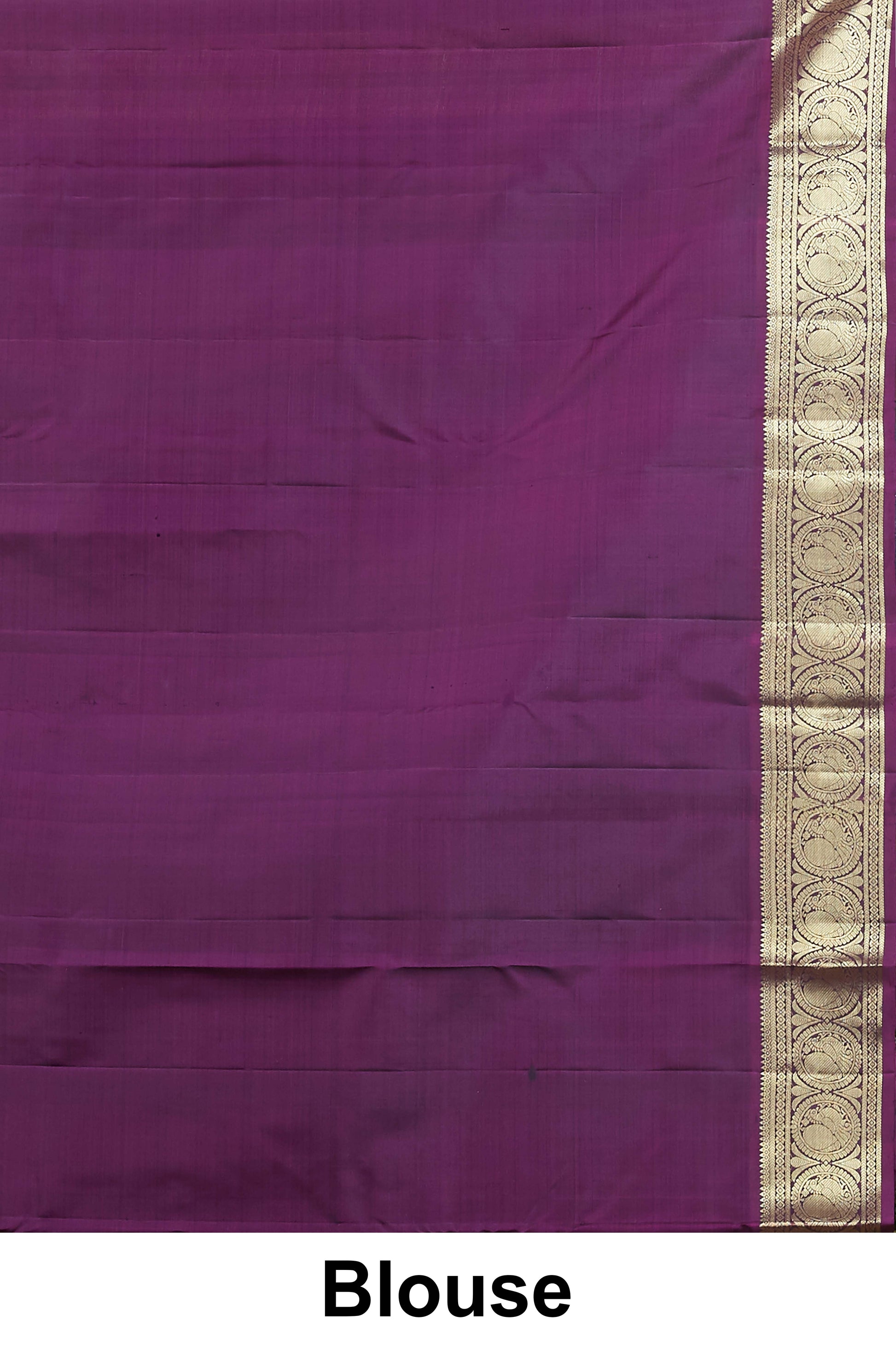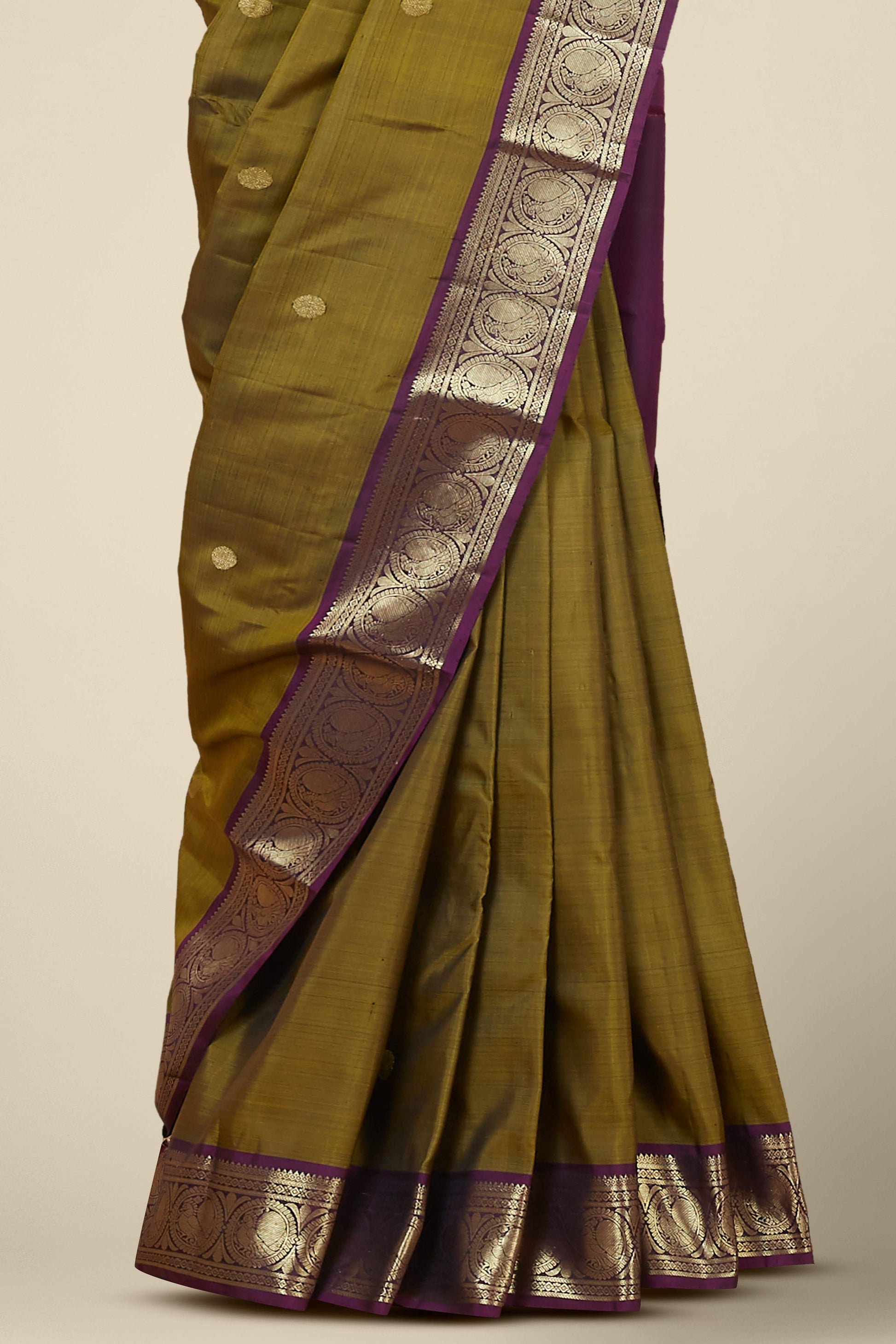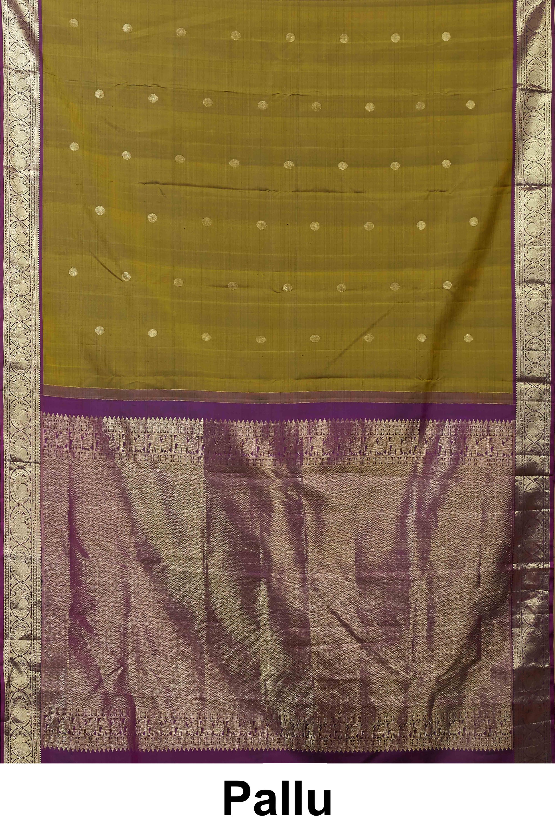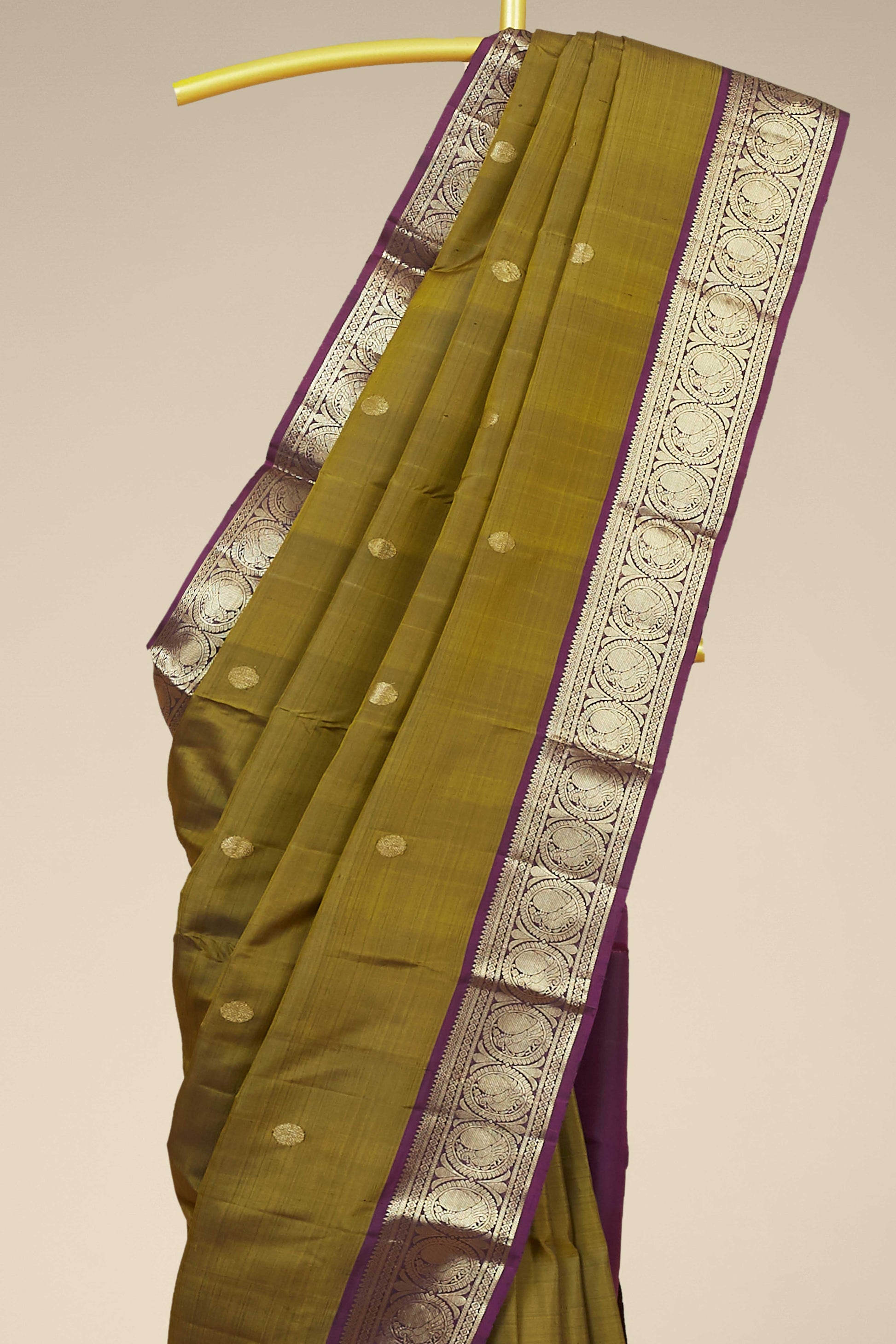 Kanchipuram Traditional Silk Saree in Olive Green with Silver Zari Buttas and Purple Contrast Border