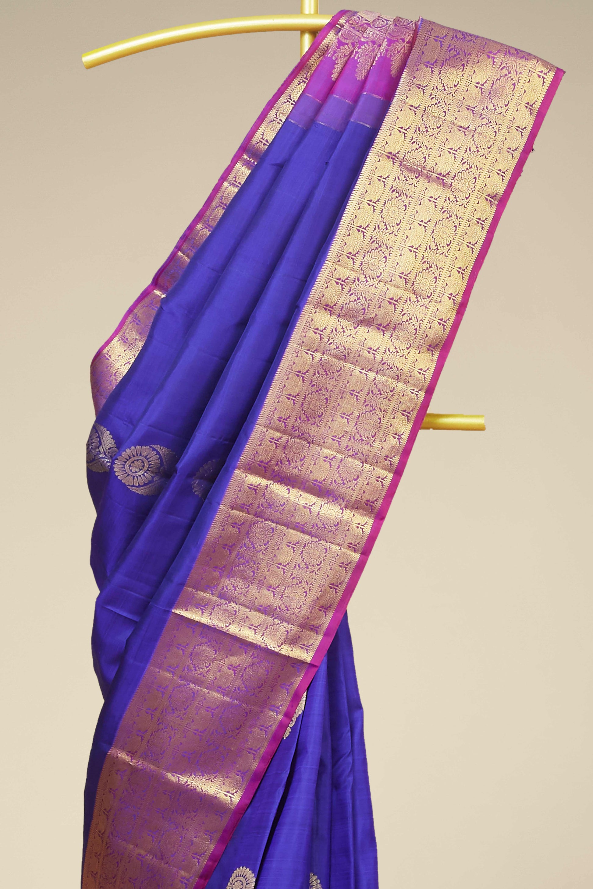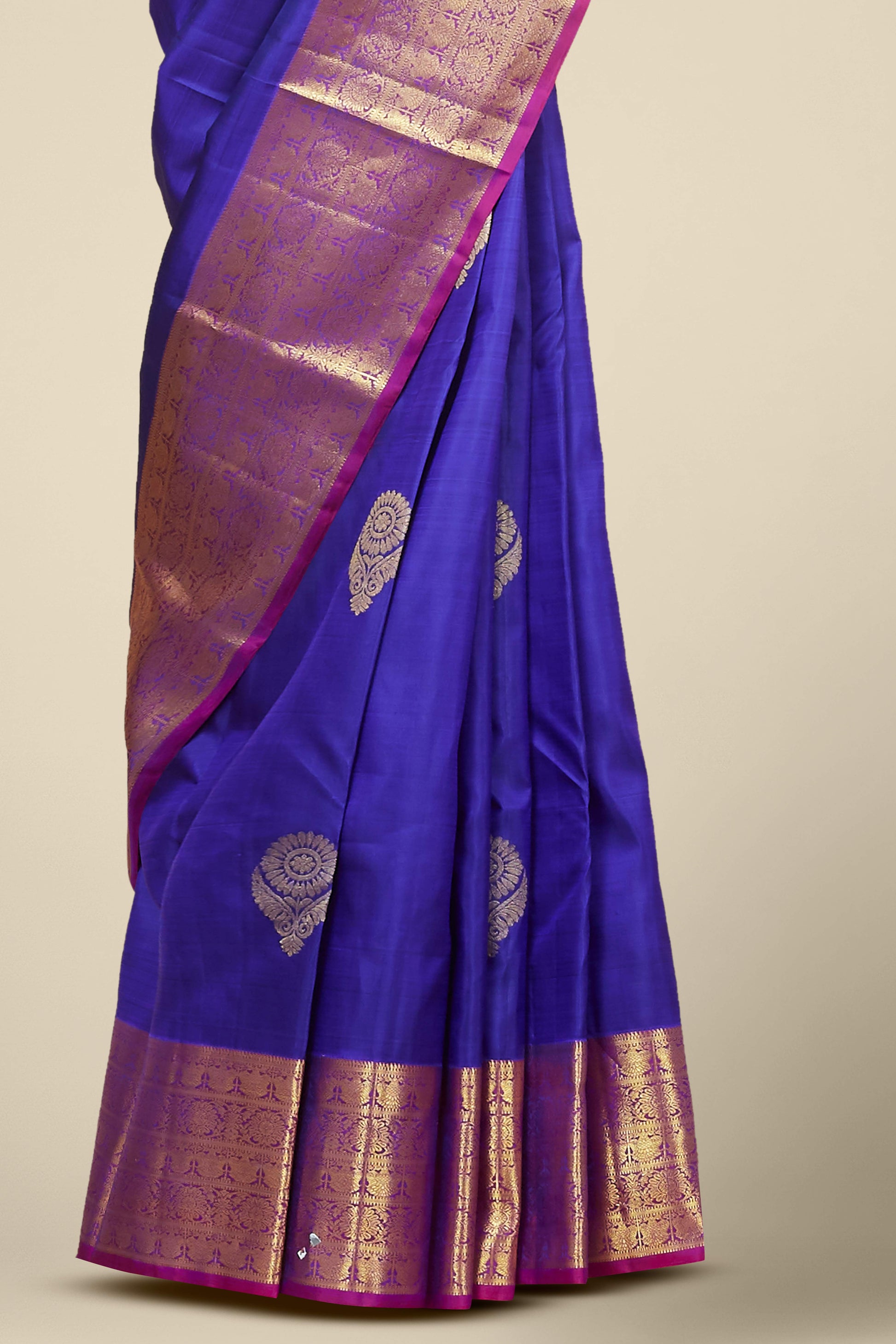 Kanchipuram Traditional Silk Saree in Royal Blue with Silver Zari Buttas and Pink Contrast Border