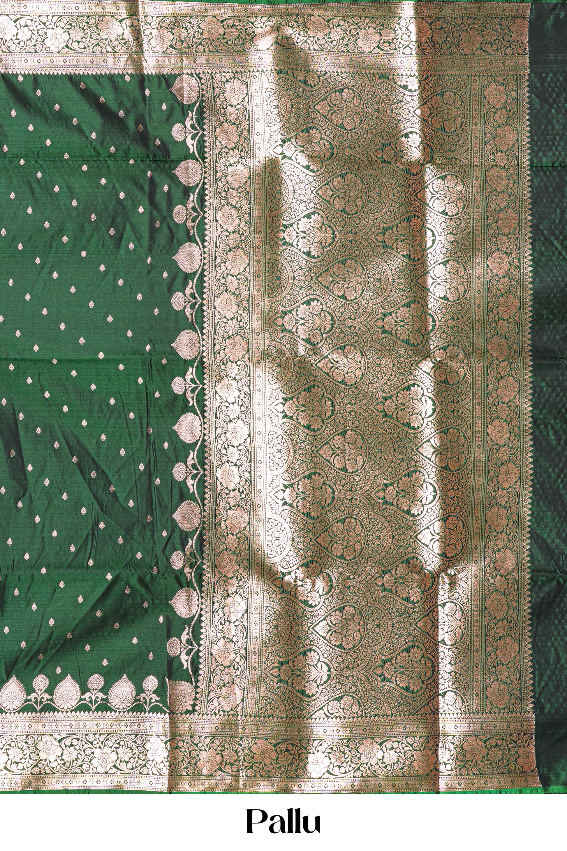 Green Kathan Silk Saree All-Over Body Detailing Intricate Zari Butta, Floral Design Pallu Along With Gold Zari Blouse