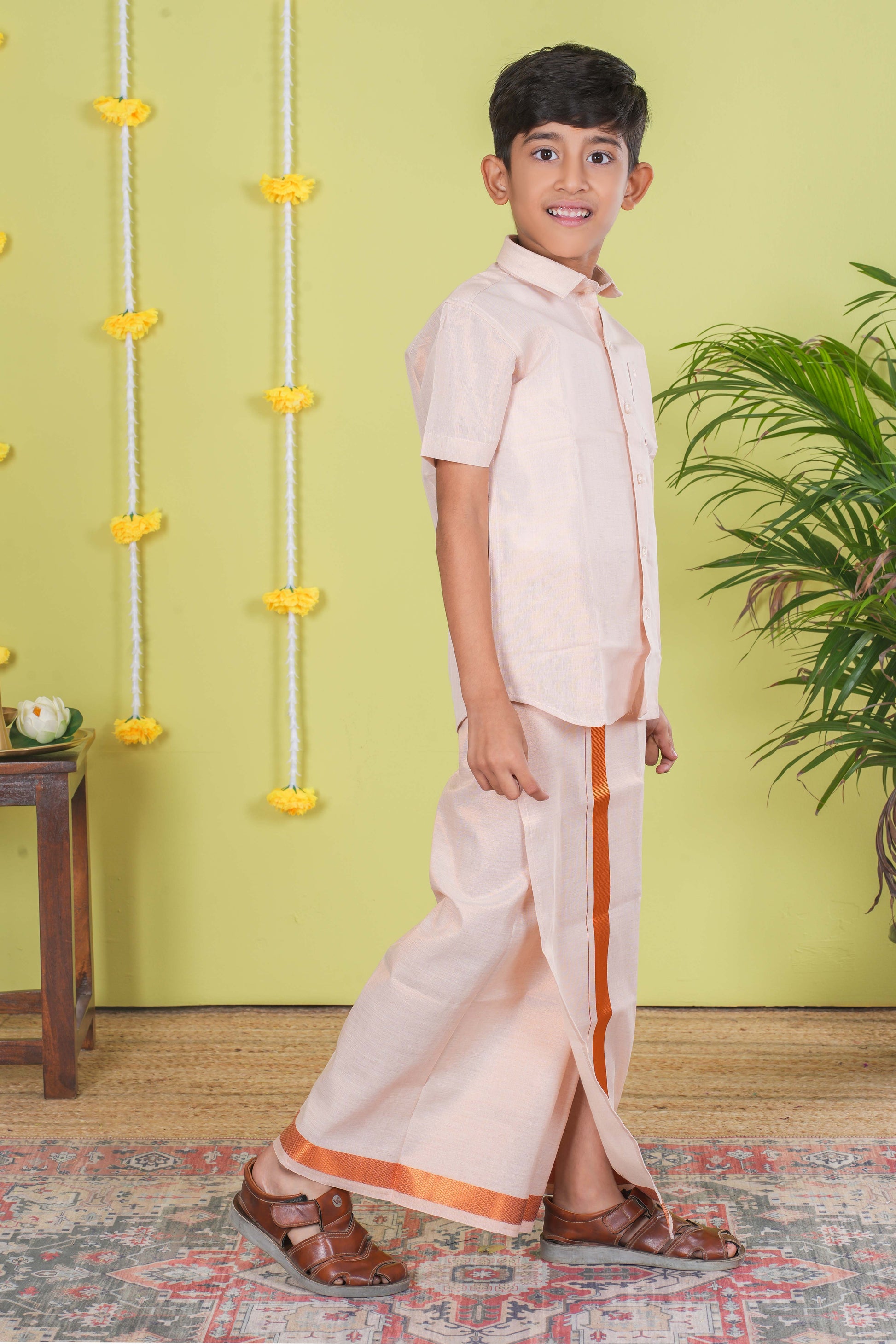 Traditional Boy's Dhoti Shirt Set Plain Half Sleeve Tissue Shirt With Copper Zari Border Dhoti