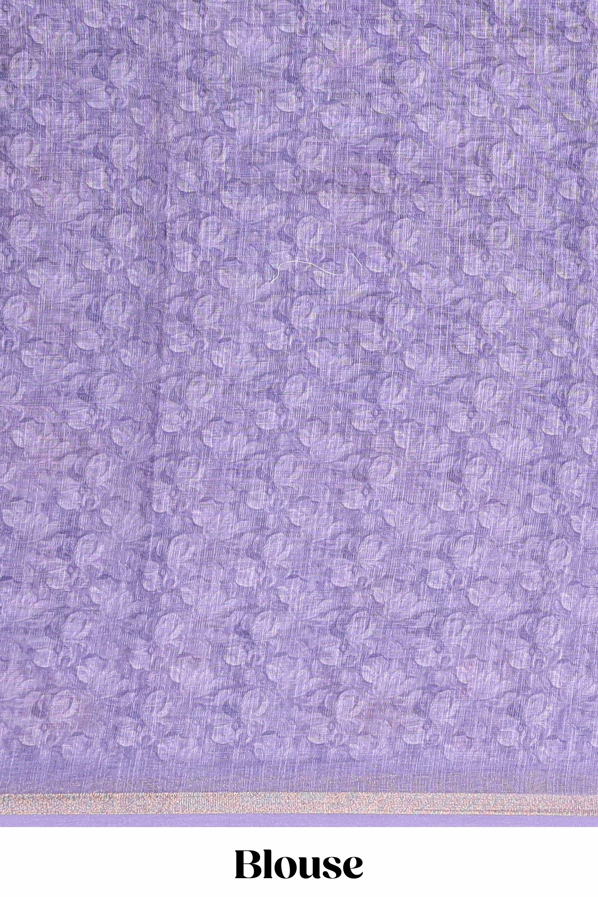 Lavender linen cotton saree with floral design and Ikkat motif pallu