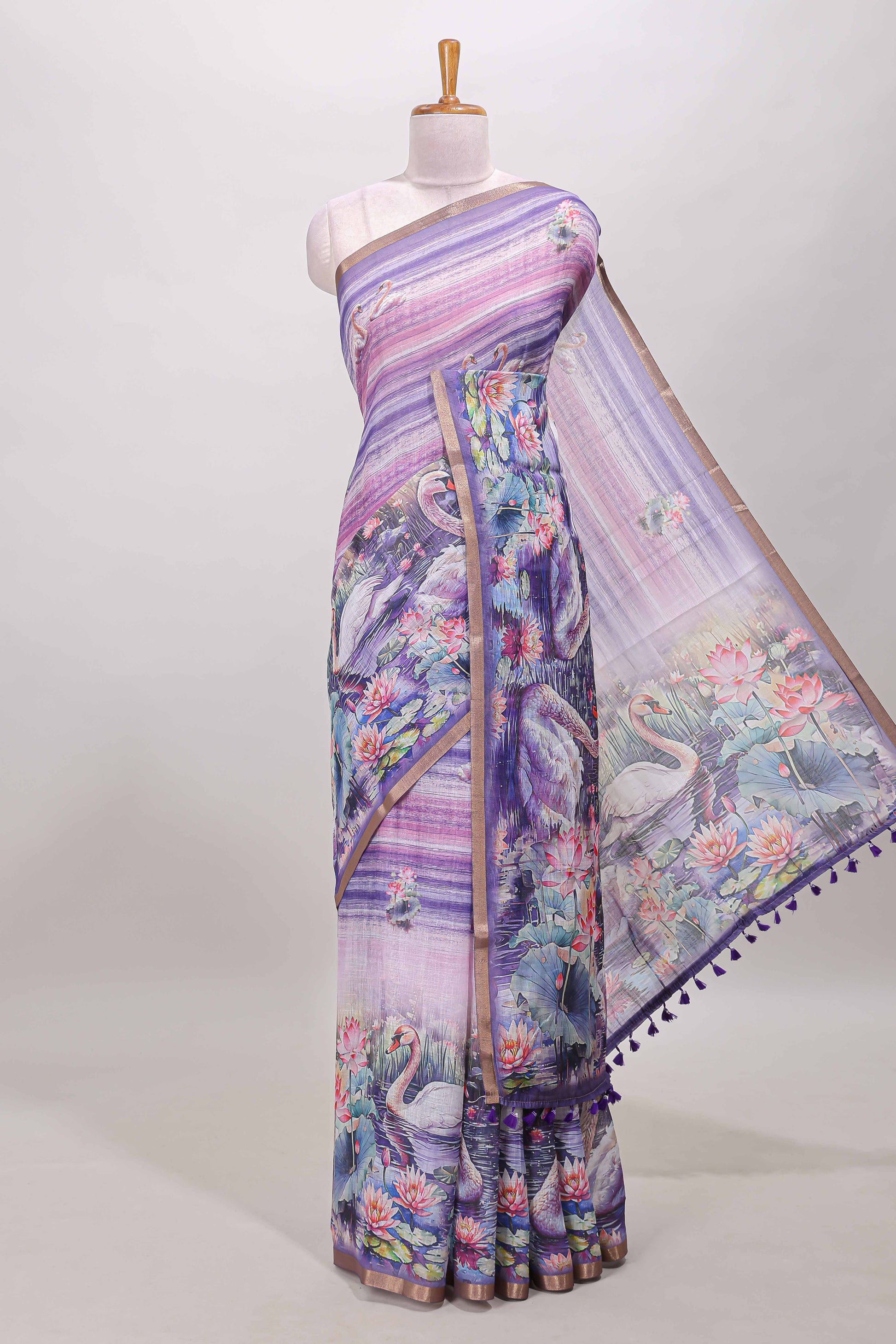 Lavender linen cotton saree with swan & lotus pond print, self zari border and matching printed pallu