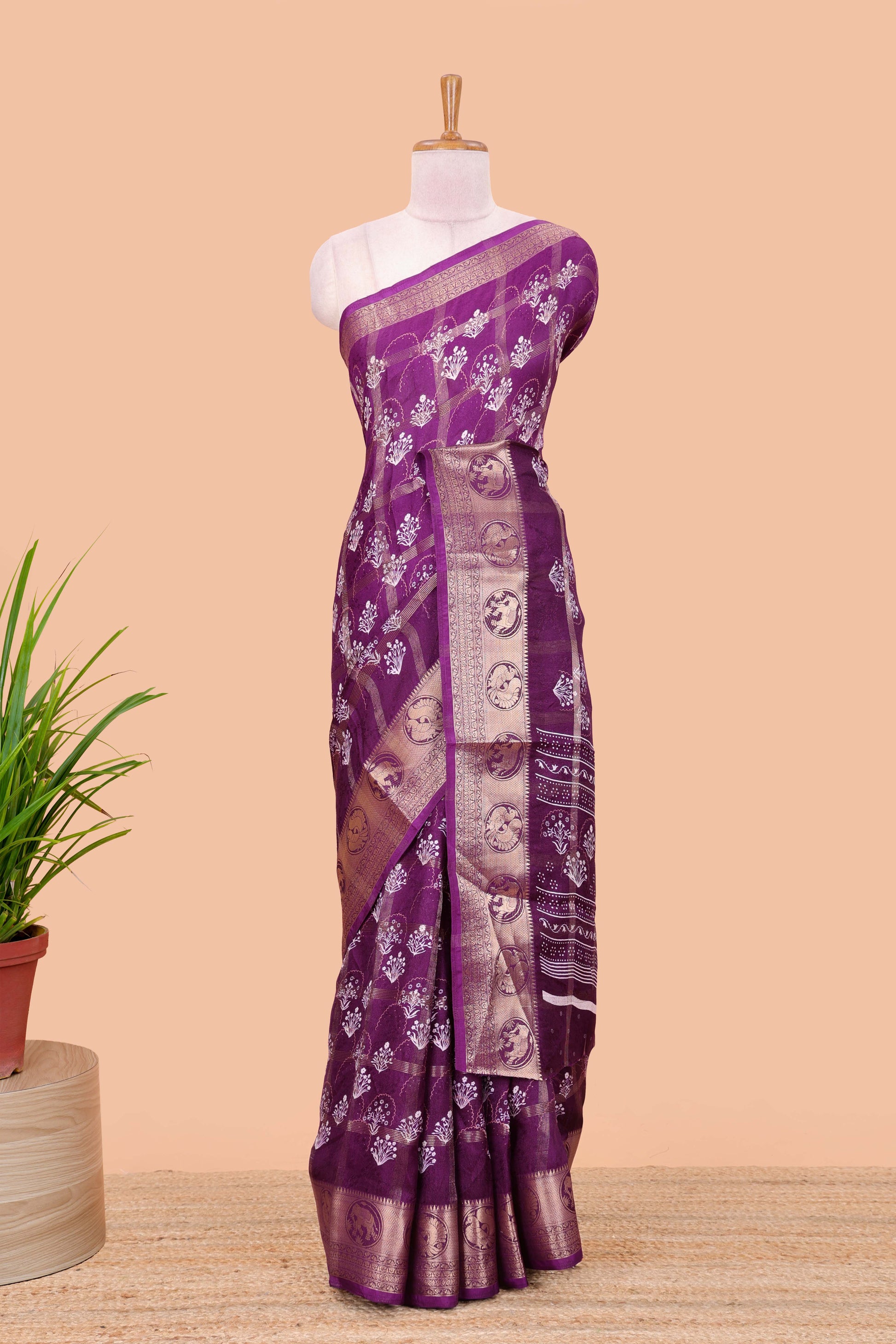 Lavender moss chiffon saree with floral checked butta and self border