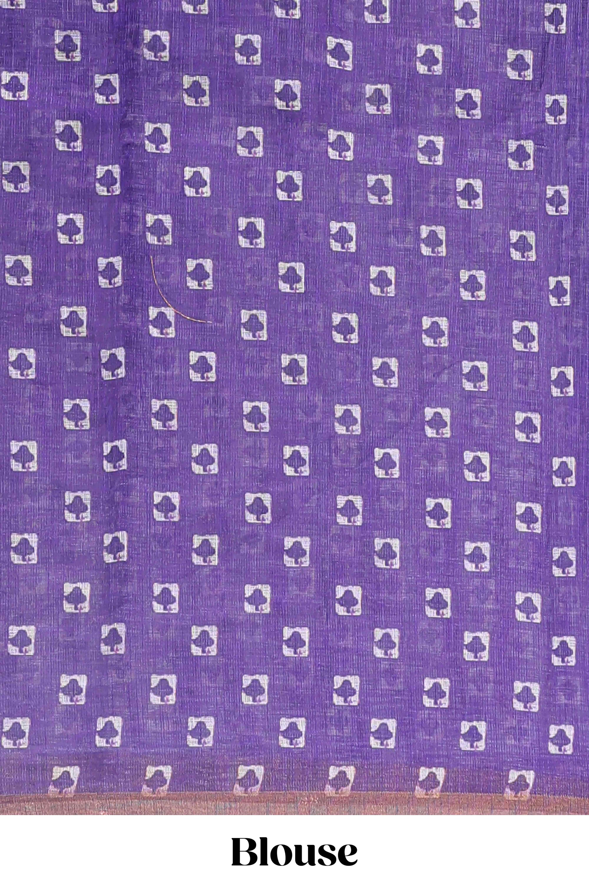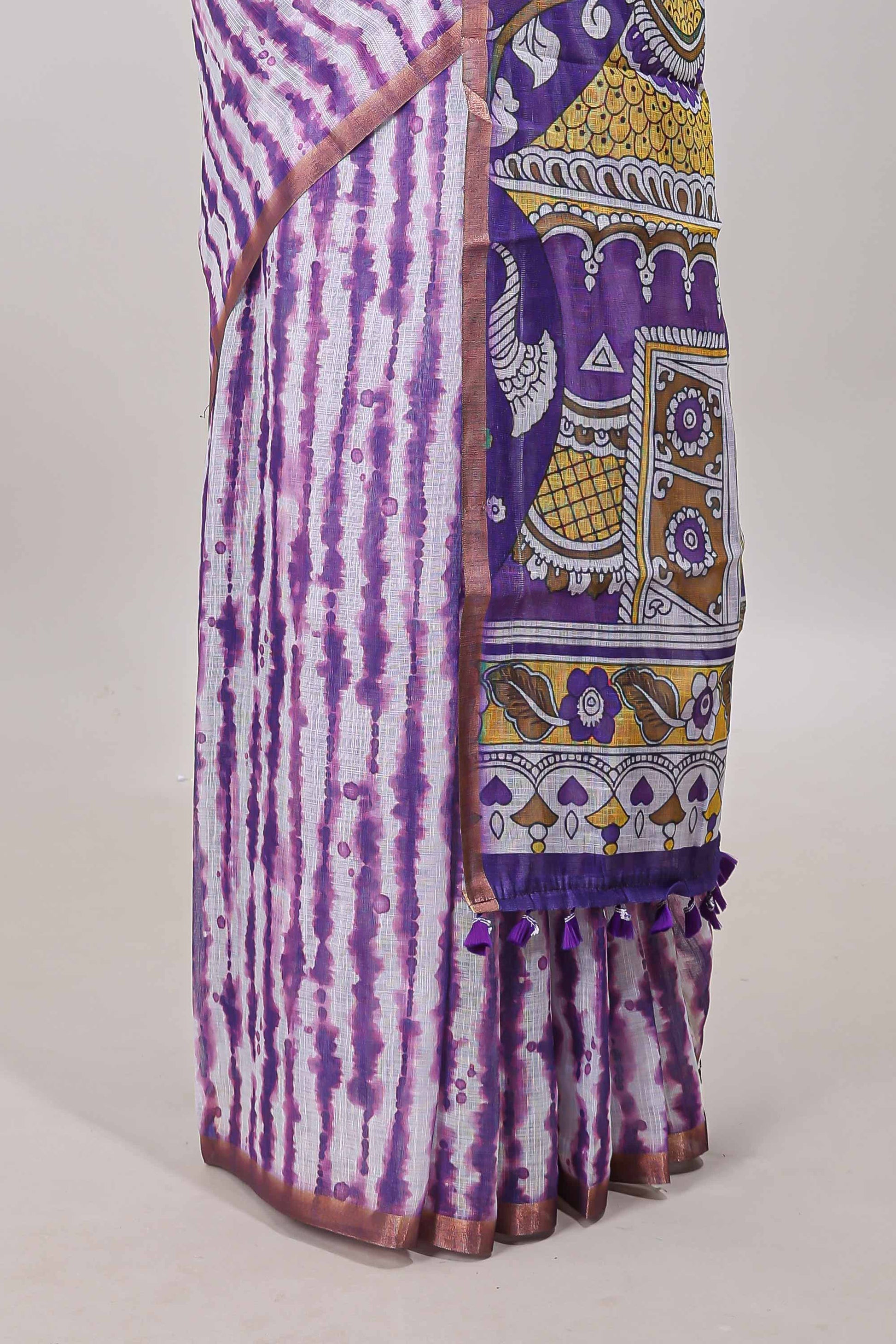 Lavender striped shibori print linen cotton saree with self zari border and printed pallu