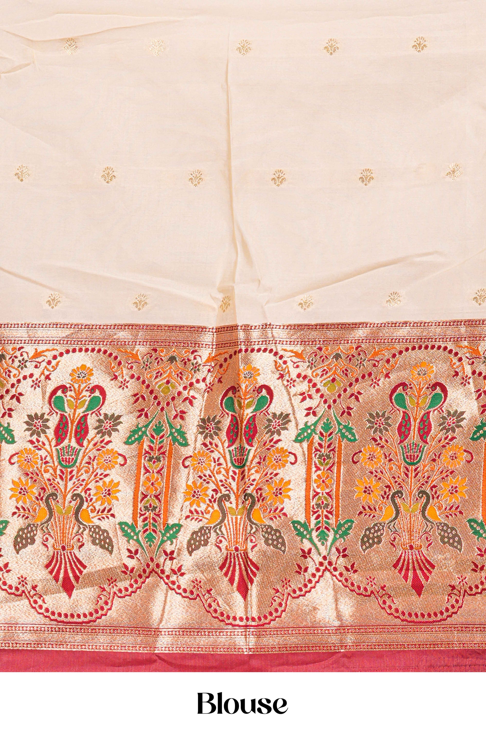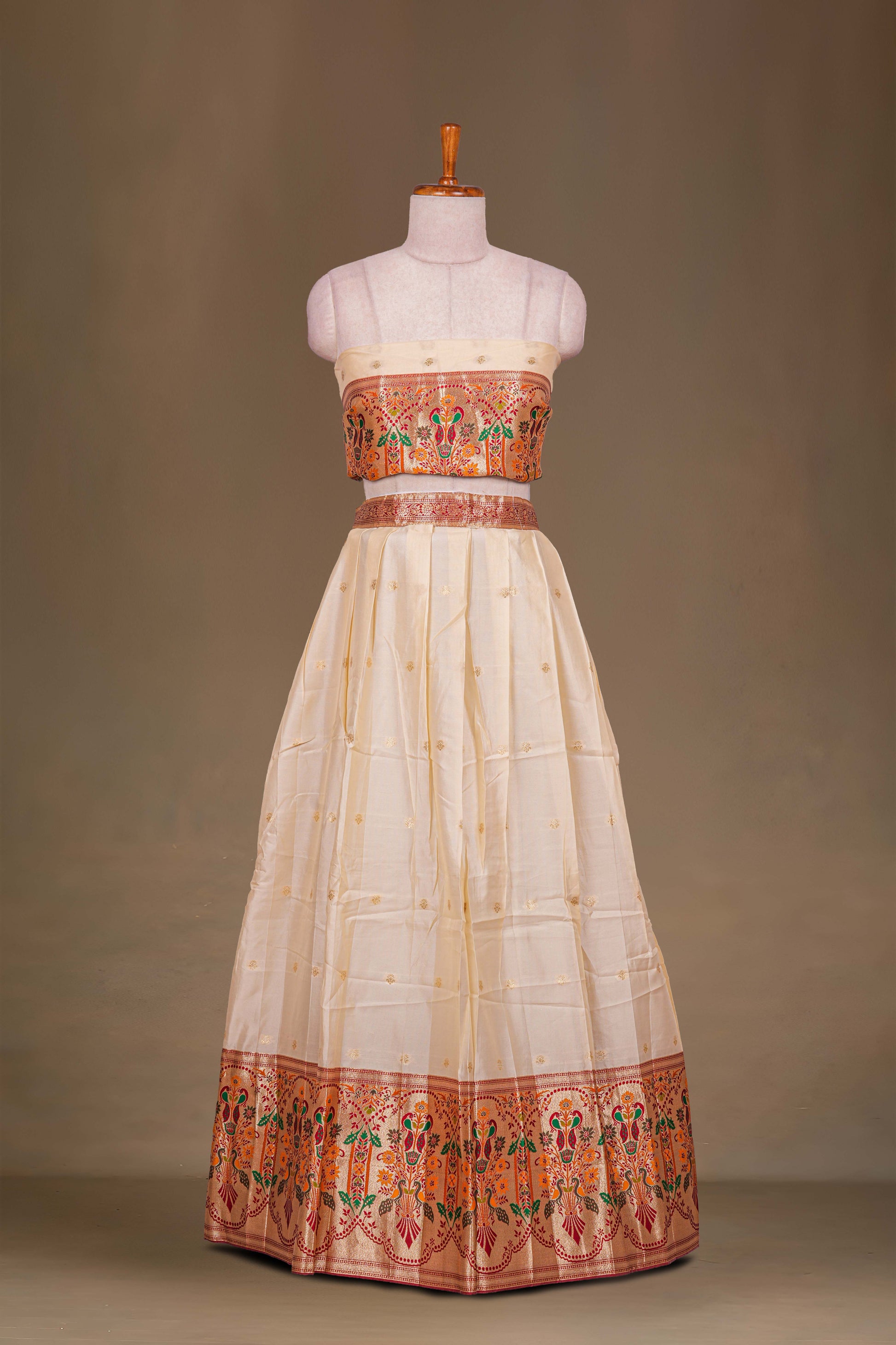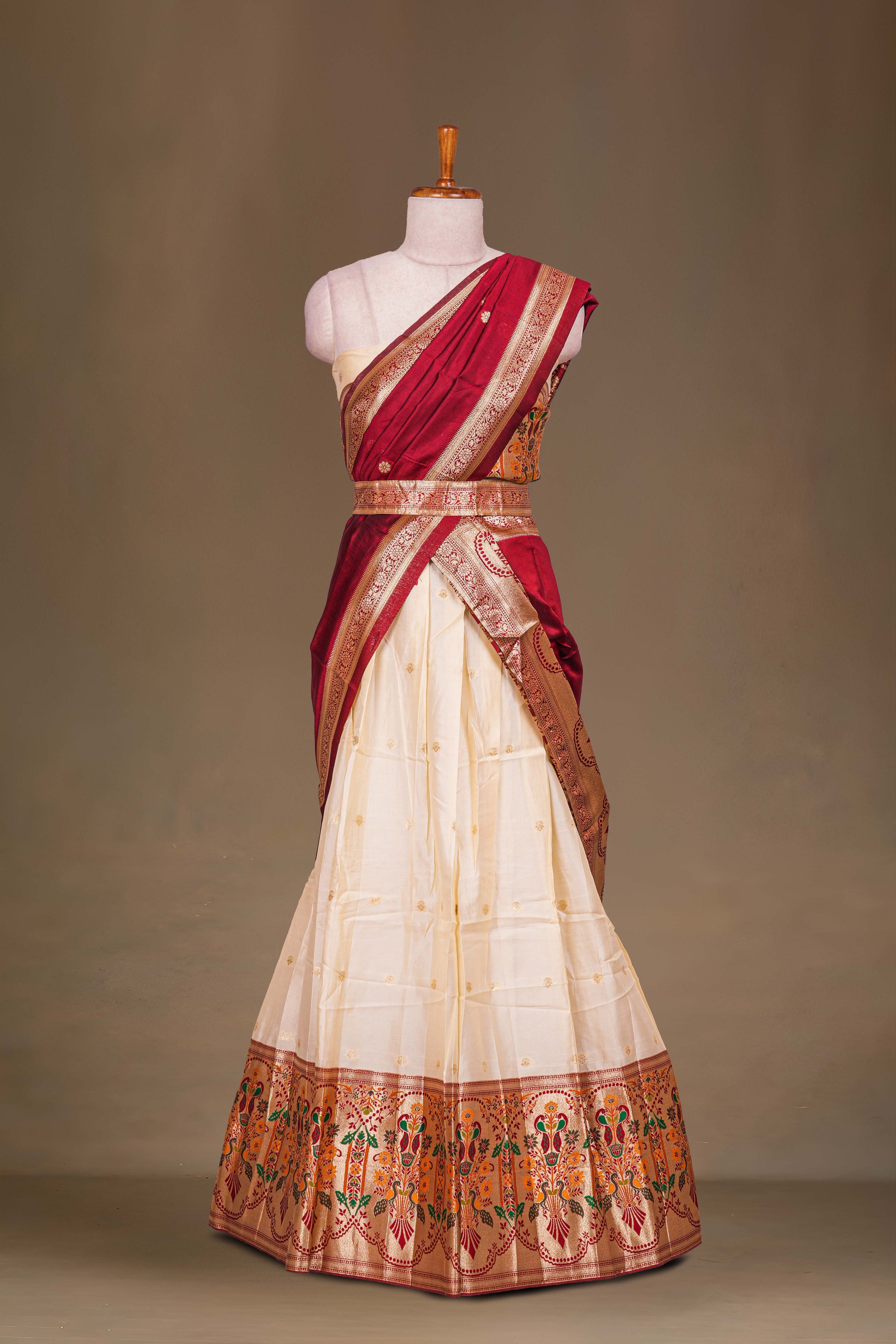 Kerala -Style Half Saree Gold Zari Border With Intricate Zari Weaving Blouse & Contrast Dhavani
