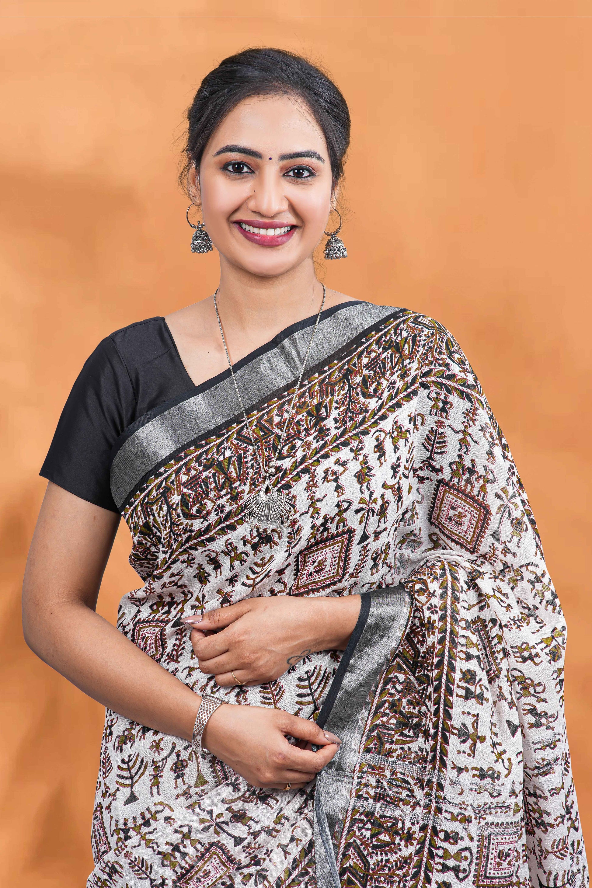 White Linen Saree With Traditional Warli print