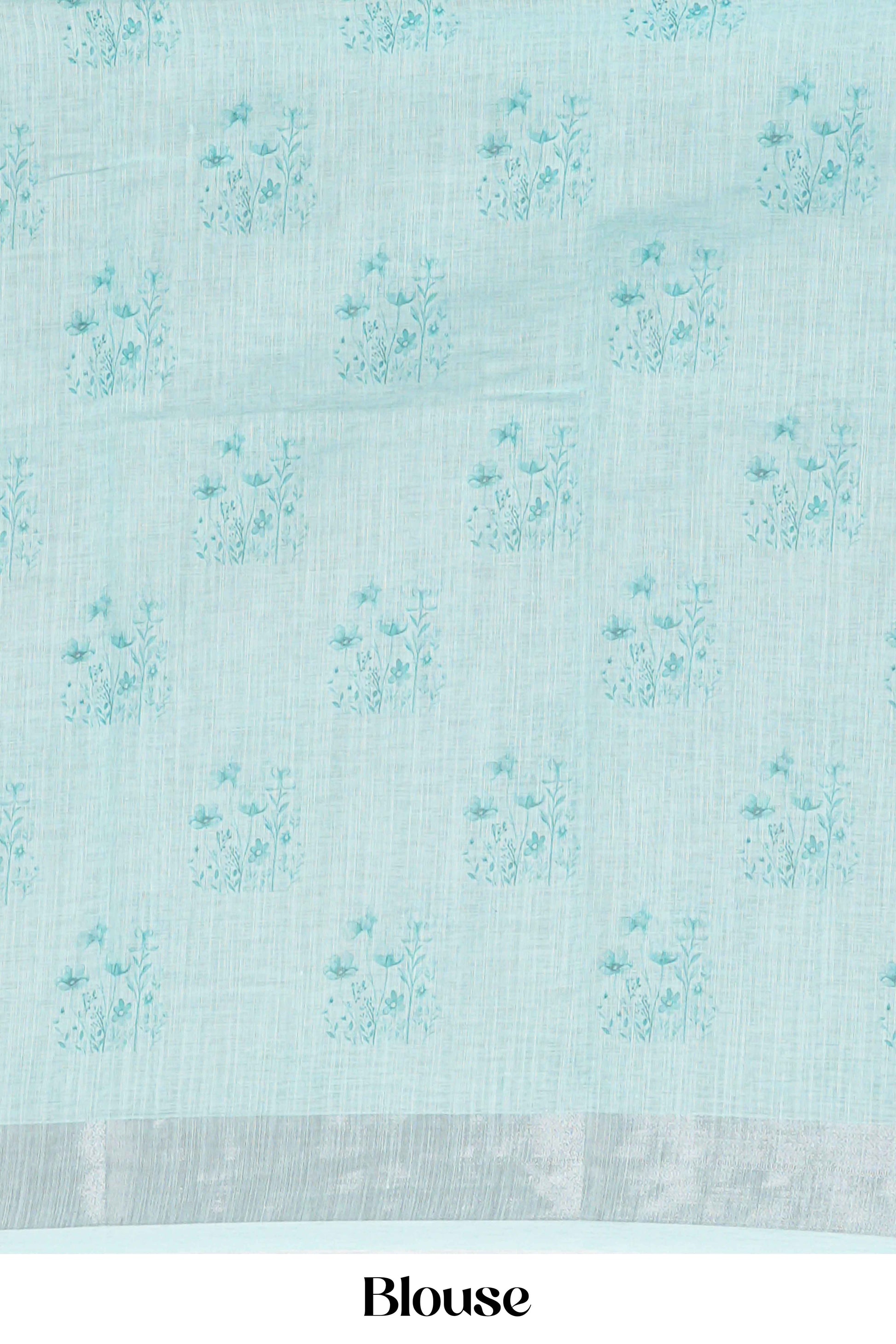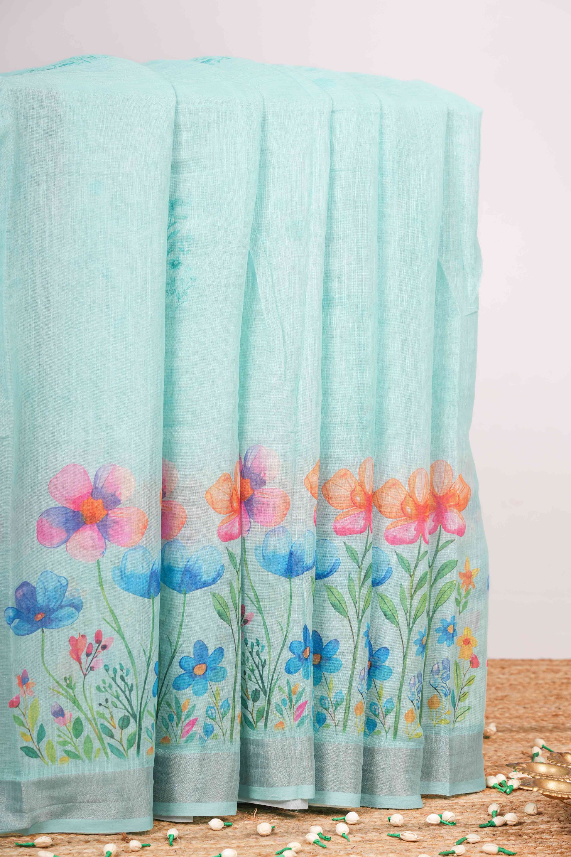 Green Linen Saree Intricate Multi Colour Floral Design Along With Pallu