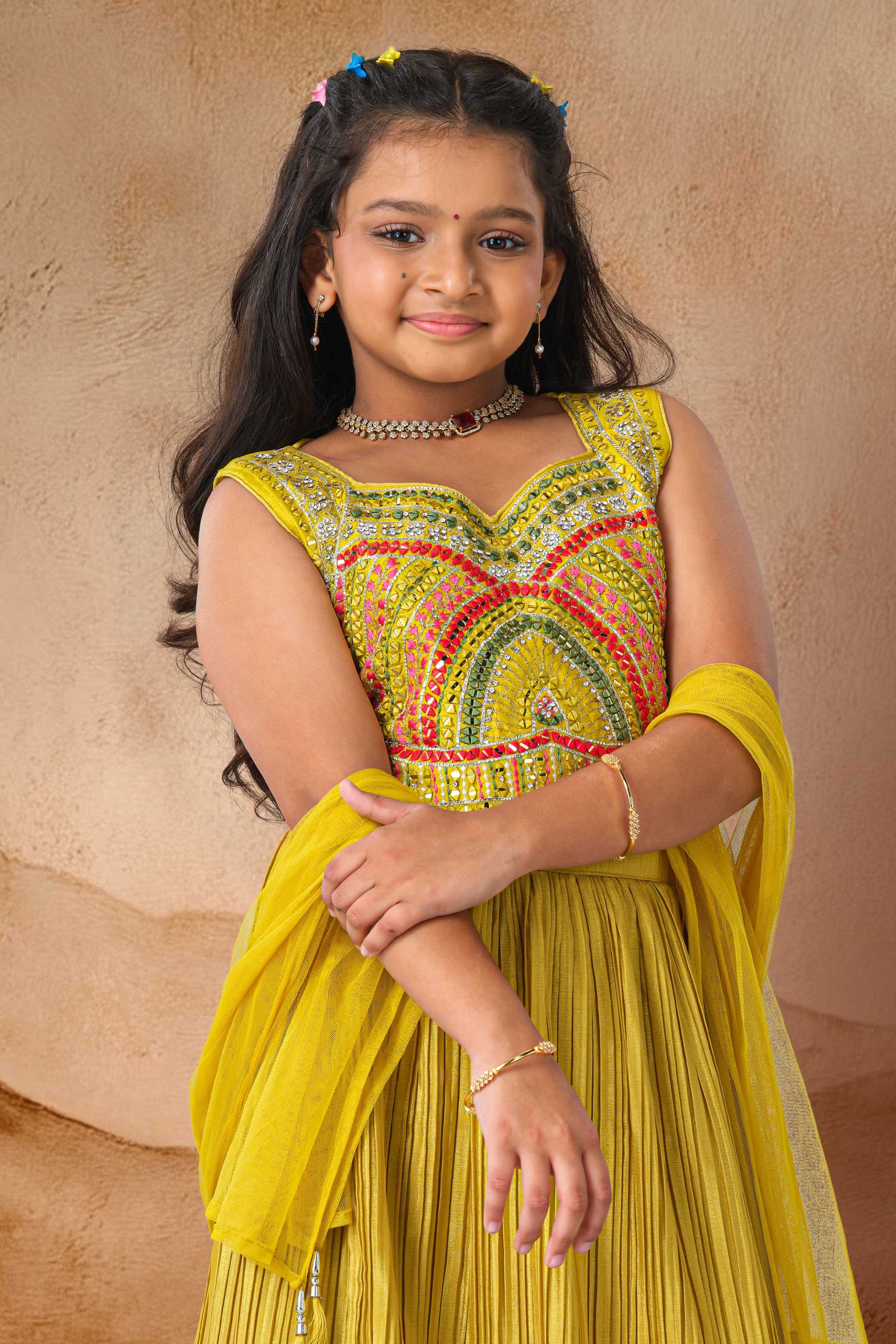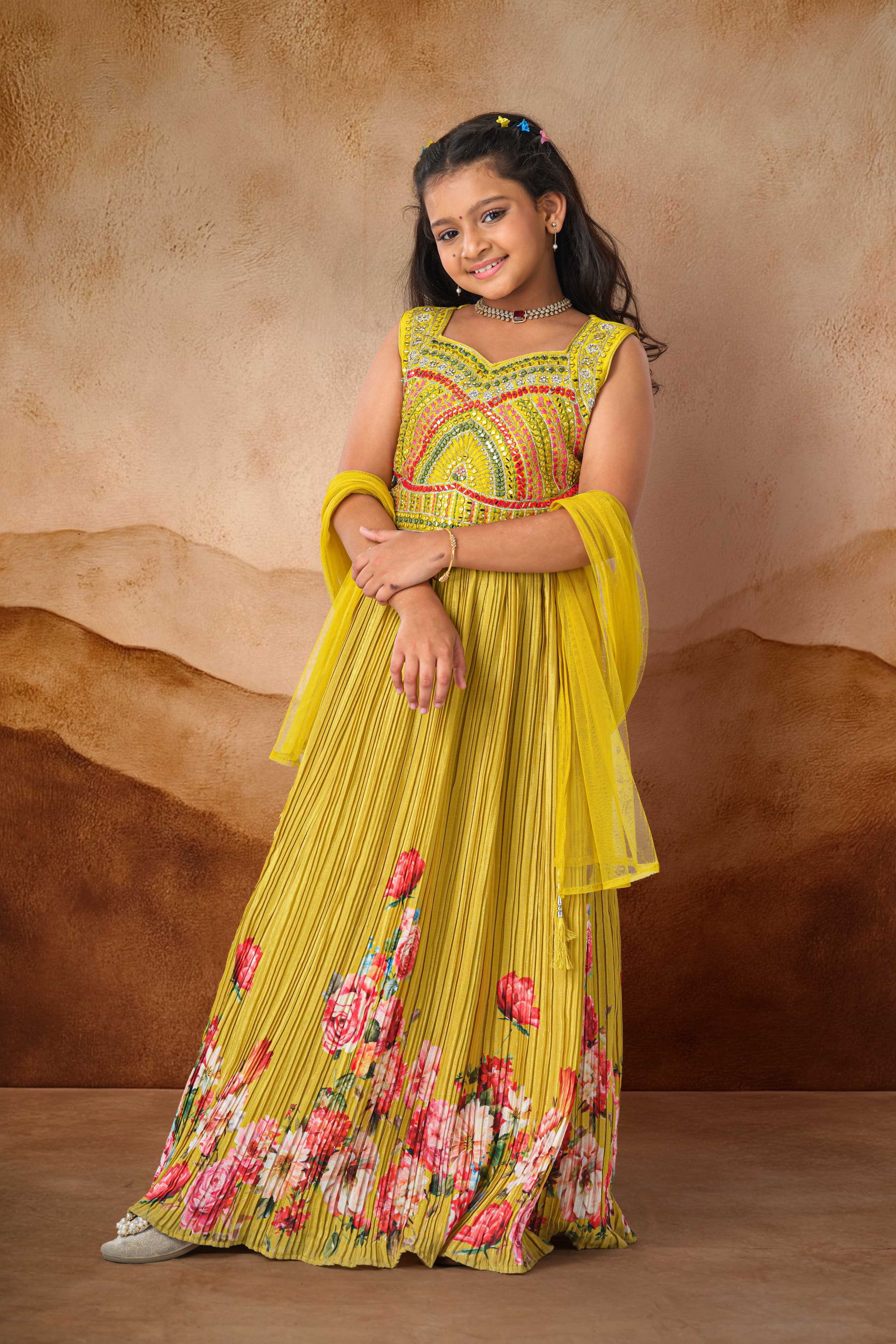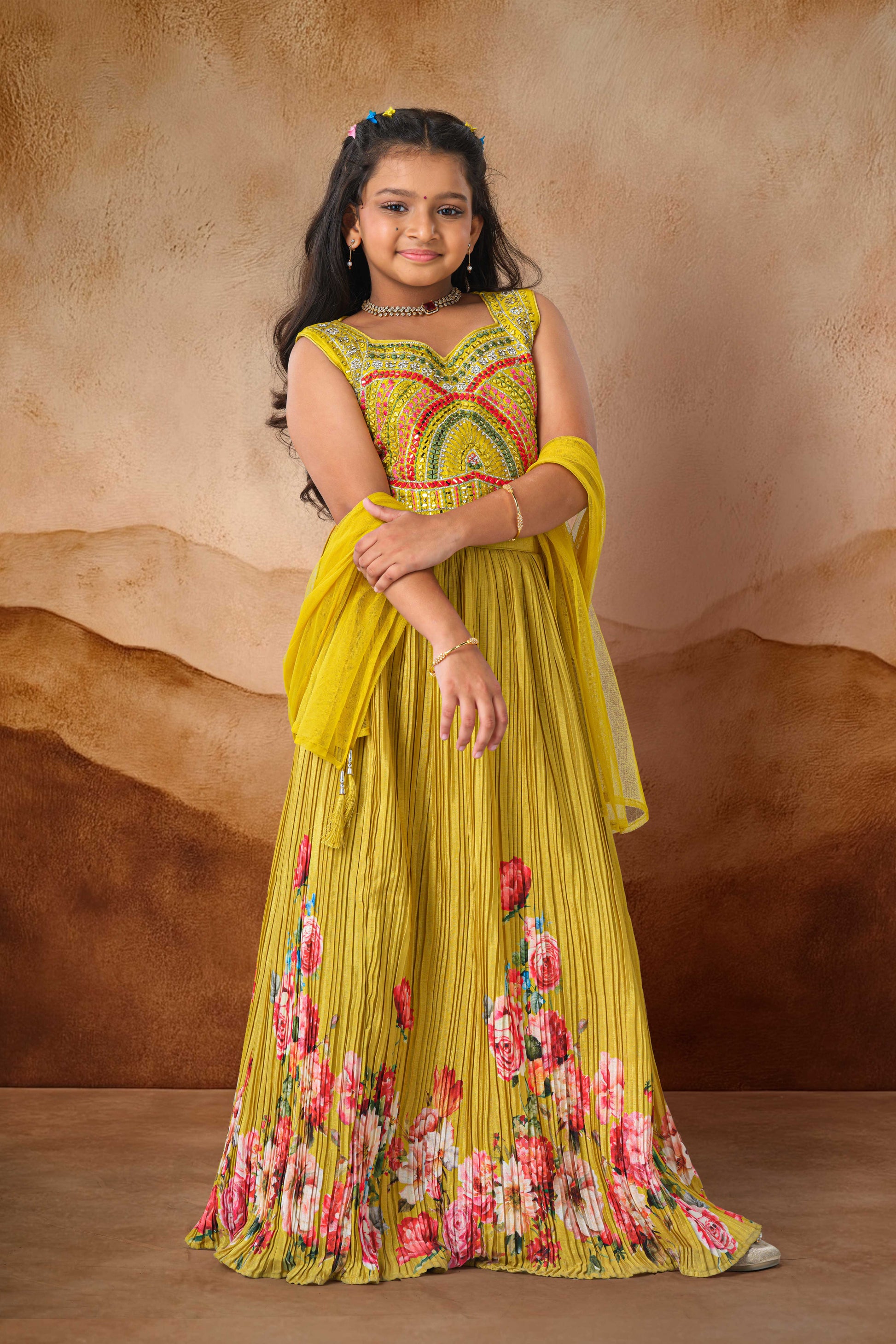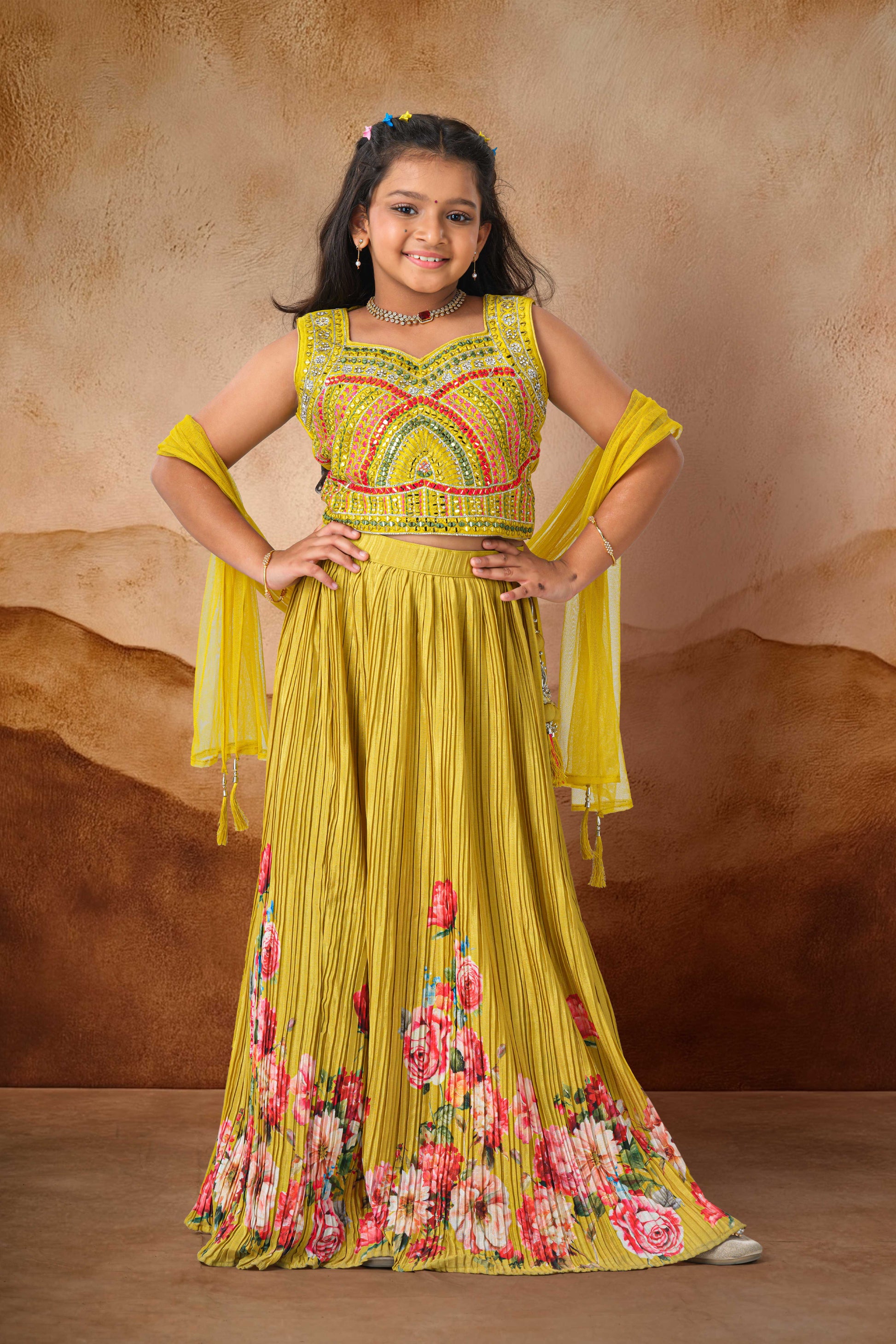 Make a Statement In This Exquisite Party Wear Olive Yellow Choli Lehenga Detailing Thread Work ,Mirror ,Stone Embroidery Top And permanent pleat Flared Skirt Adorned With Detailed Floral Print That Adds A Touch Of Regal Charm. Paired With Dupatta