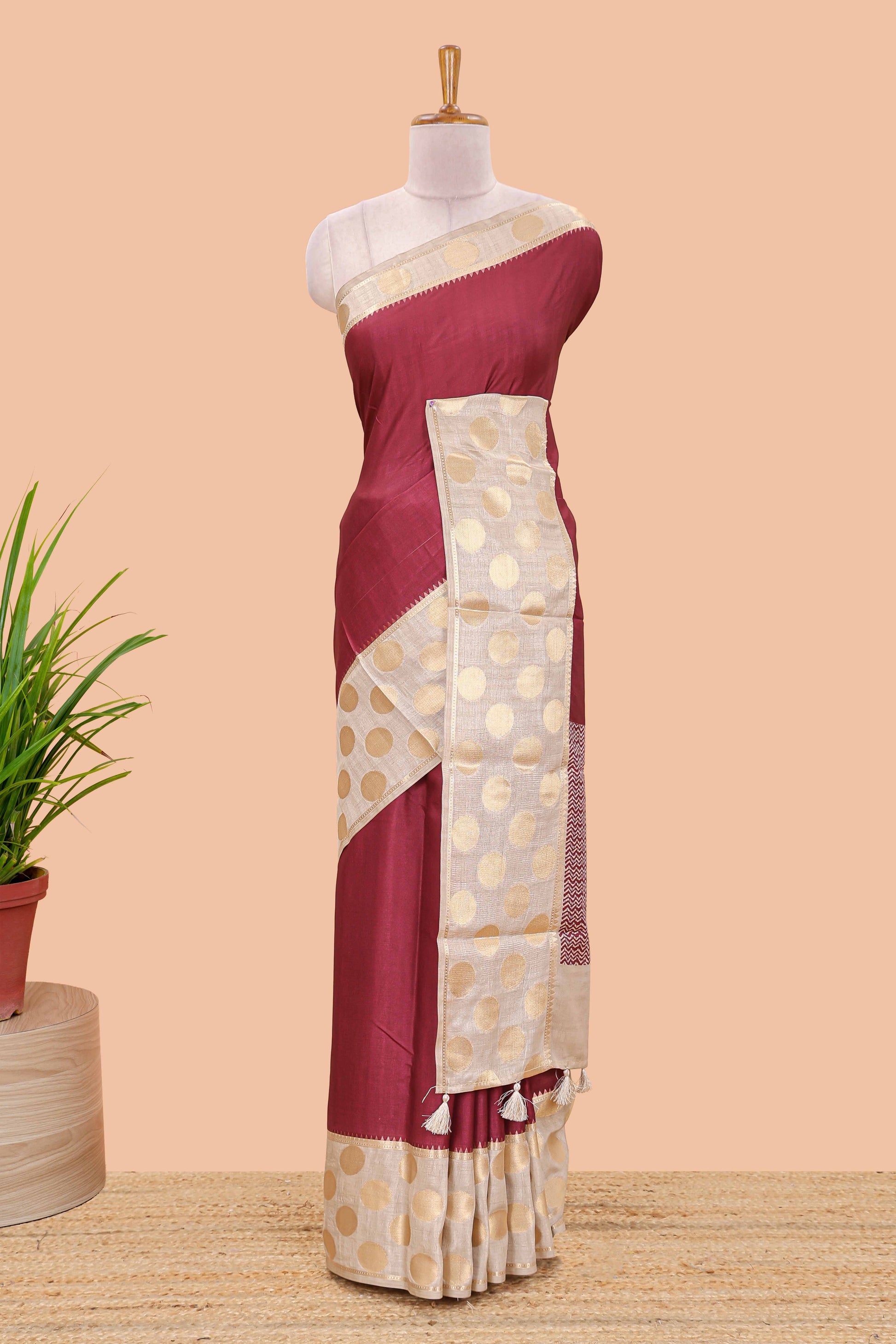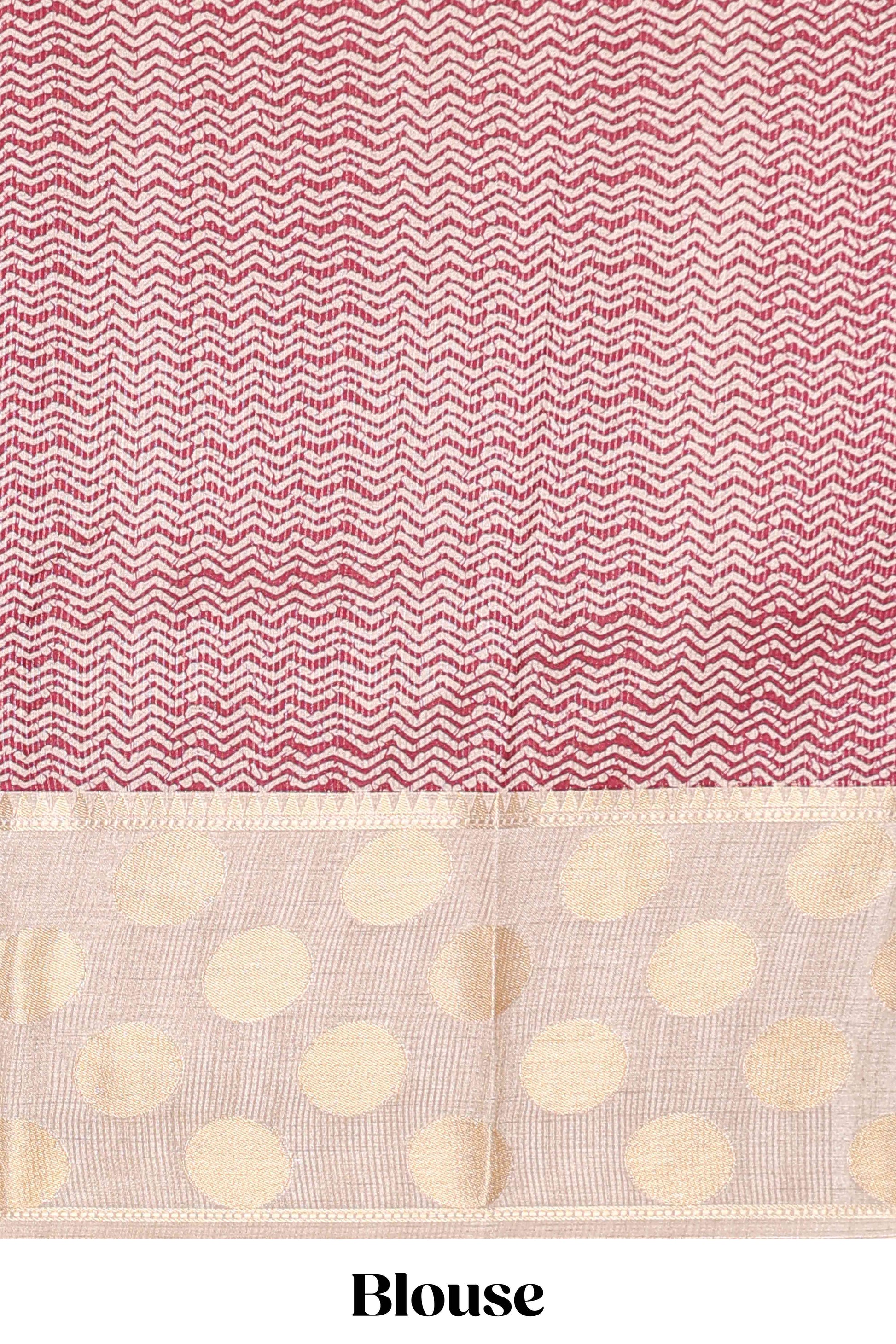 Maroon art tussar saree with plain body, cream coin motif zari border and zig-zag printed pallu