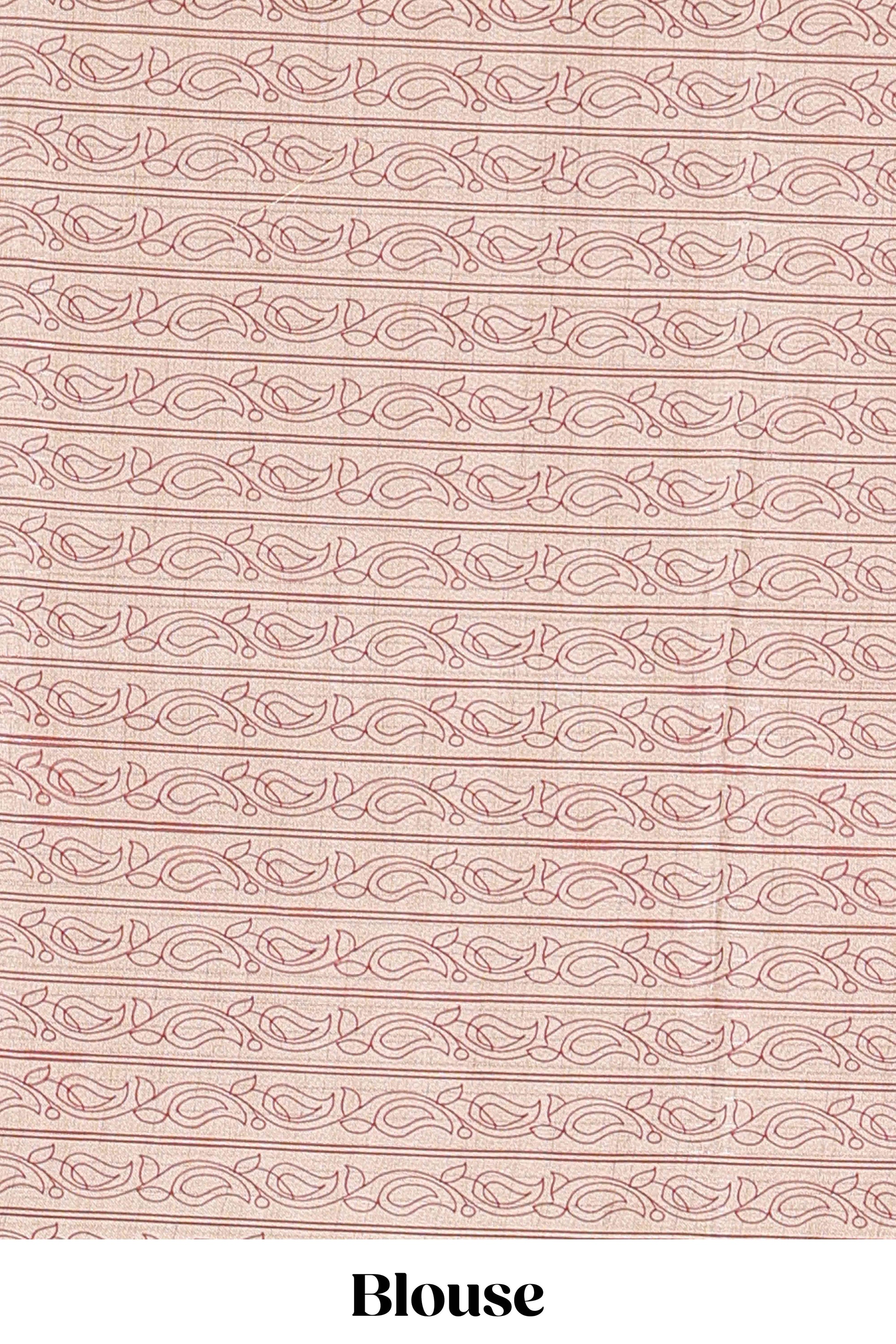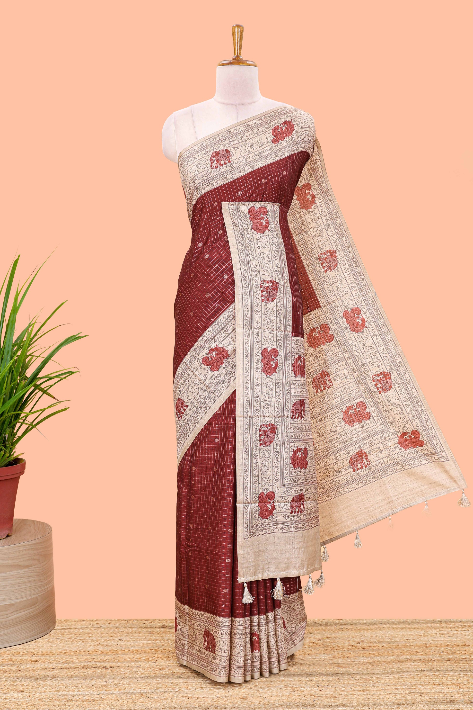 Maroon art tussar saree with zari check and butta weave, cream border and kalamkari elephant and peacock motif border and pallu