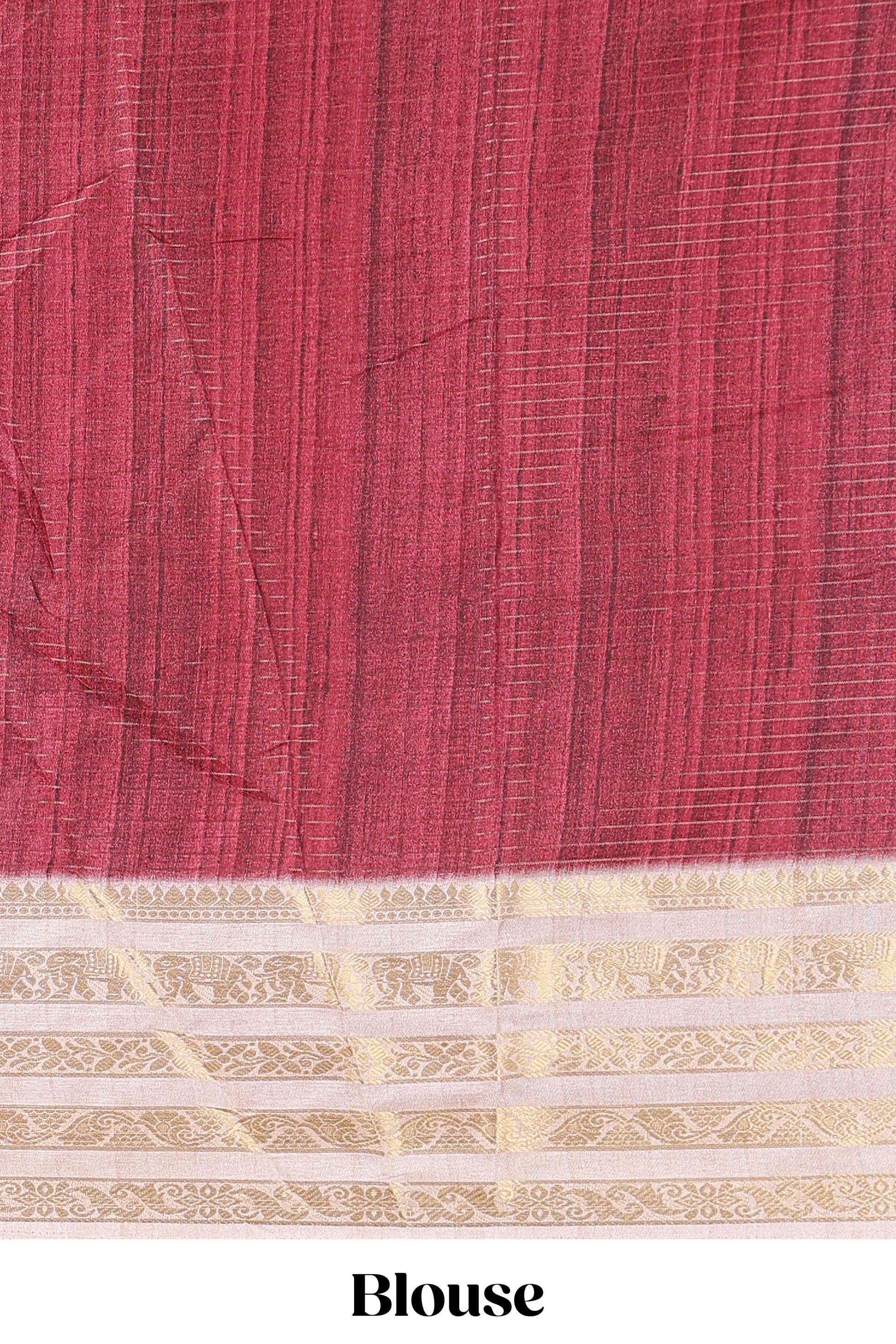 Maroon dola silk saree featuring monochrome fusion print and contrast zari border