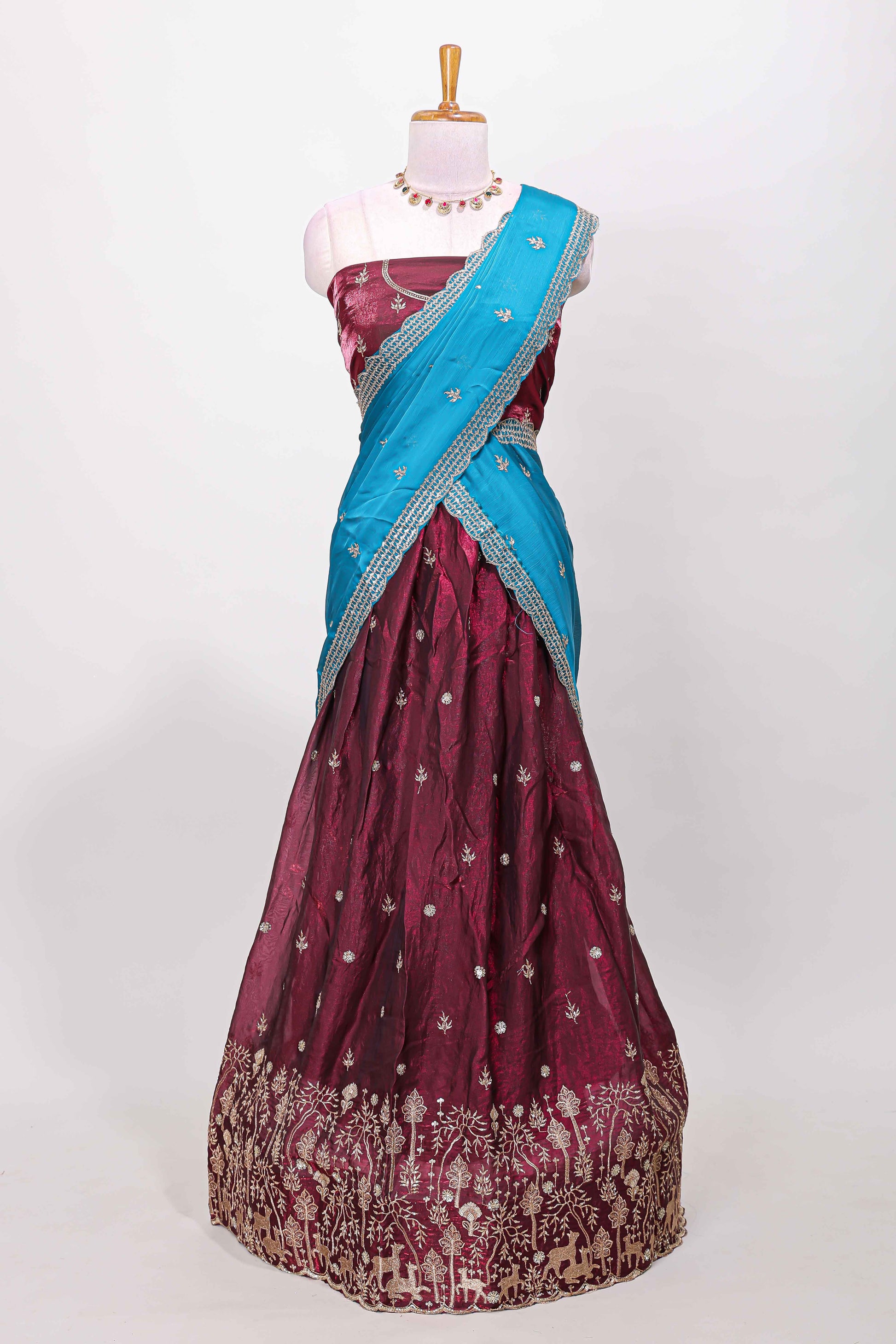 Maroon fendy chiffon lehenga with all over embroidery and stone work, paired with a contrast dhavani