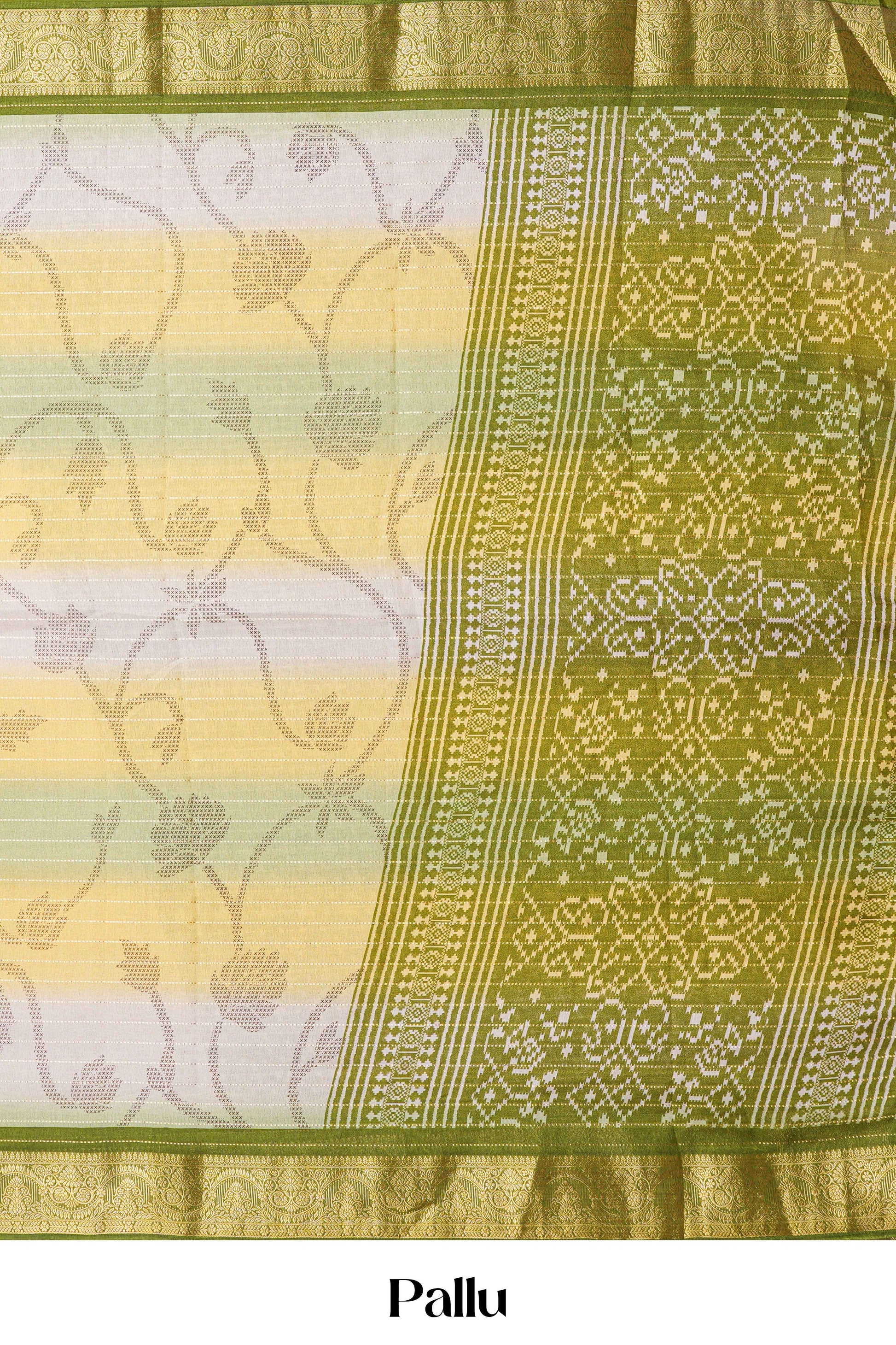Multi Color Marsh Mellow Saree Delicate Floral Vine Motifs With Zari Stripes Weaving Across The Body .Rich Green Jacquard Border & Contrast Floral Design Pallu Along With Butta Design Blouse