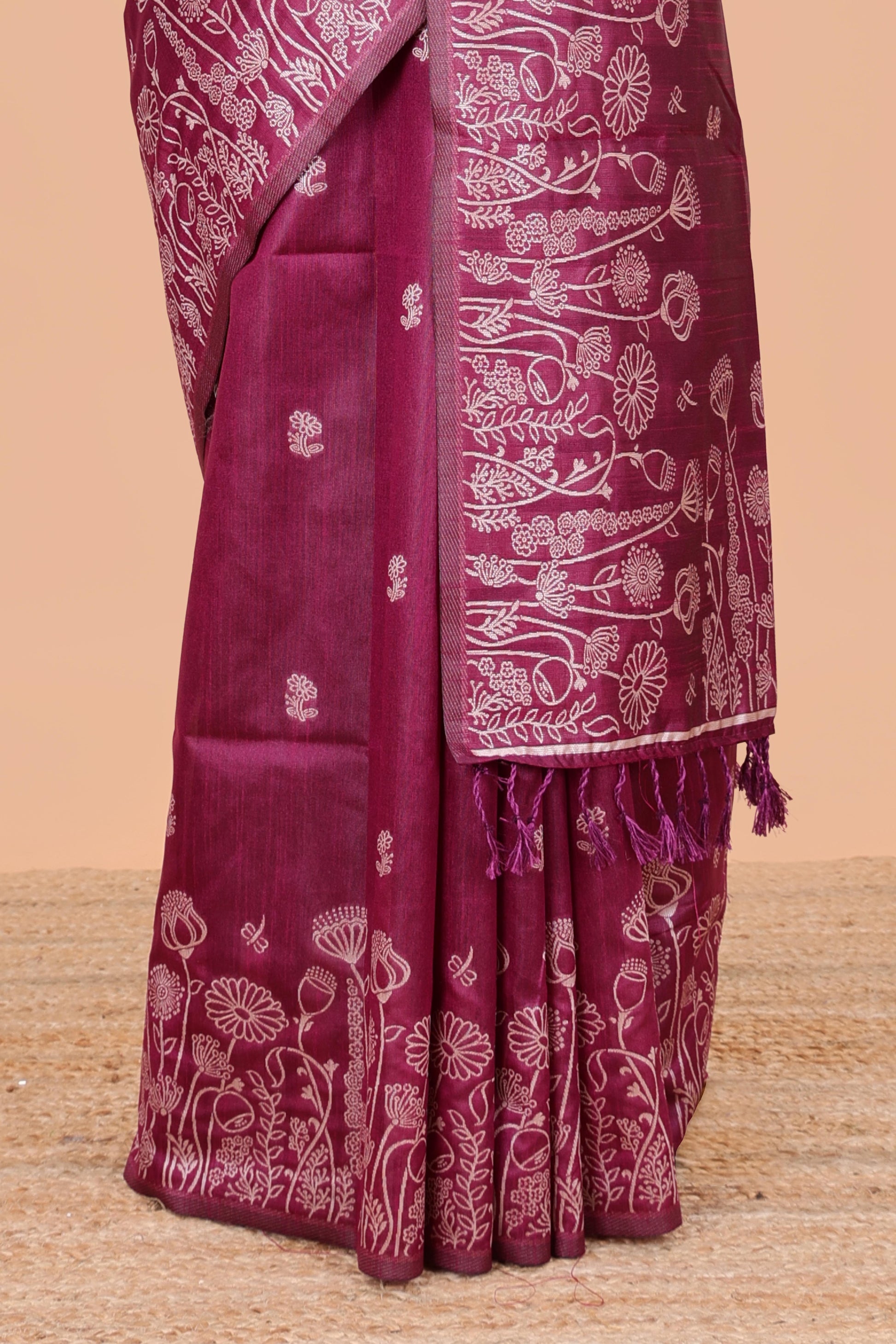 Mejanda munga cotton saree with all-over floral thread weaving & motif border