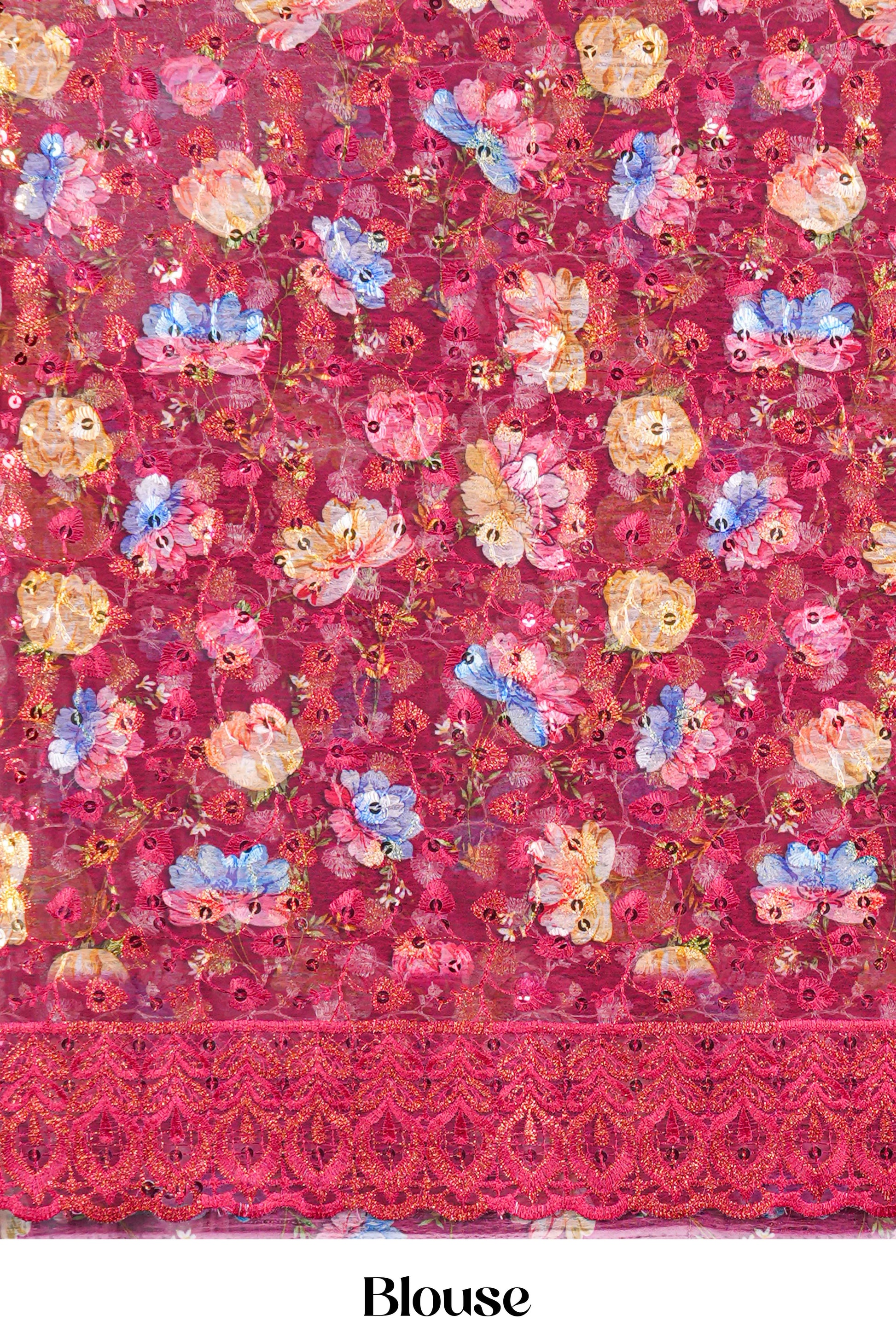 Red Moss Chiffon Saree Body Detailing Foil Print Along With Floral Print Blouse