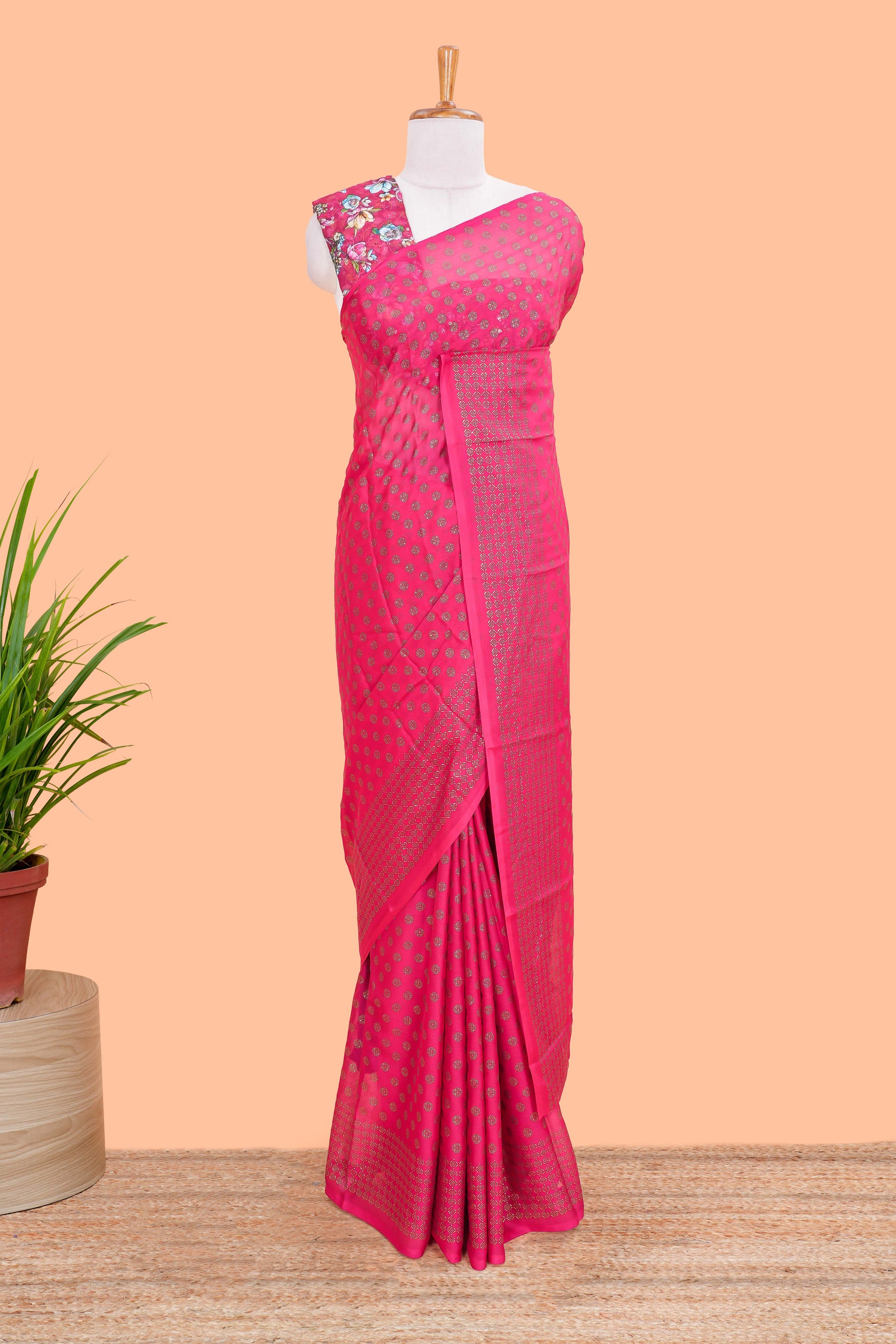 Red Moss Chiffon Saree All Over Foil Printed Along With Floral Design Blouse