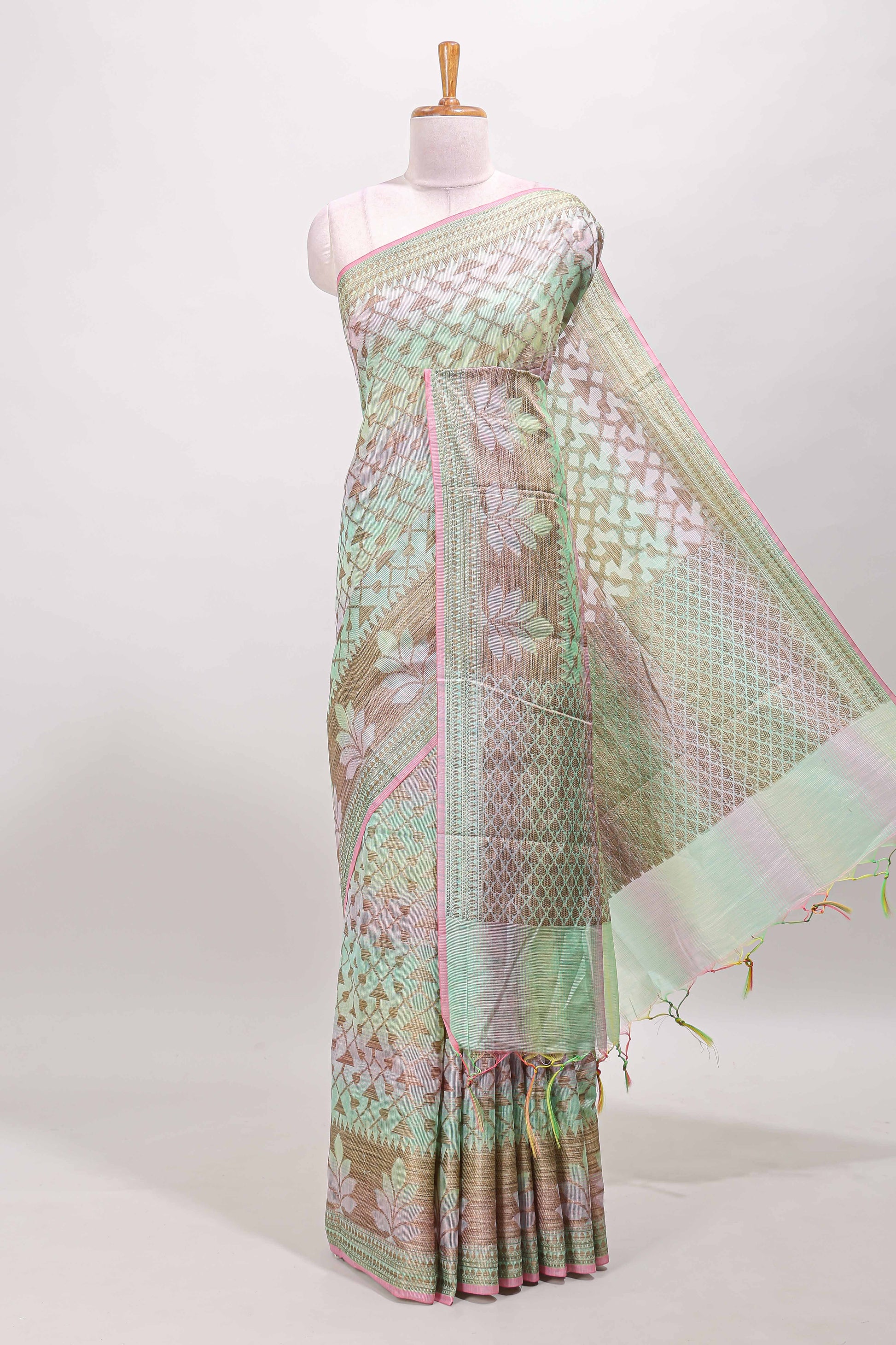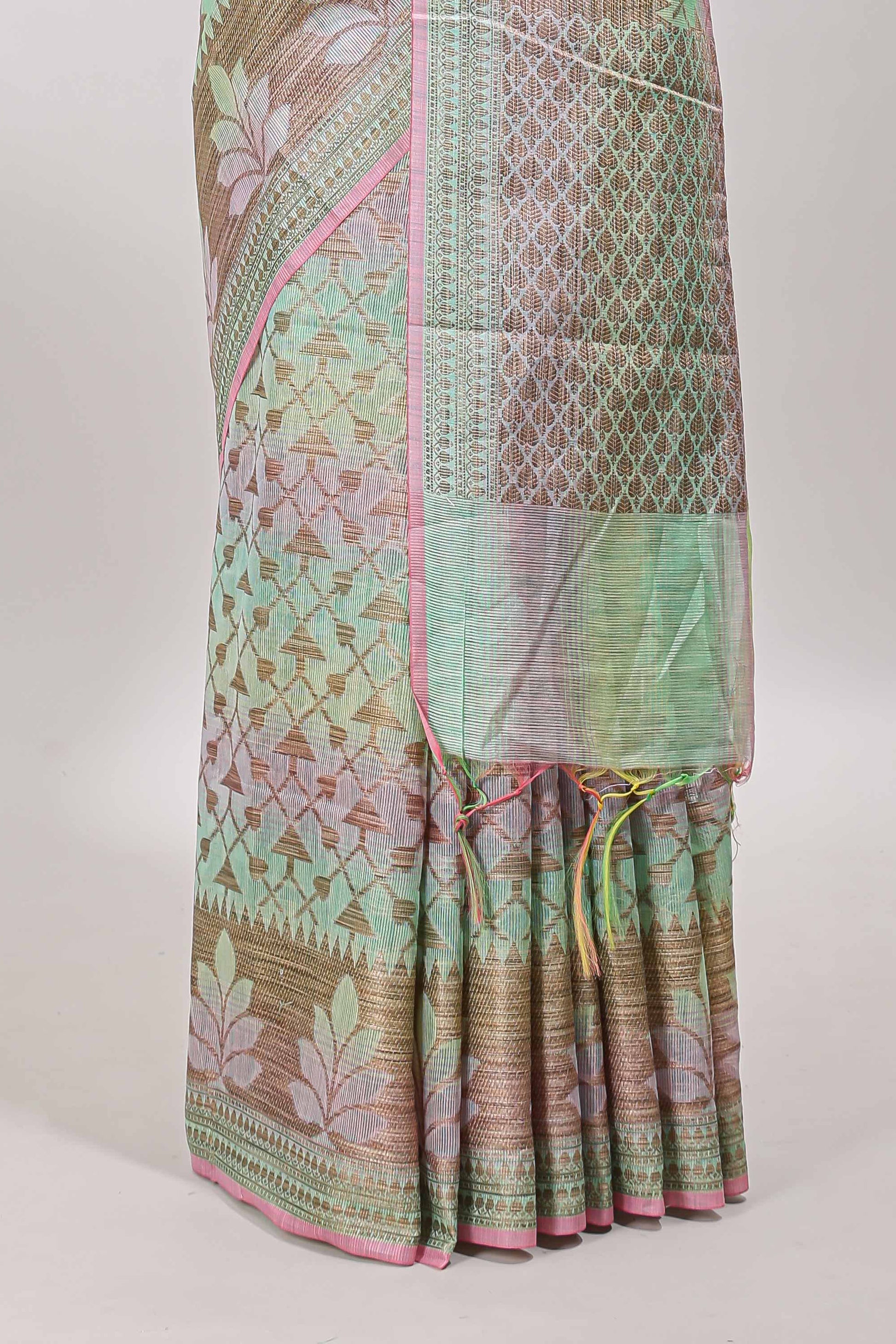 Multi color geometric pattern kota cotton saree with floral zari border and jacquard design blouse