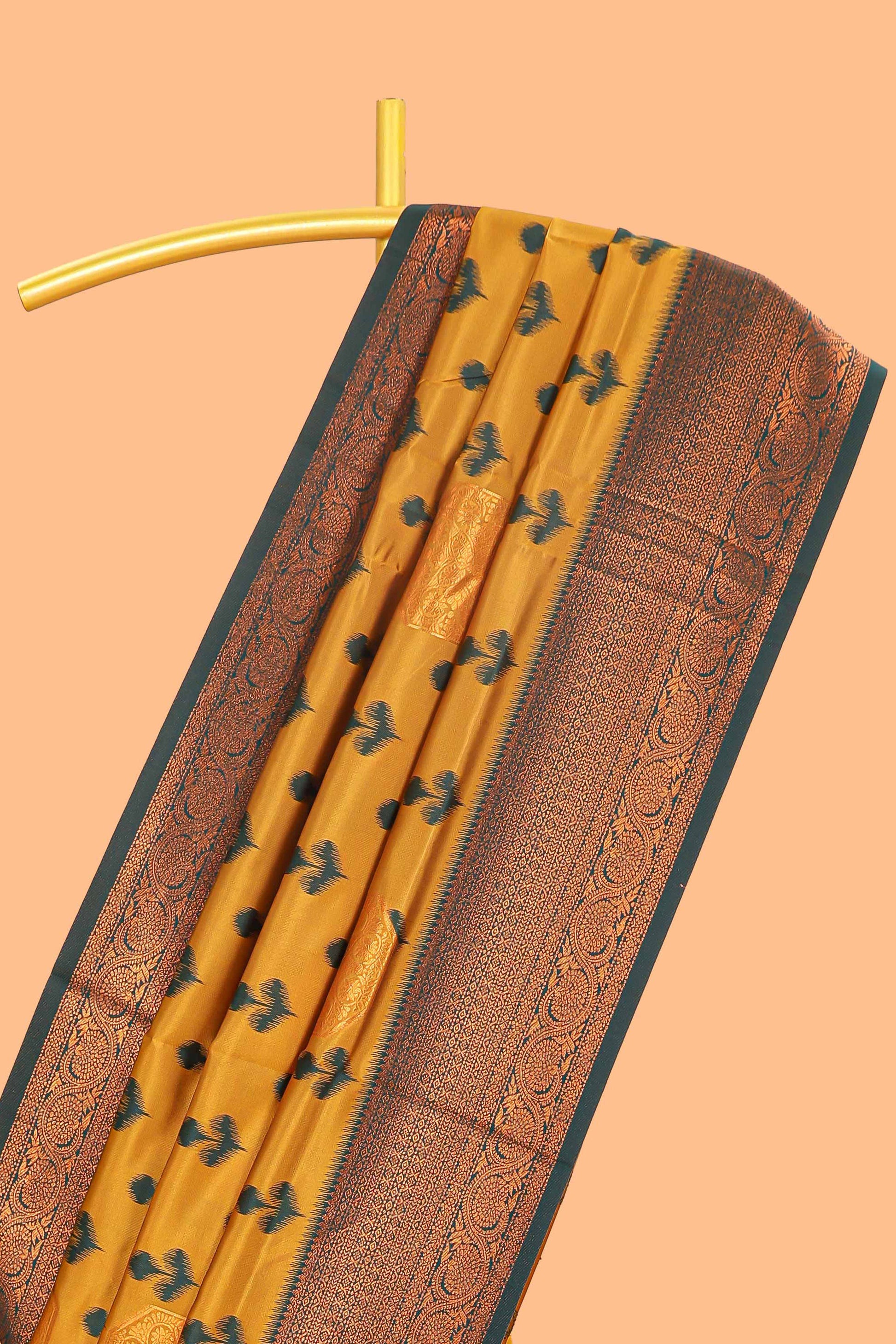 Mustard floral design zari motifs litchi silk saree with contrast zari border and blouse