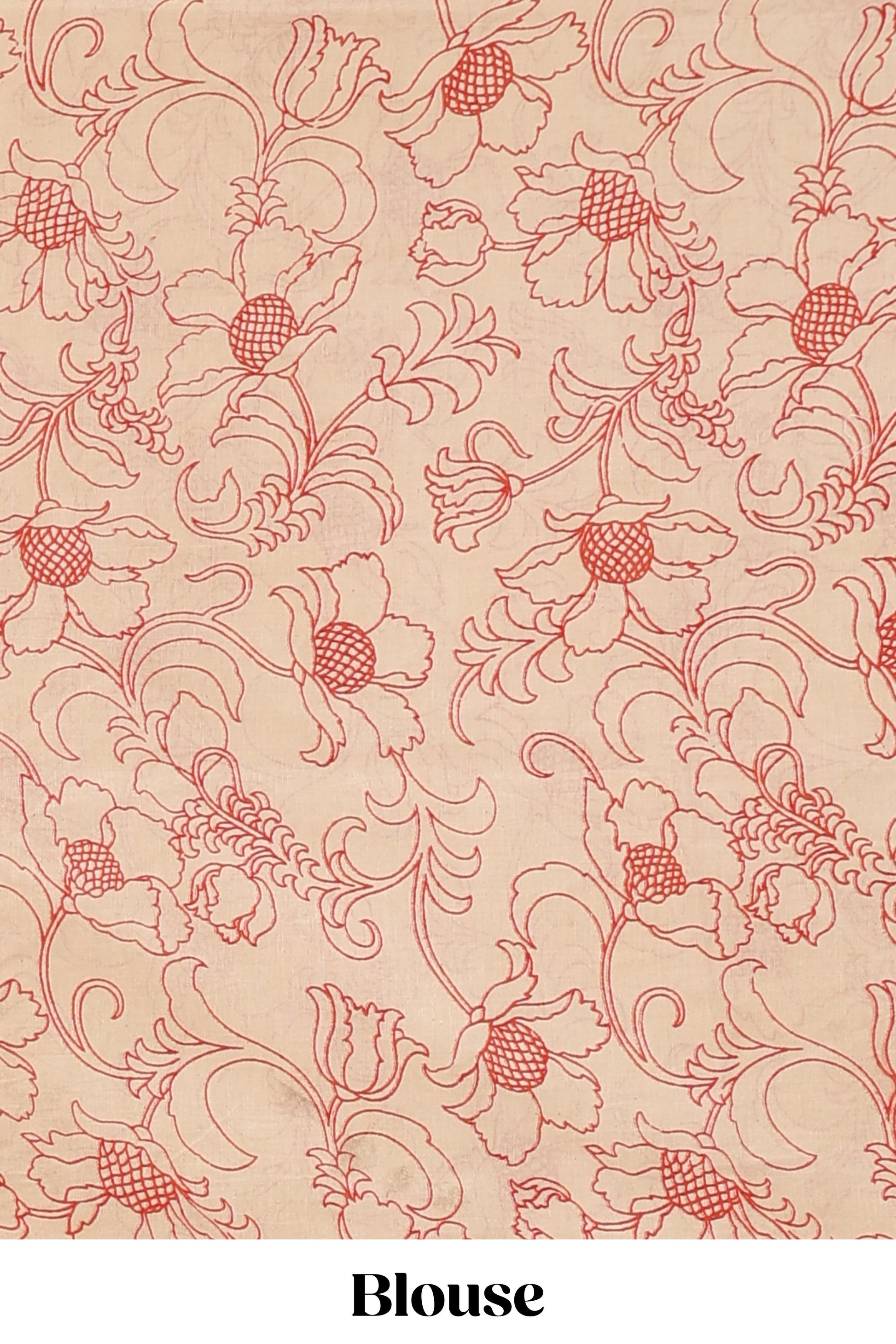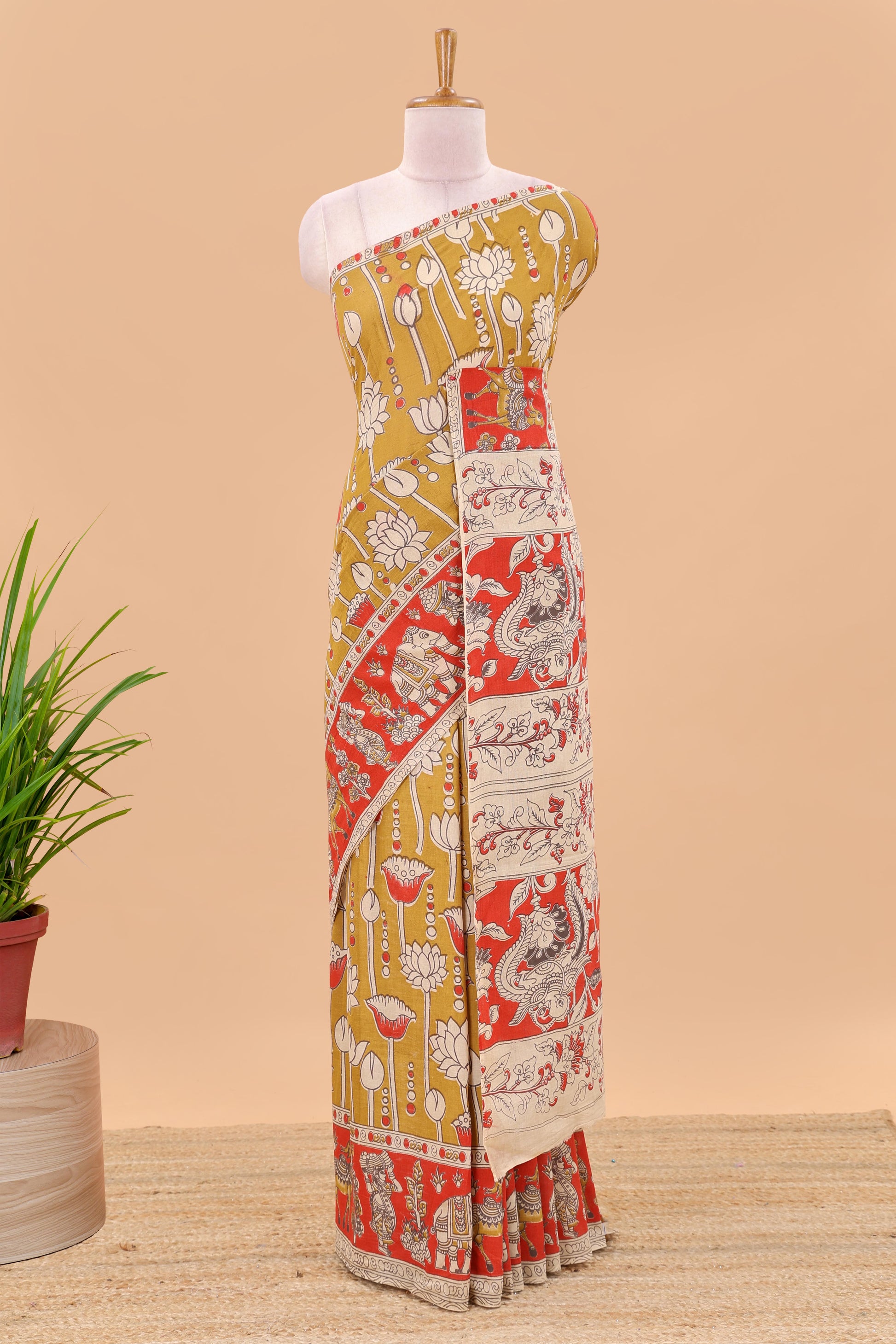 Mustard kalamkari printed cotton saree with traditional floral motifs and contrast pallu