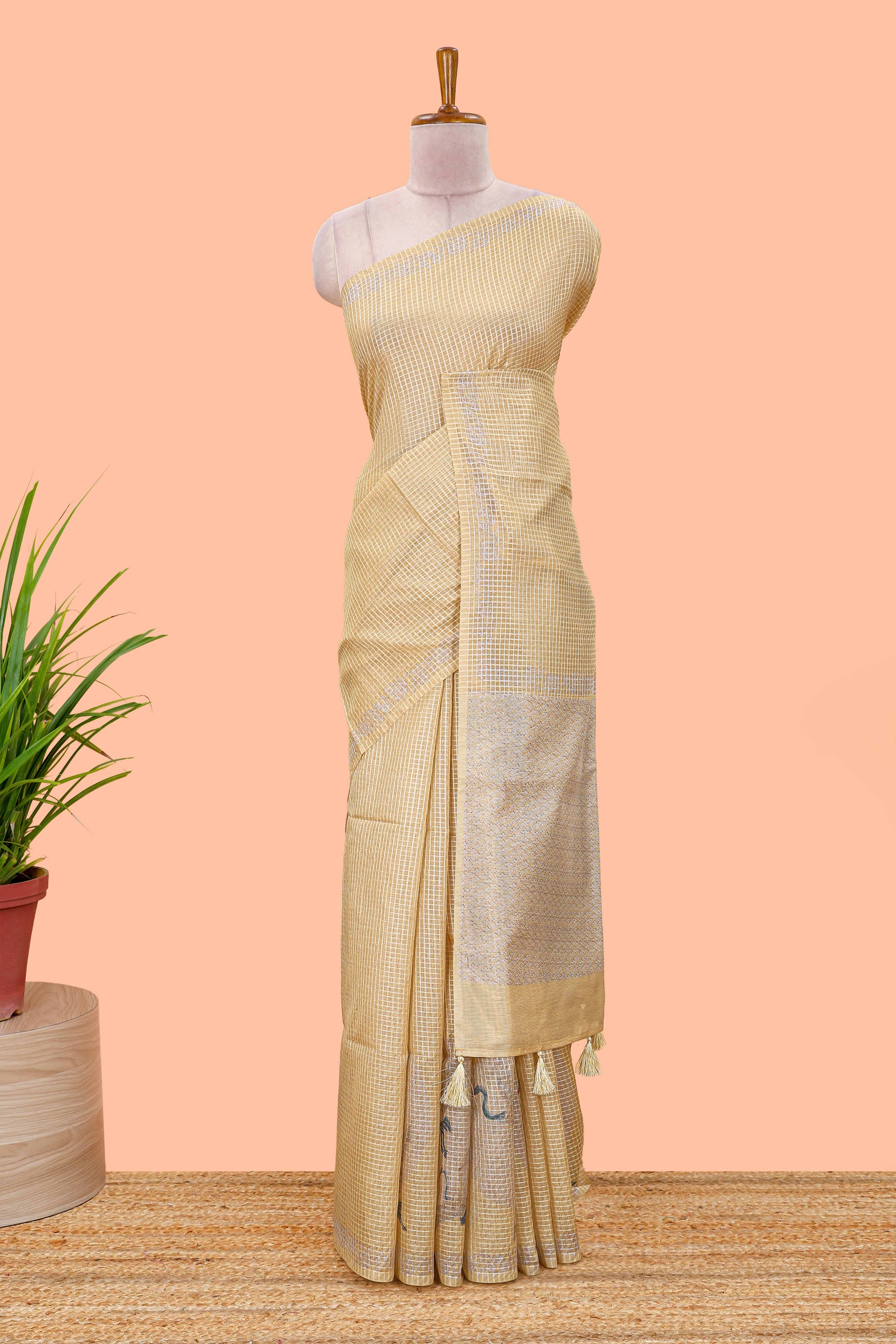 Mustard kota cotton saree featuring crane bird motif print and contrast pallu