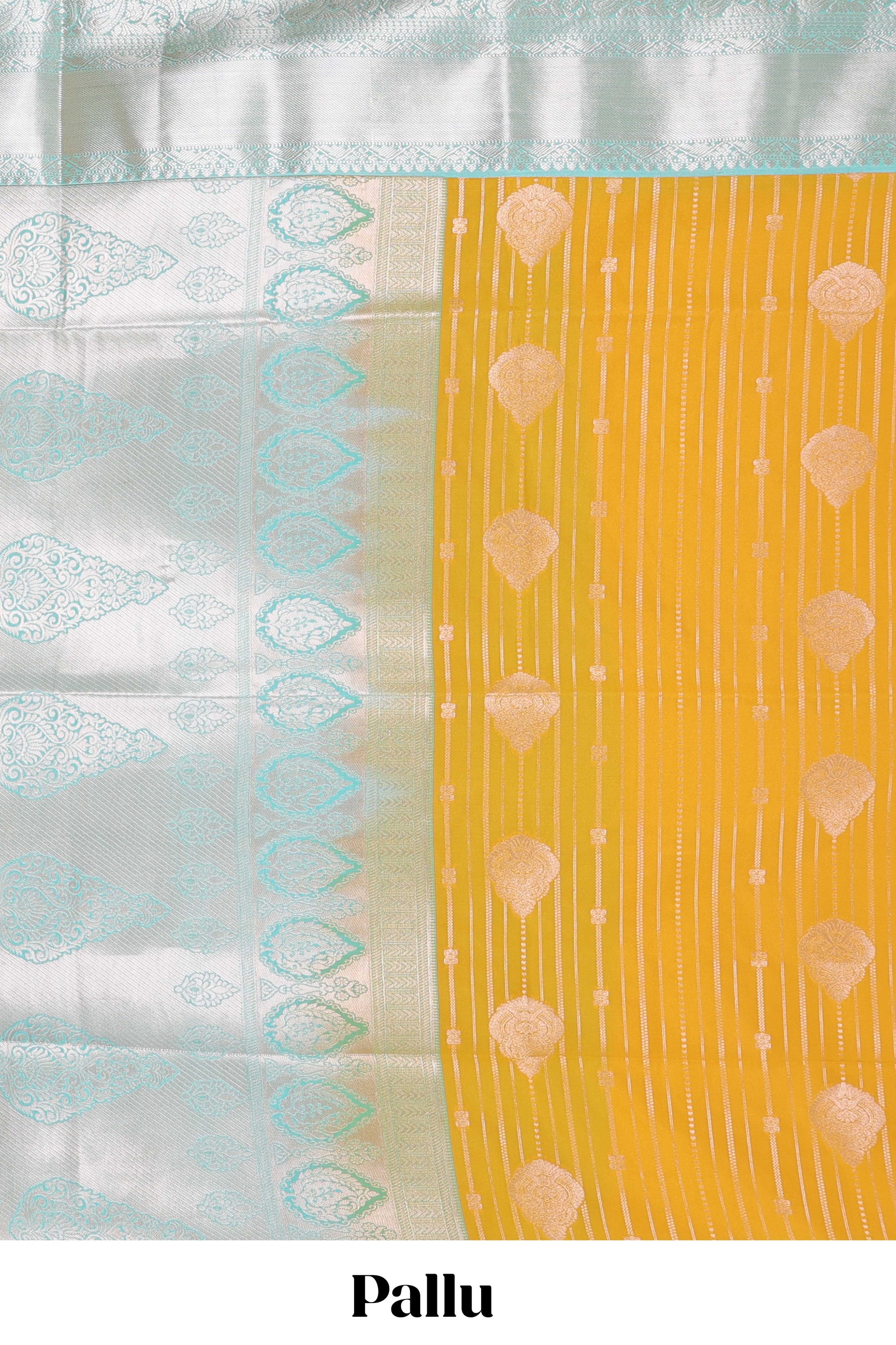 Mustard semi soft silk banarasi style saree with gold zari stripes and contrast border