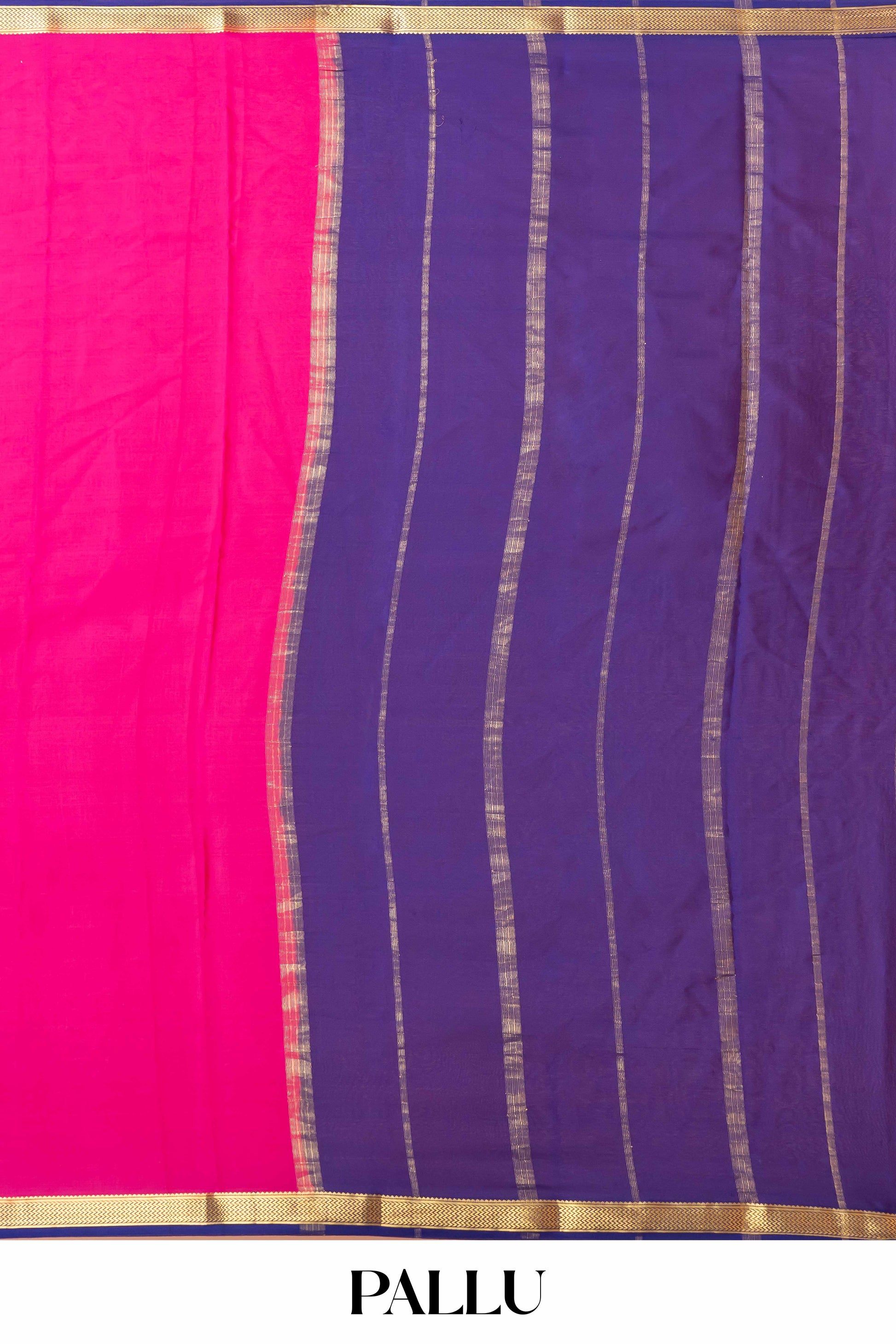 Vibrant Rani Pink Pure Mysore Silk Saree with Contrasting Blue-Gold Zari Border & Elegant Striped Blue-Gold Pallu