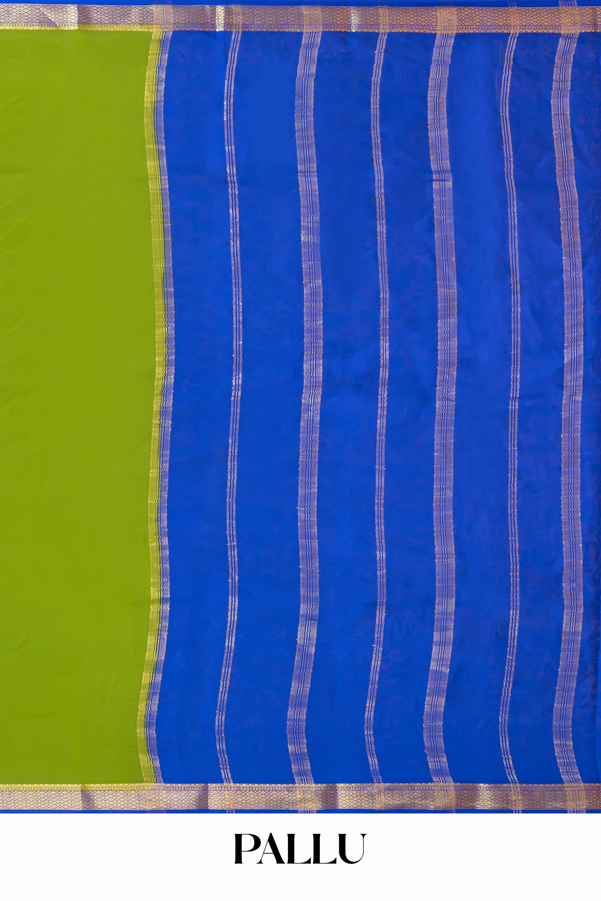 Graceful Olive Green Pure Mysore Silk Saree with Contrasting Blue-Silver Zari Border & Classic Striped Blue Pallu