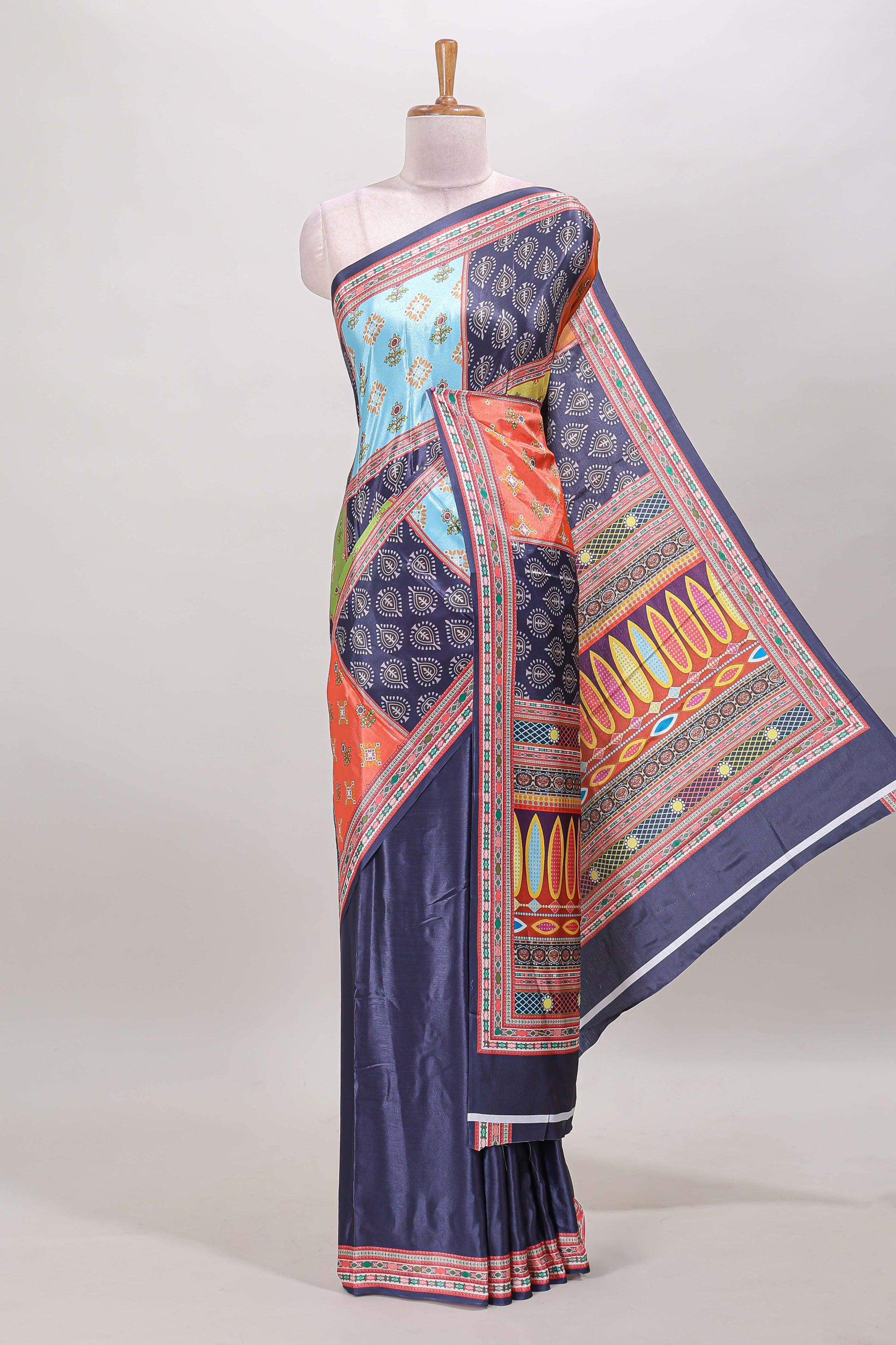Navy blue geometric pattern & floral design masakali saree with self border and matching blouse