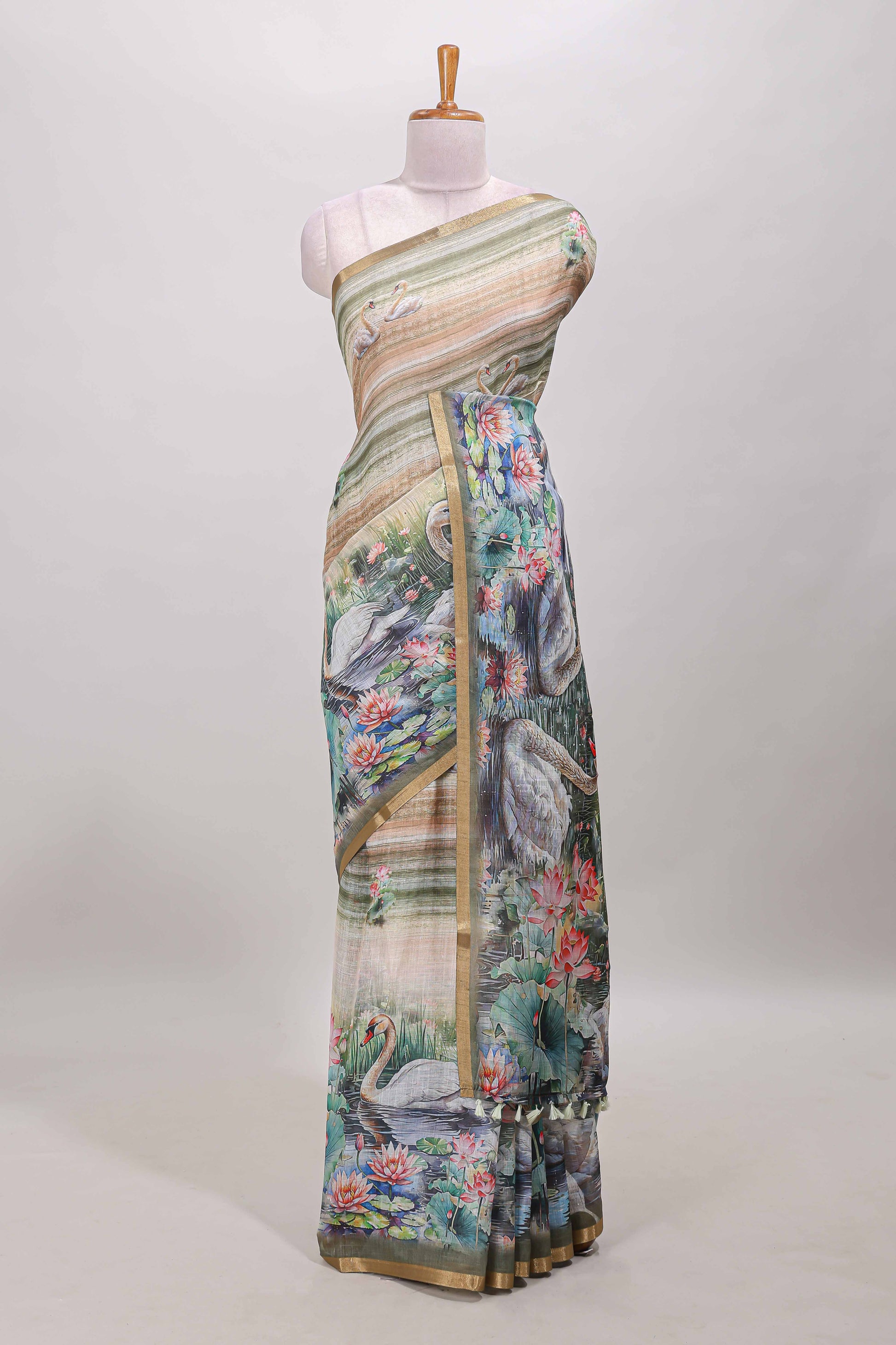 Olive green linen cotton saree with swan & lotus pond print, self zari border and matching printed pallu