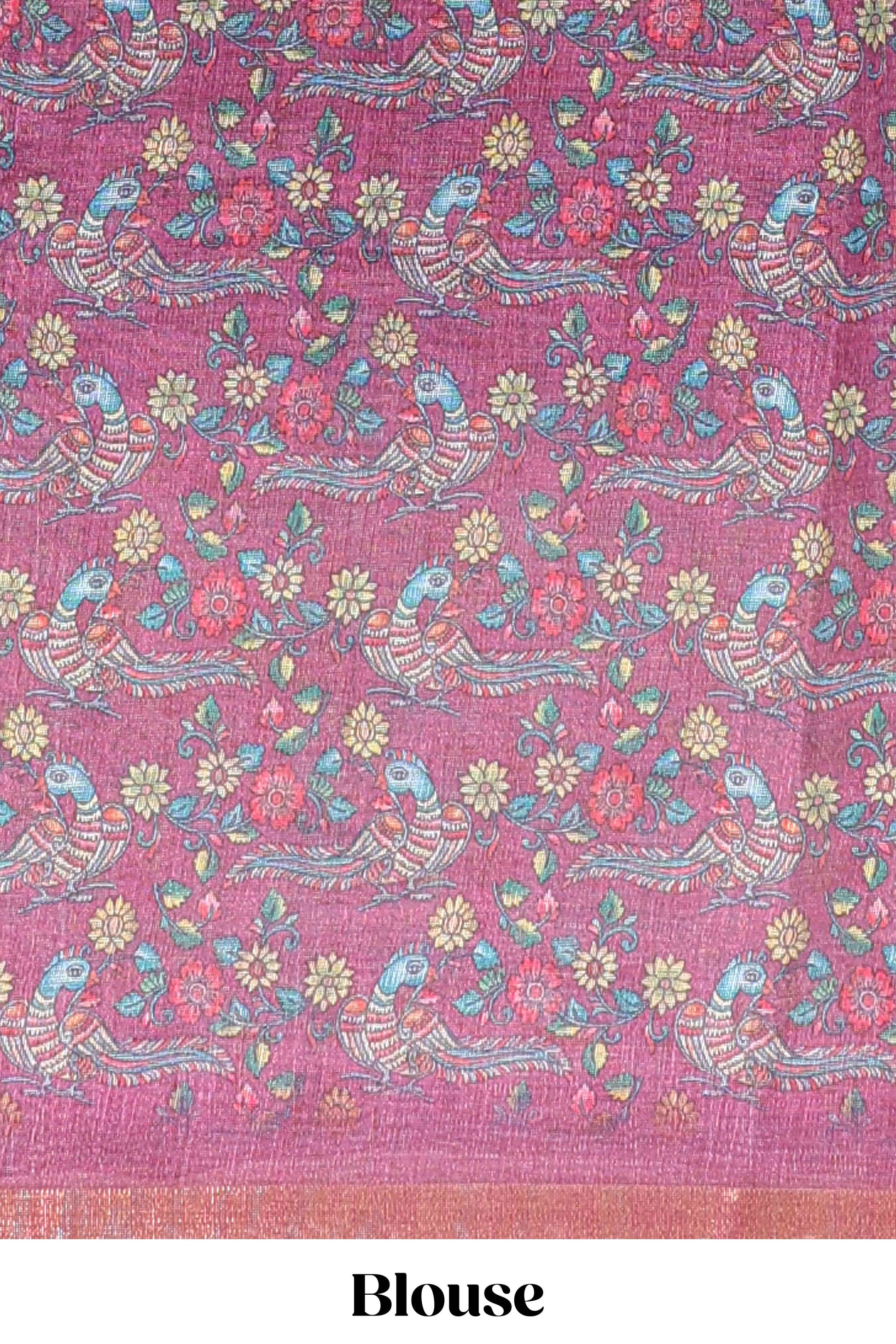 Onion pink checked linen cotton saree with bottom floral and birds design, self zari border and printed blouse