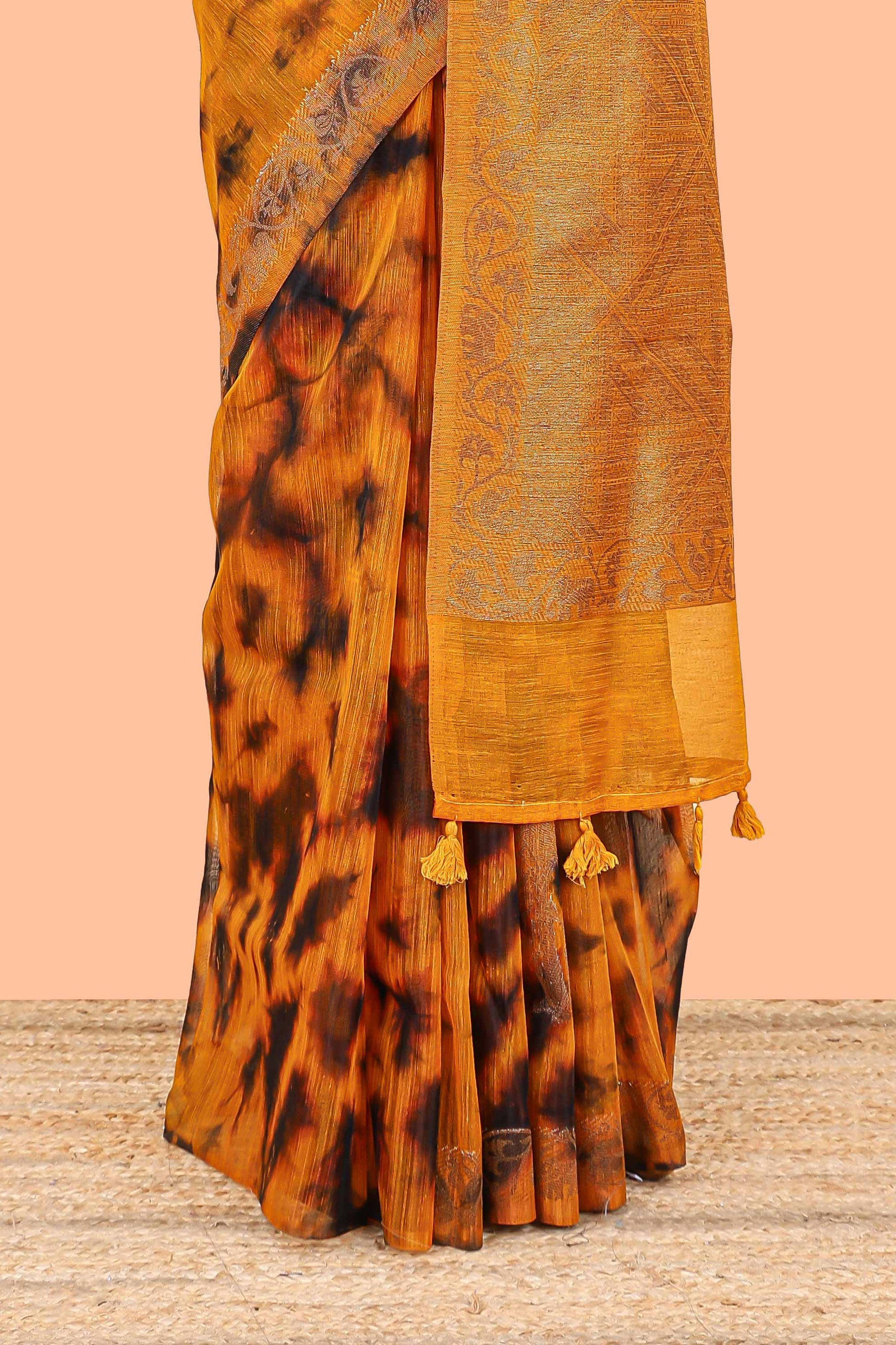 Orange and black tie and dye jute cotton saree with self zari border and blouse
