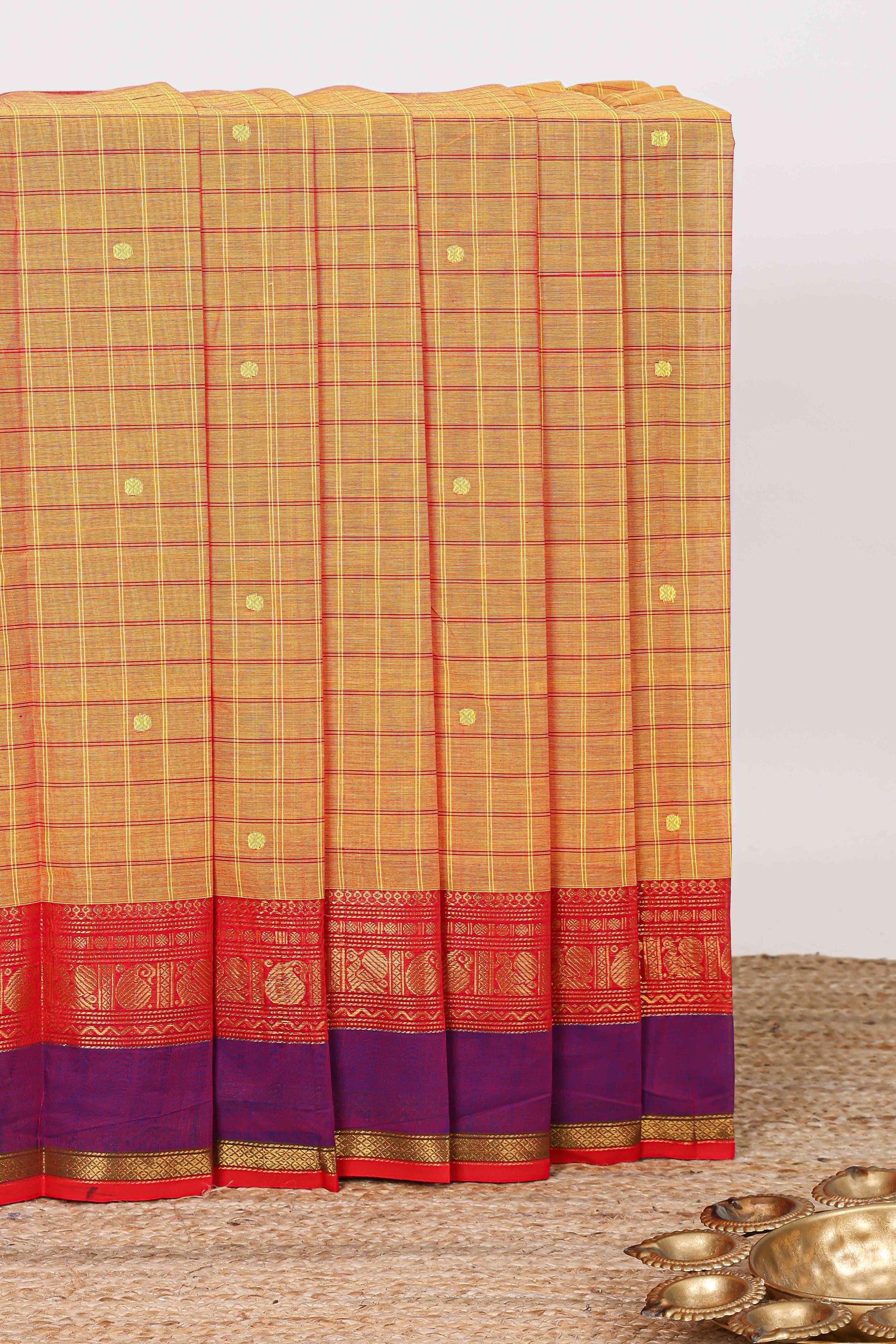Orange checked zari butta chettinad cotton saree with contrast zari border and striped pallu