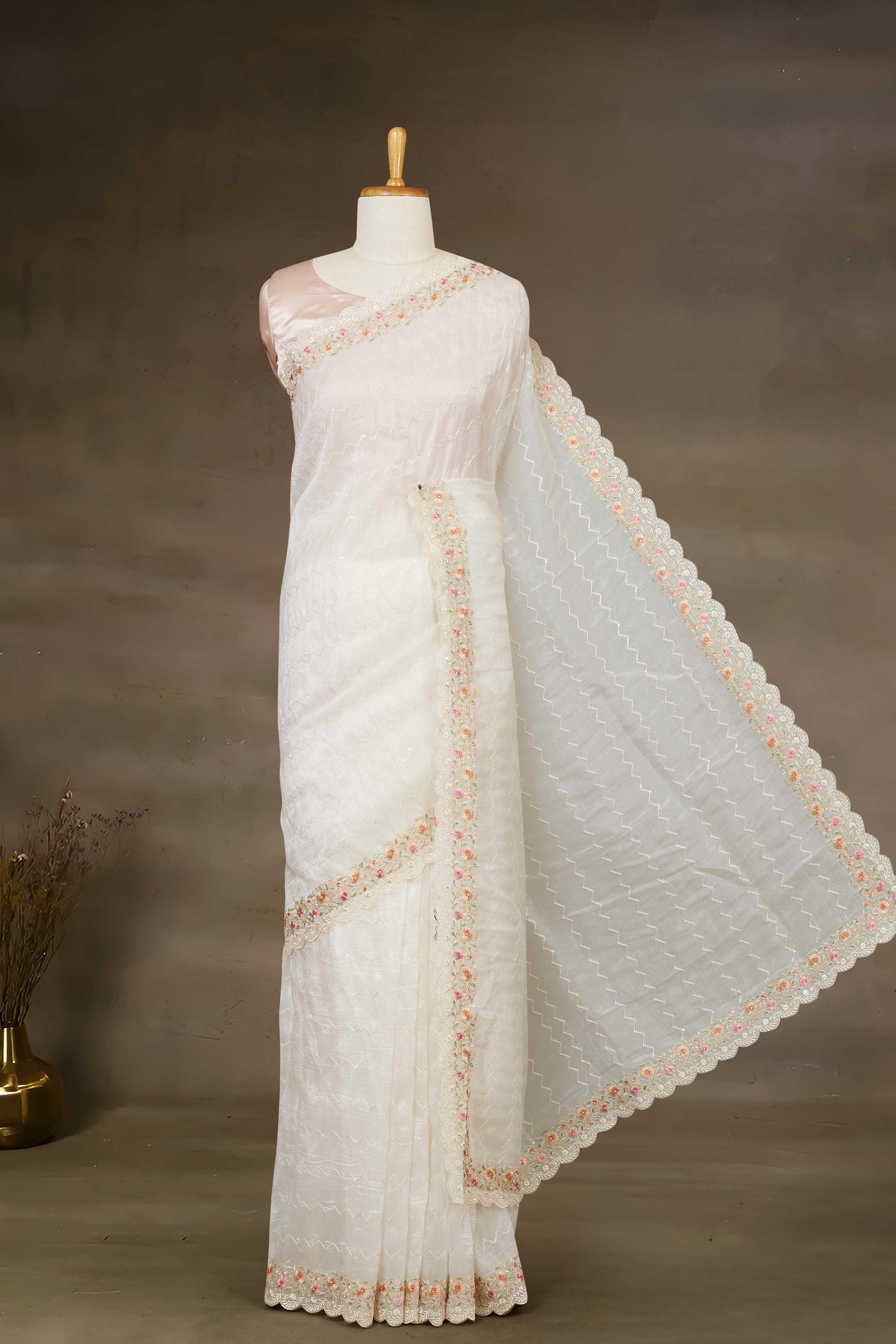 Organza White Colour Saree Embroidery
