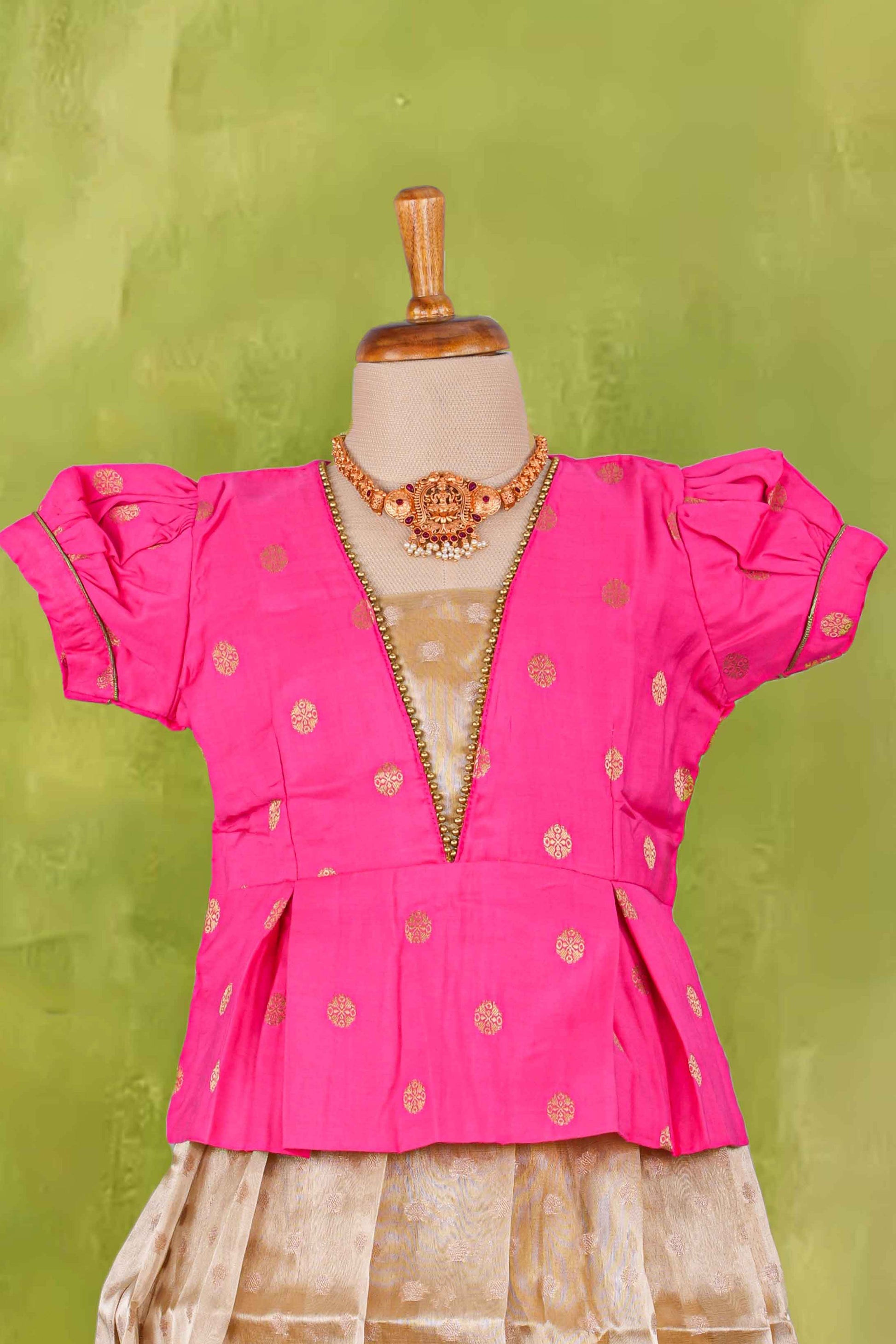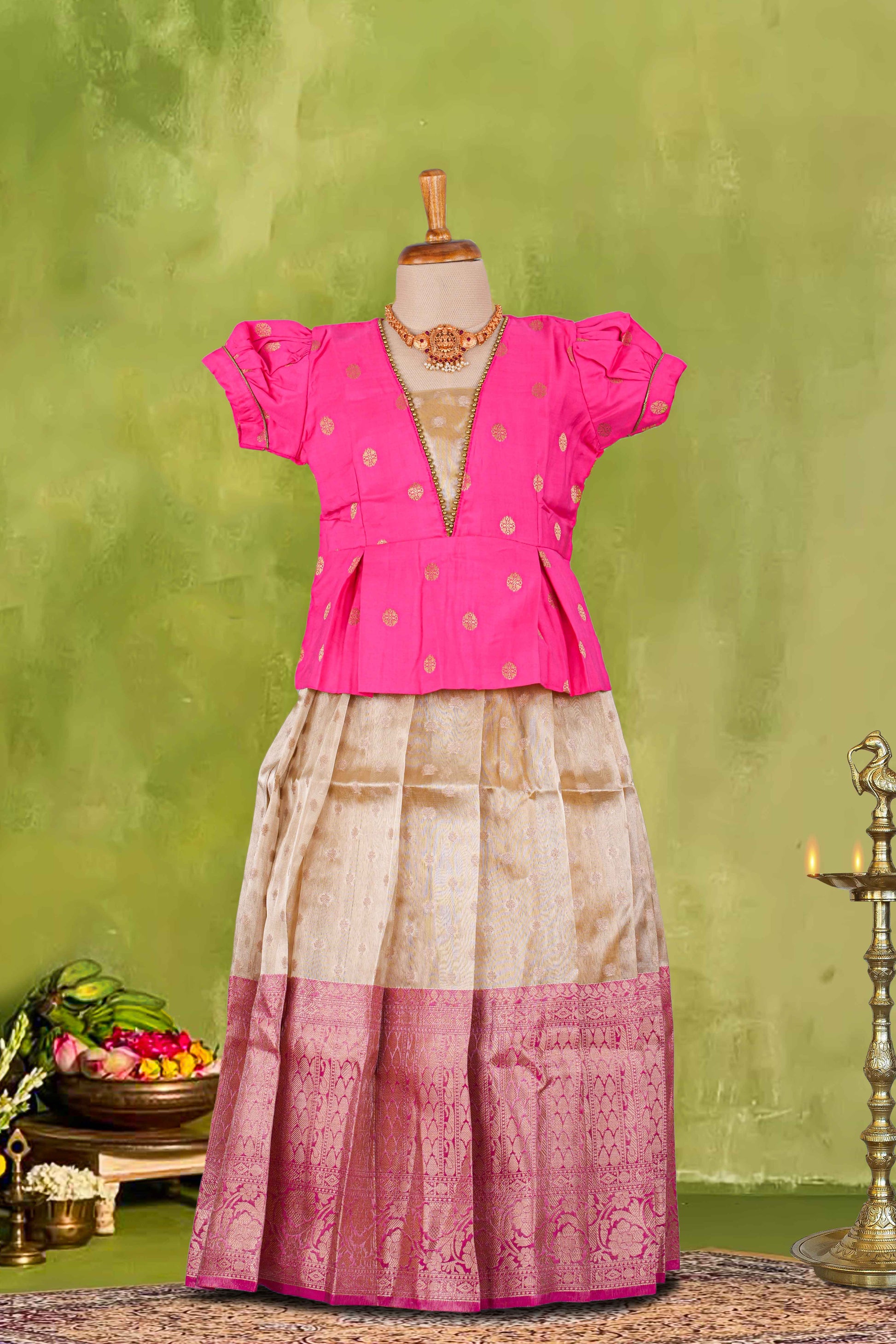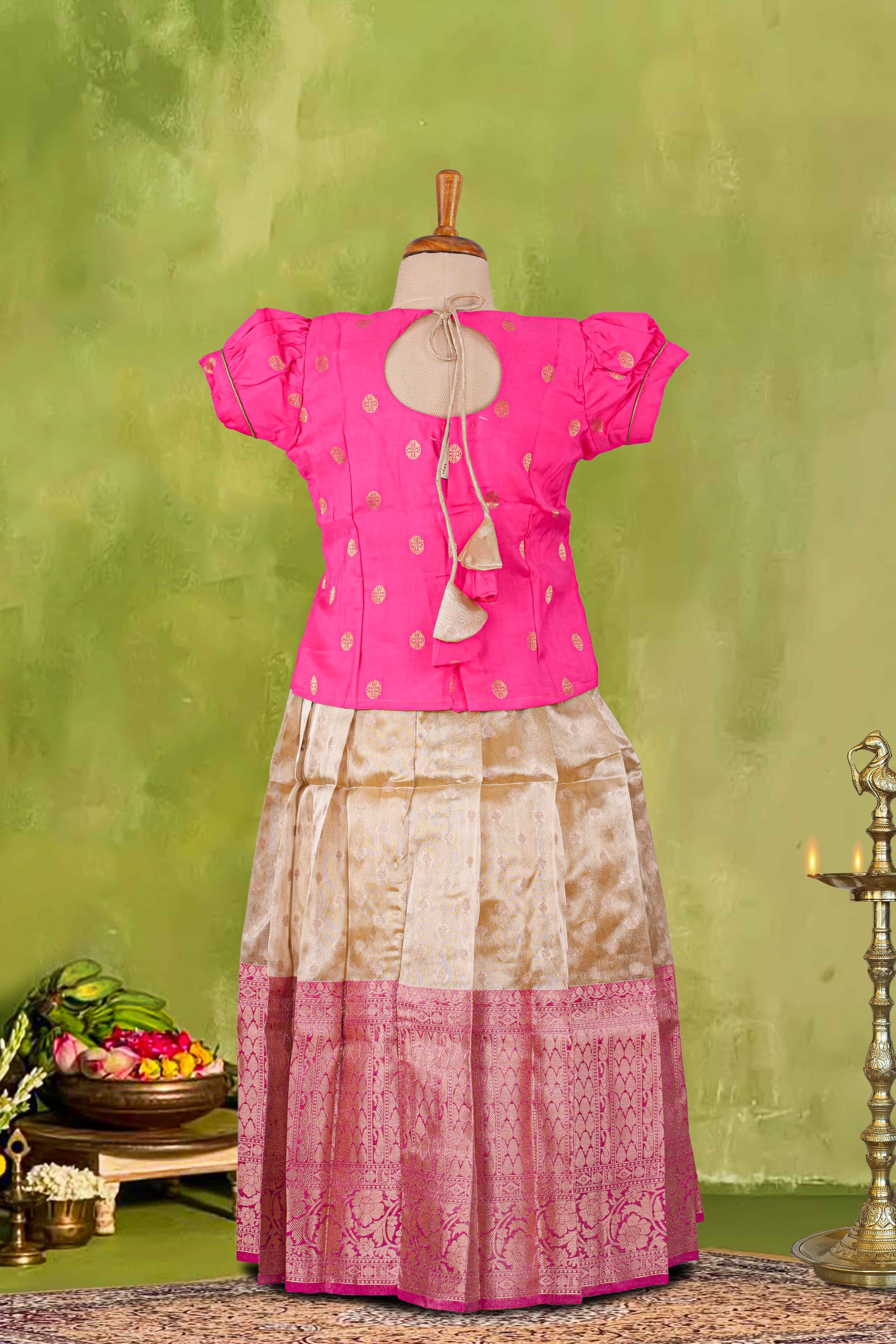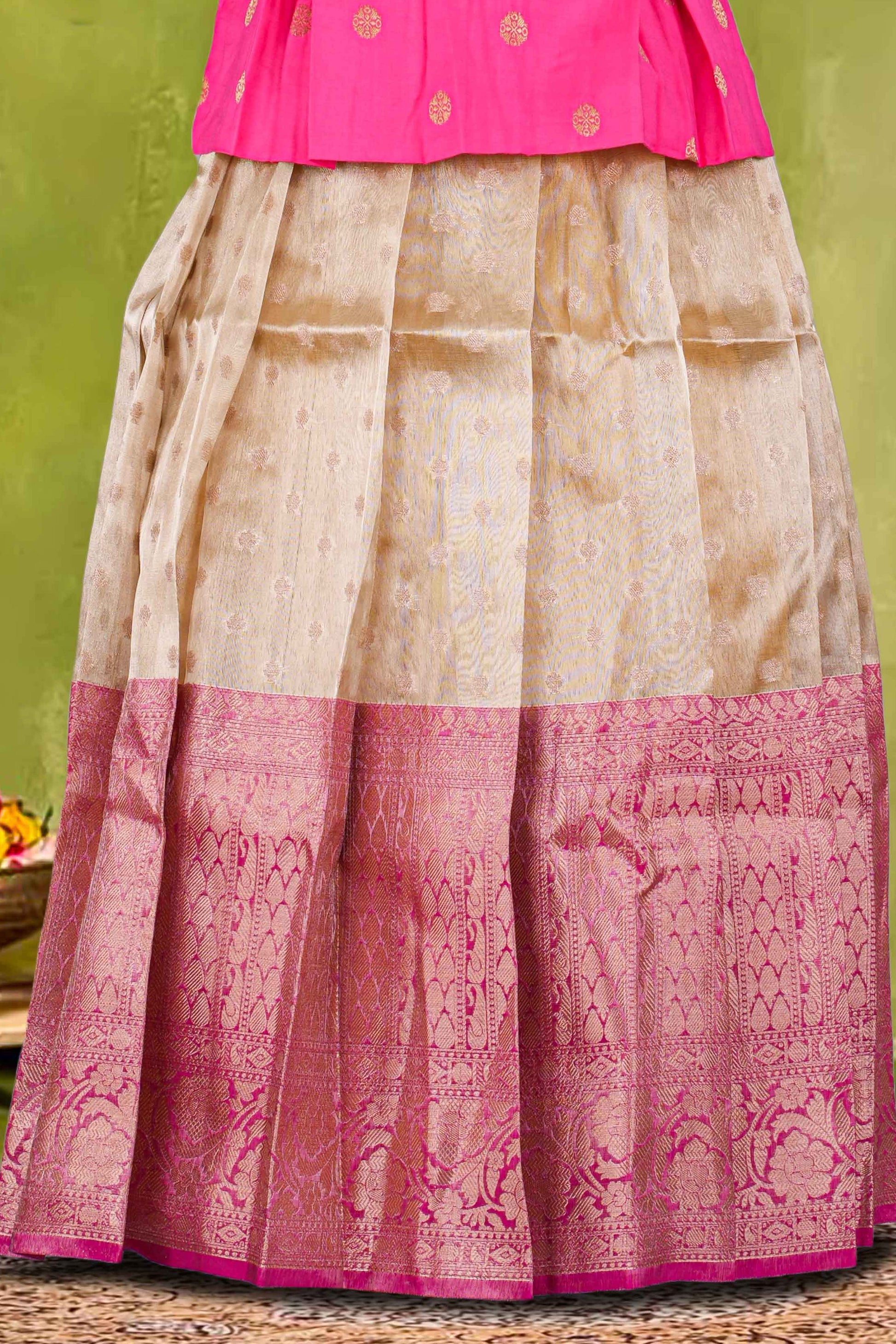 Pink Readymade Art Silk Pattu Pavadai Zari Design With Traditional Zari Border & Contrast Blouse
