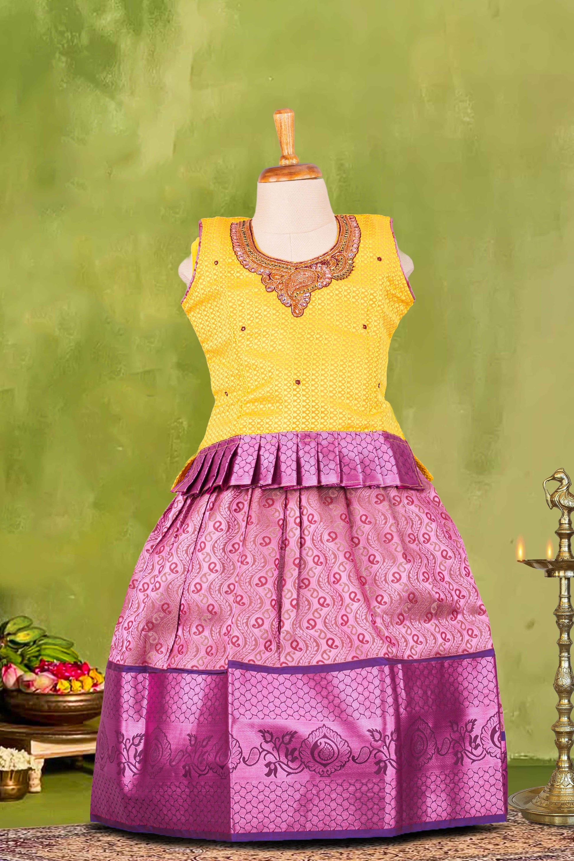 Yellow Readymade Art Silk Pattu Pavadai Zari Design With Traditional Zari Border & Embroidery Blouse