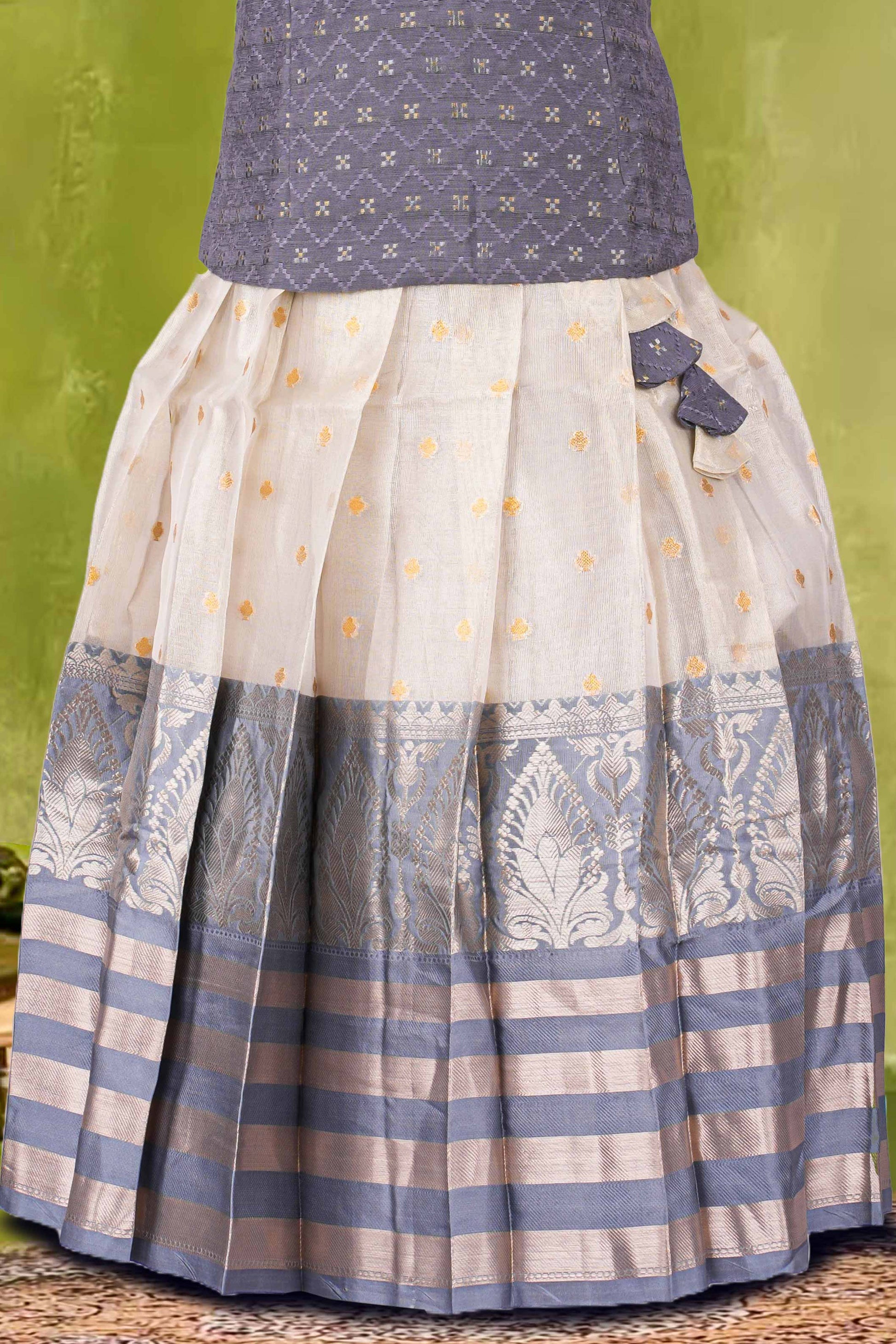 Readymade Art Silk Pattu Pavadai Zari Design With Traditional Zari Border & Contrast Blouse Neck Stone Embroidery