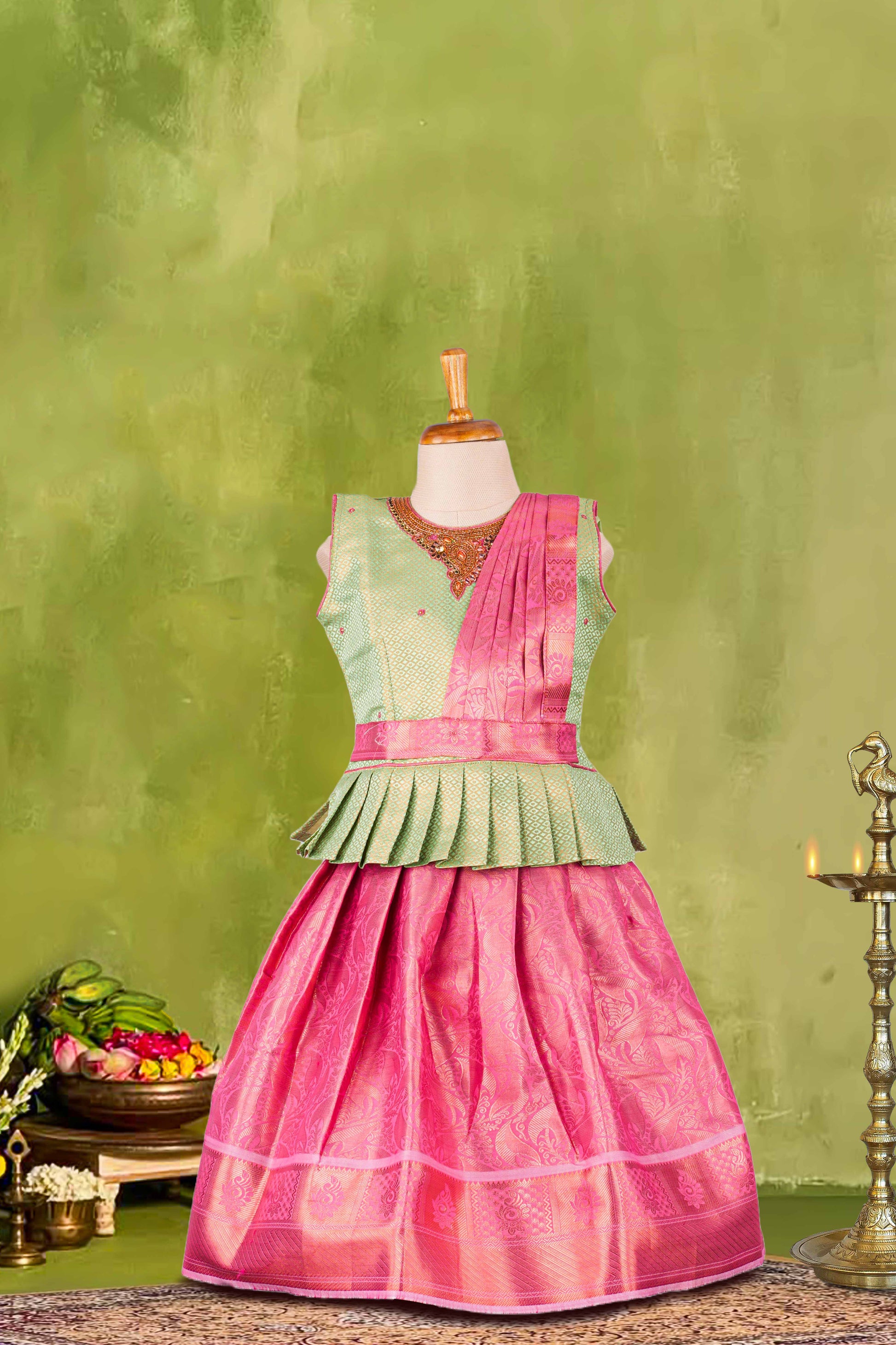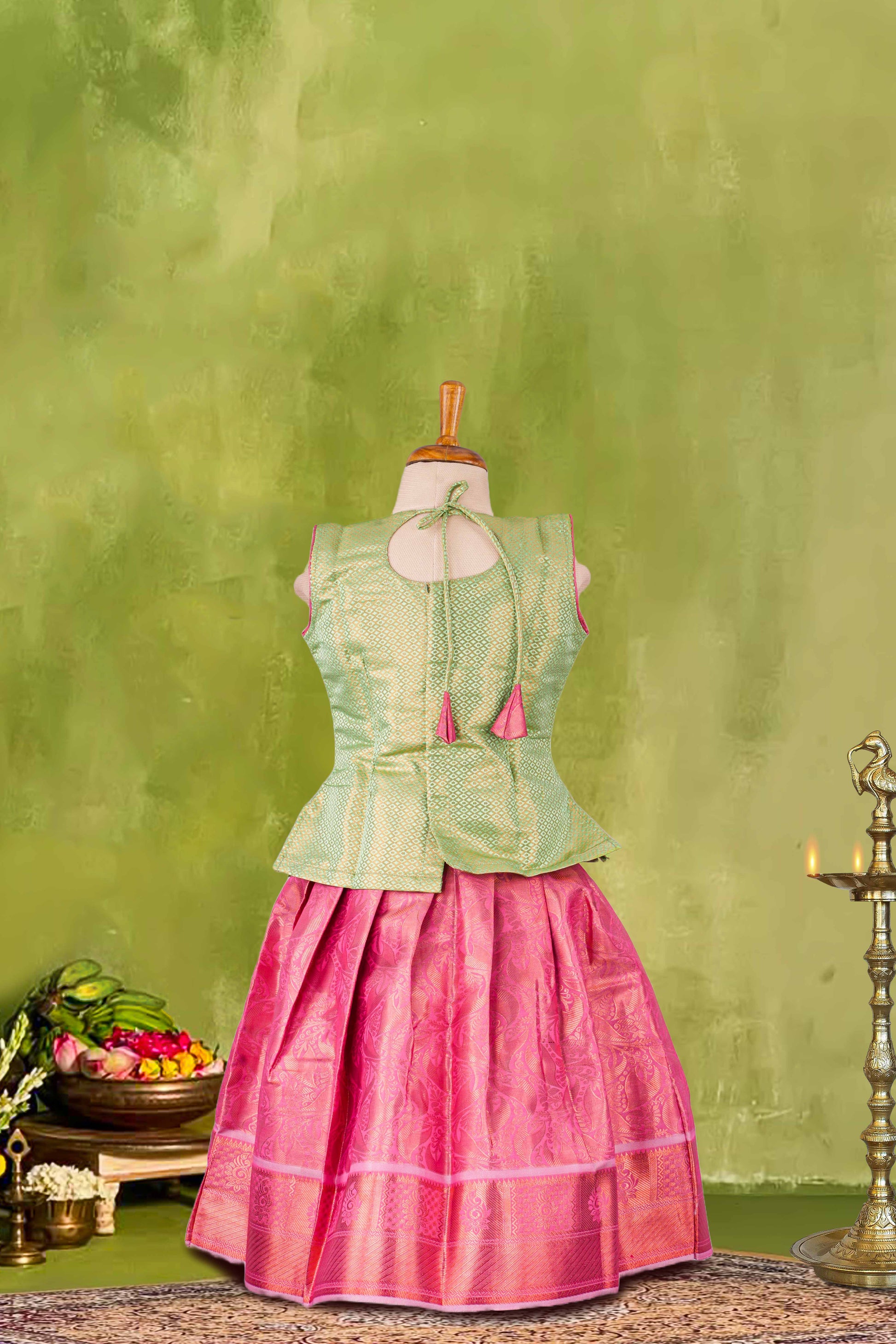 Readymade Art Silk Pattu Pavadai Zari Design With Traditional Zari Border & Contrast Aari Work Blouse