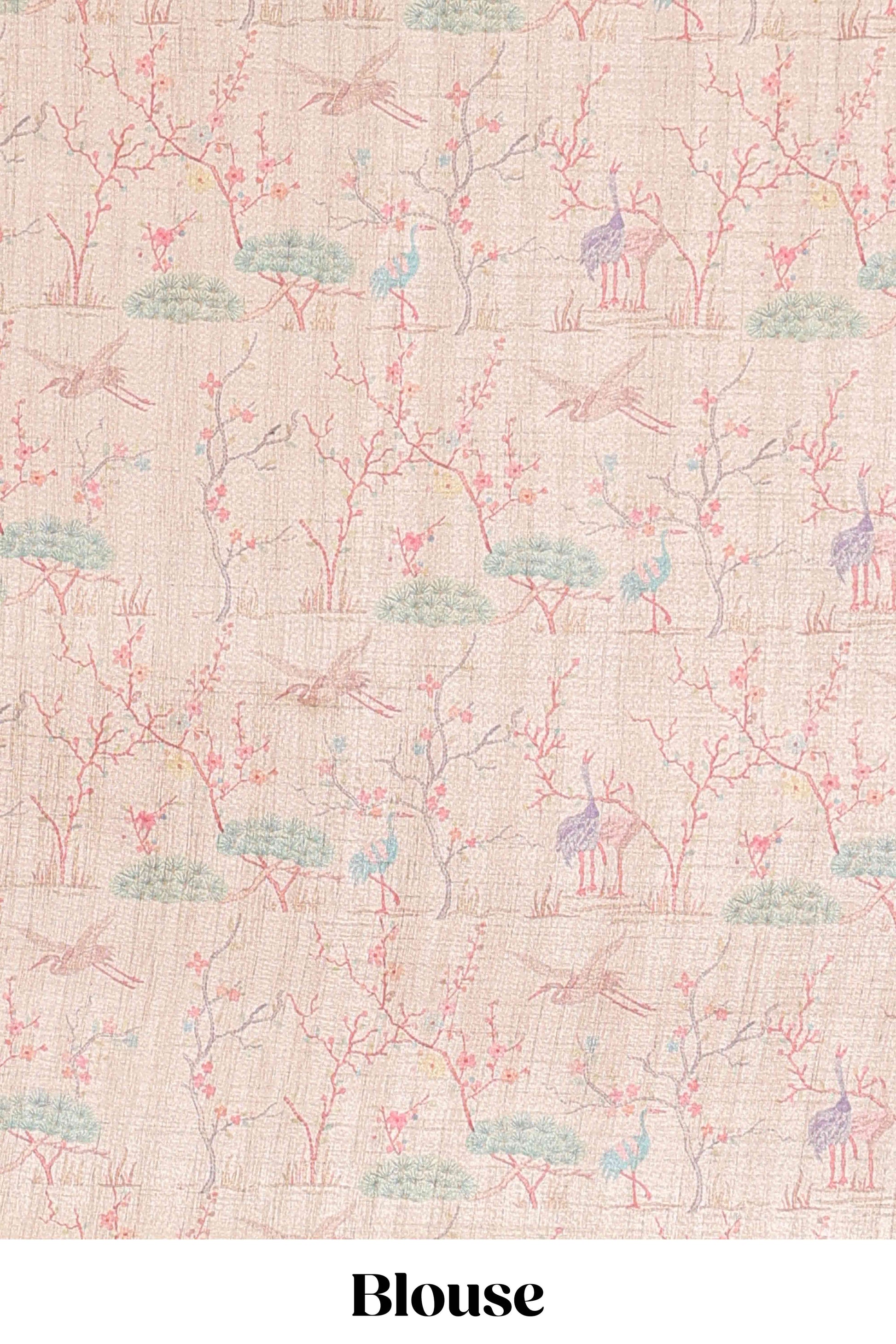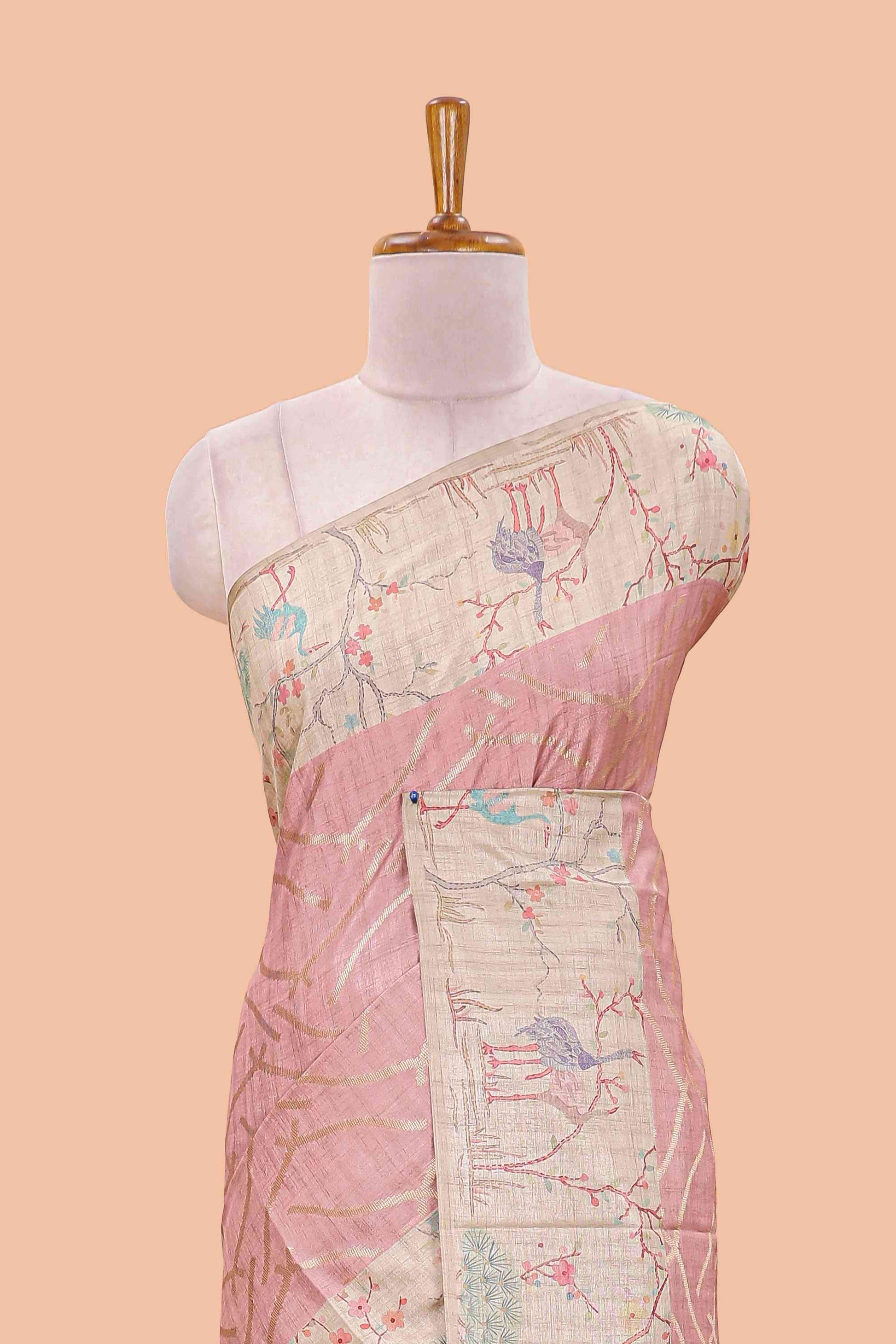 Peach art tussar saree with wave zari weaving body and cream nature print border & pallu