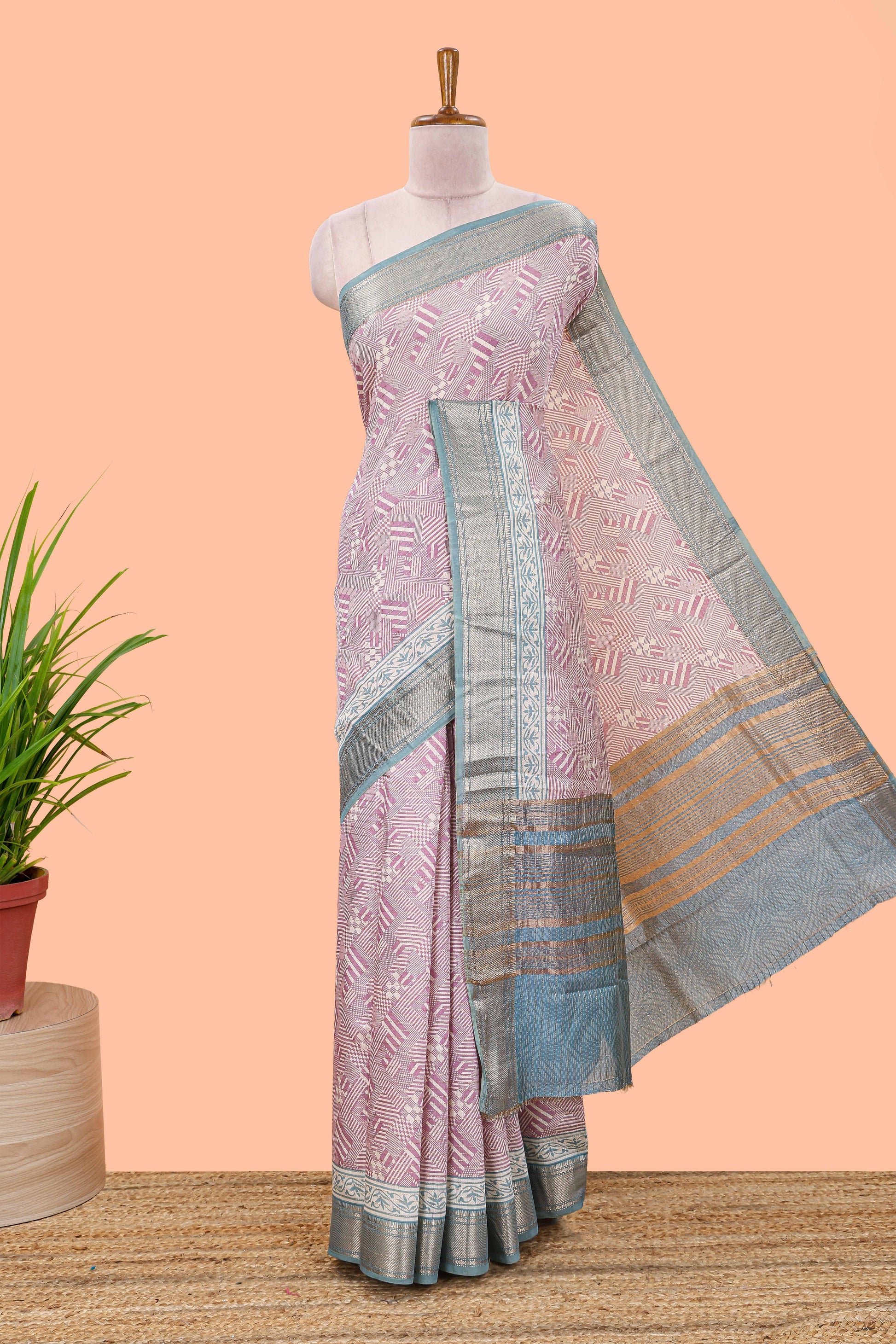 Peach assam silk saree with geometric print body, contrast zari border, and zari stripe pallu