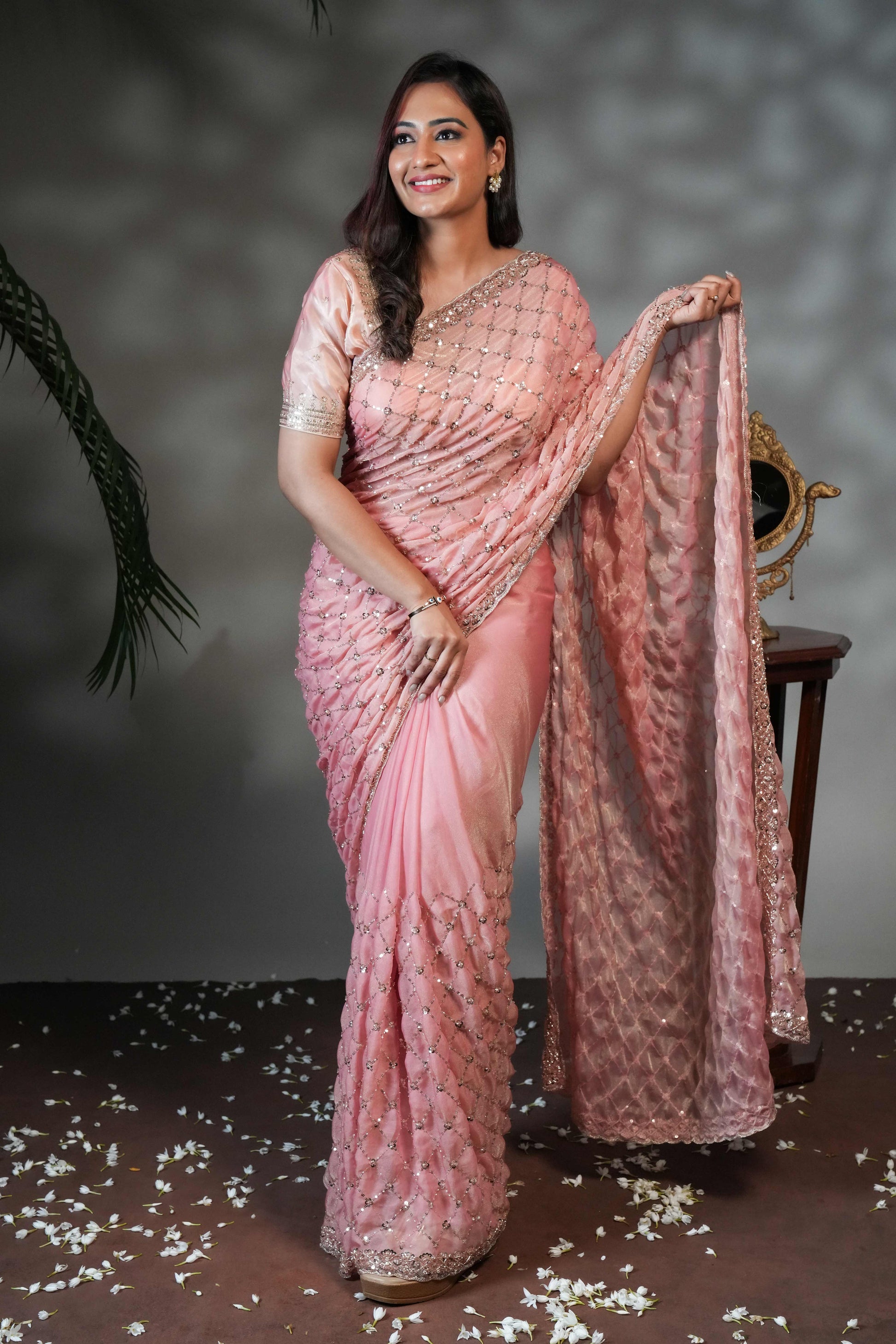 Peach geometric pattern stone work all over body designer saree with scallop design border matching blouse