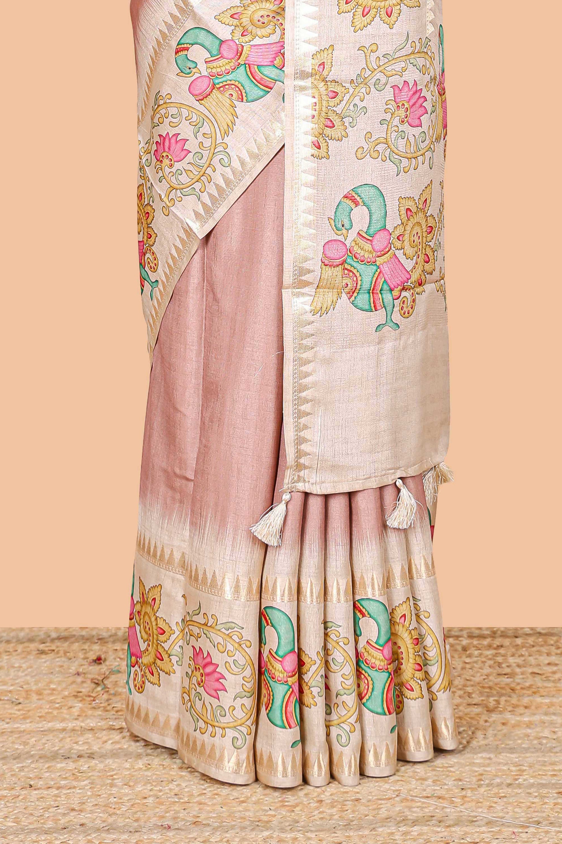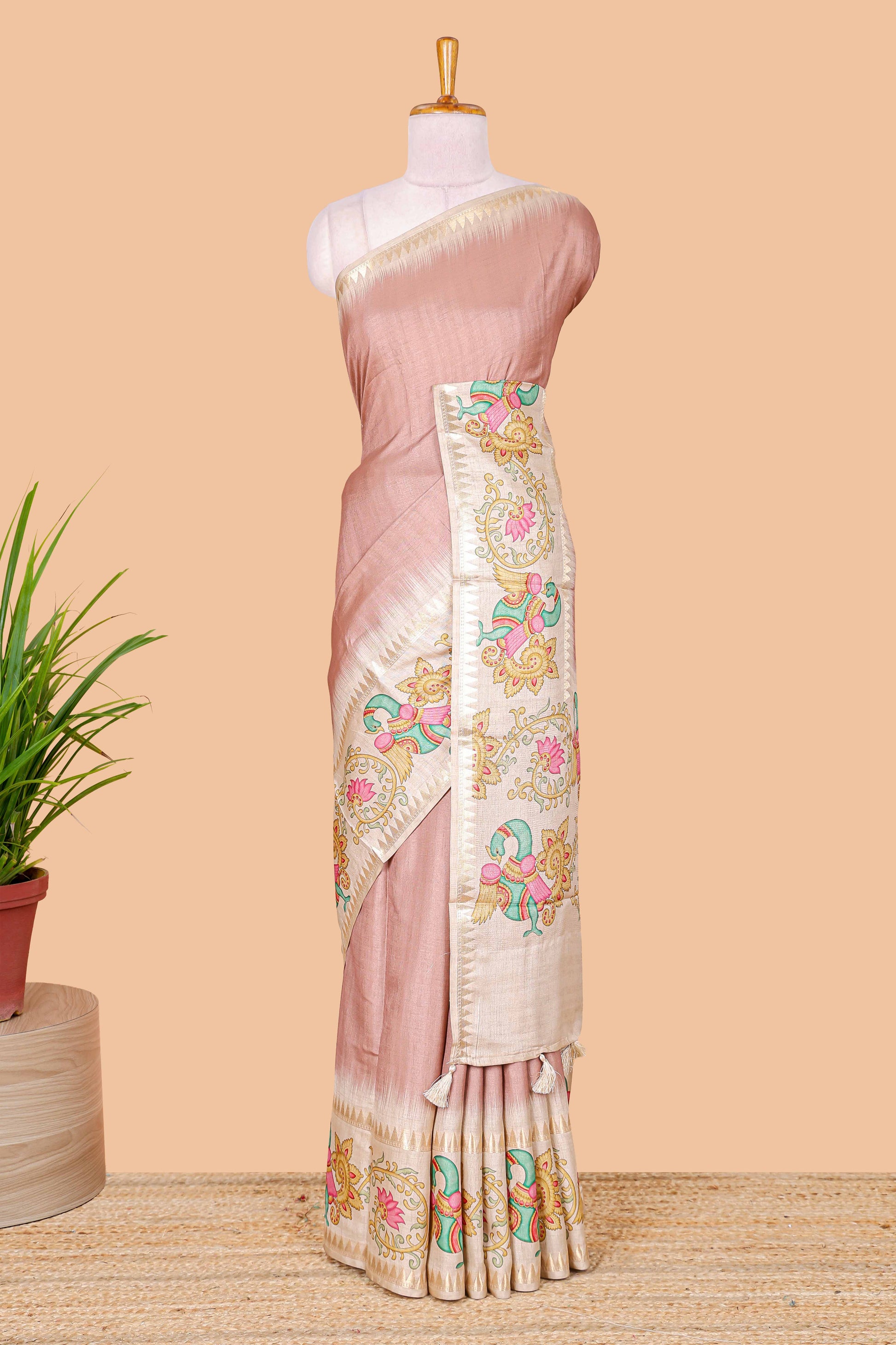 Peach plain art tussar silk saree with contrast peacock and lotus theme border and printed pallu