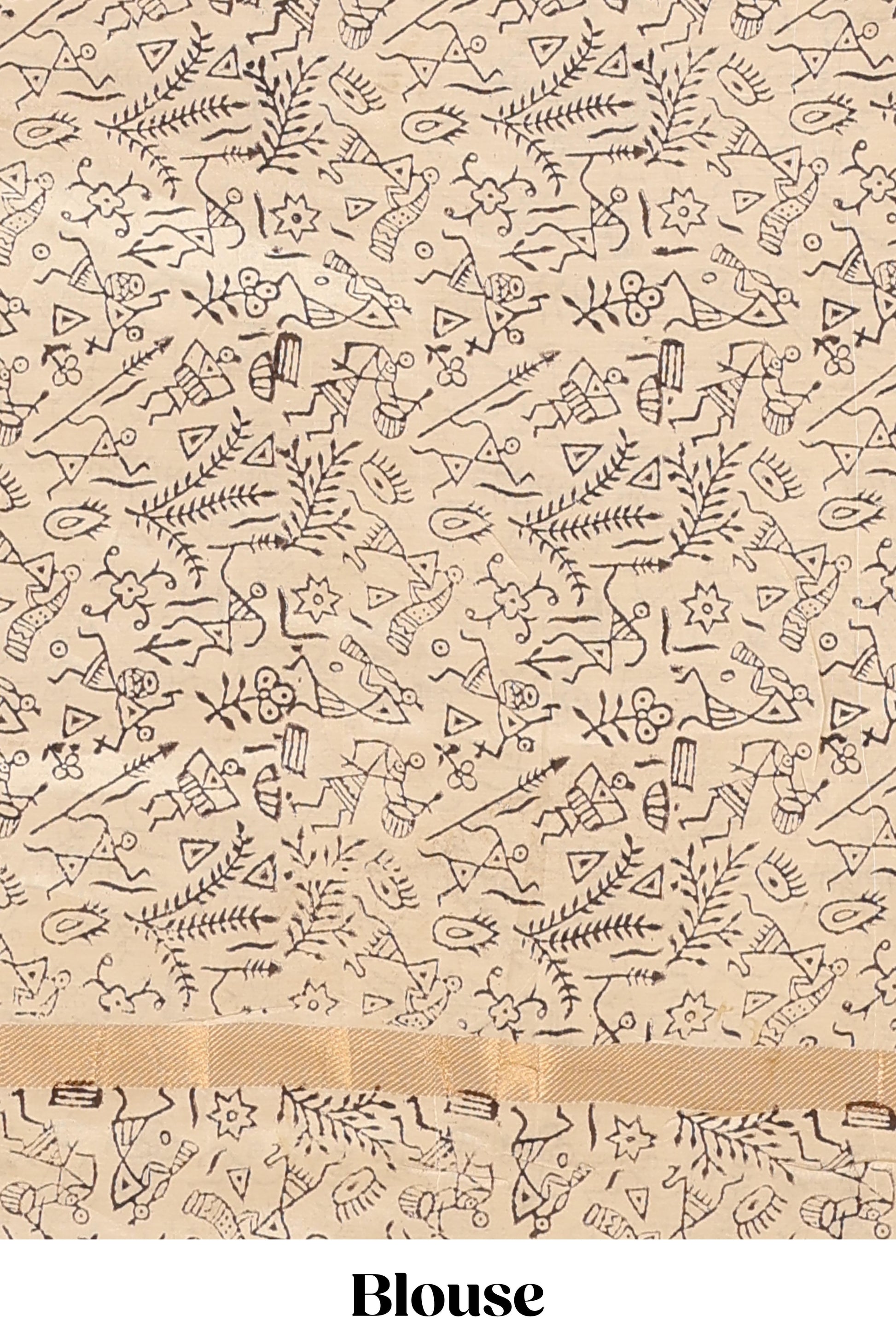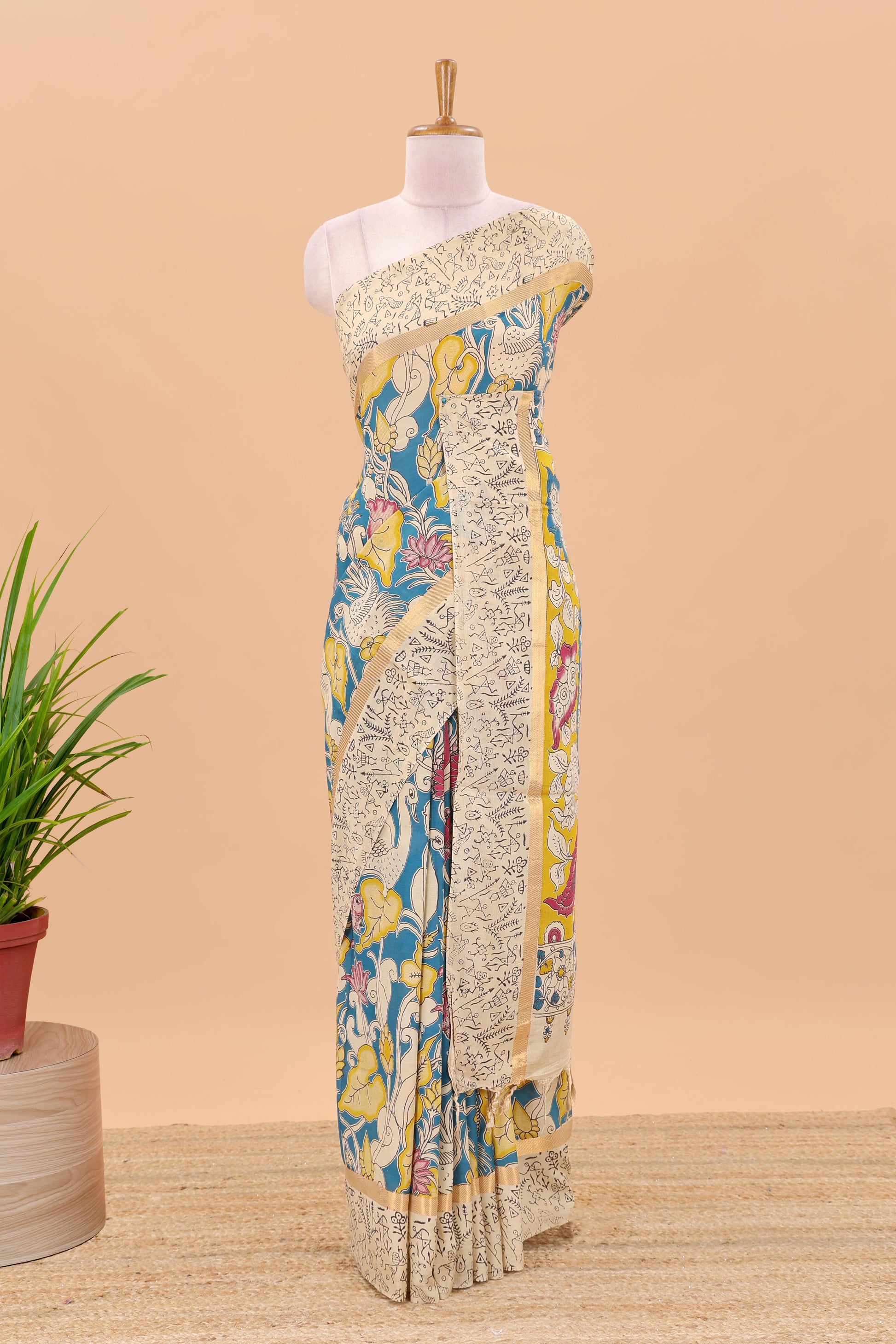 Peacock green kalamkari printed cotton saree with traditional floral motifs and contrast pallu