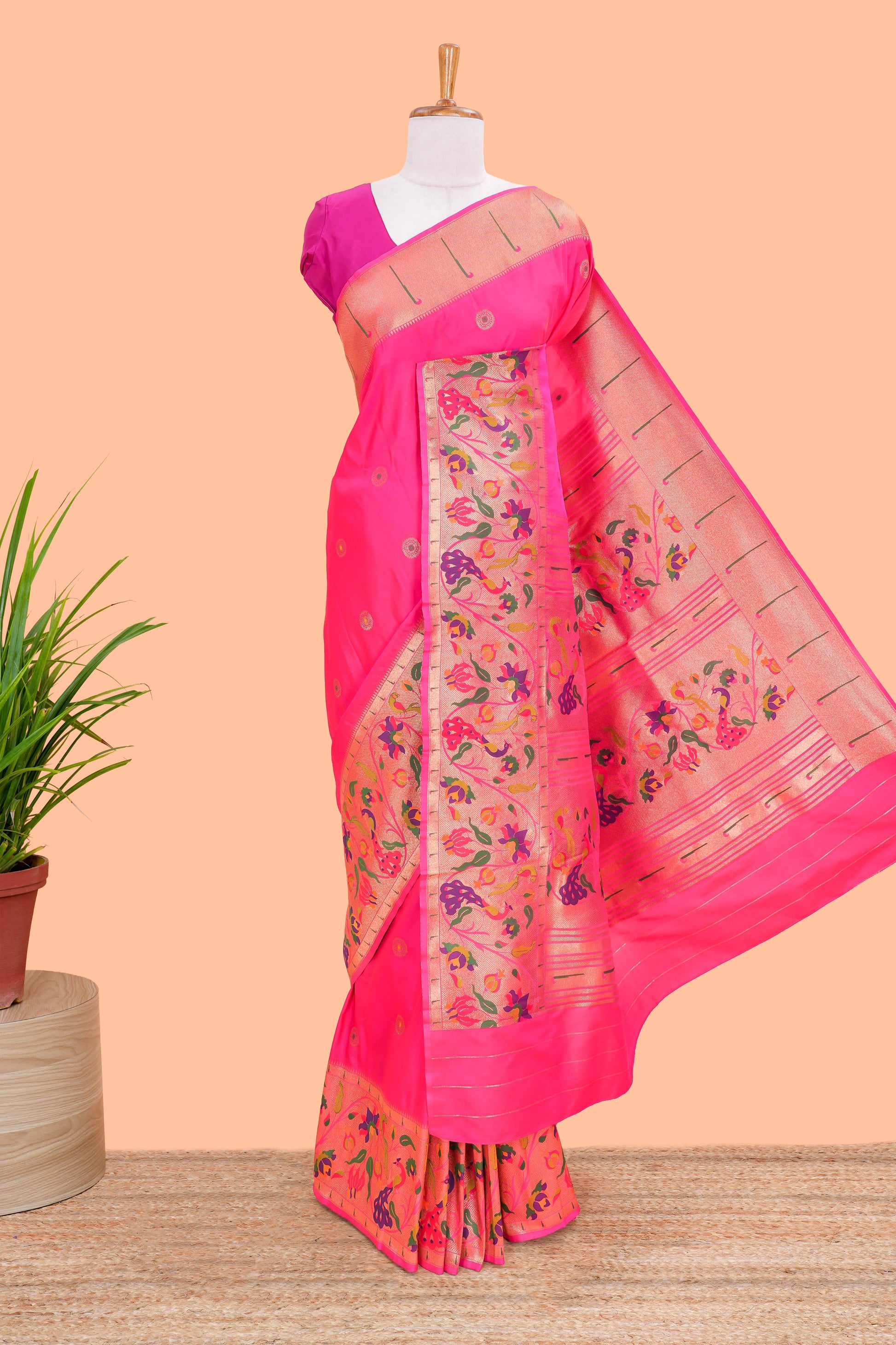 Pink art silk saree golden zari motifs body and paithani pallu along with blouse
