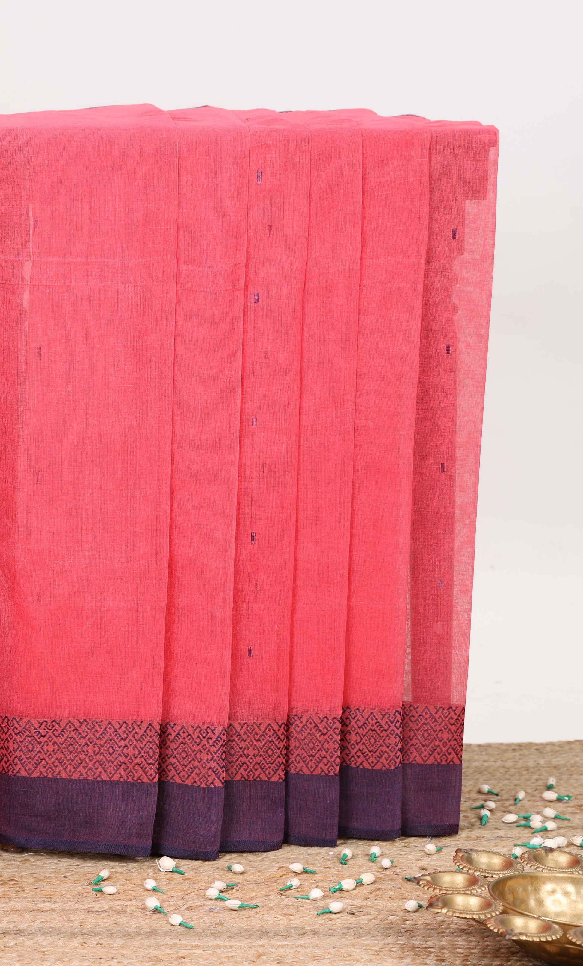 Pink buttas and bottom geometric design bengal cotton saree with contrast border and striped pallu