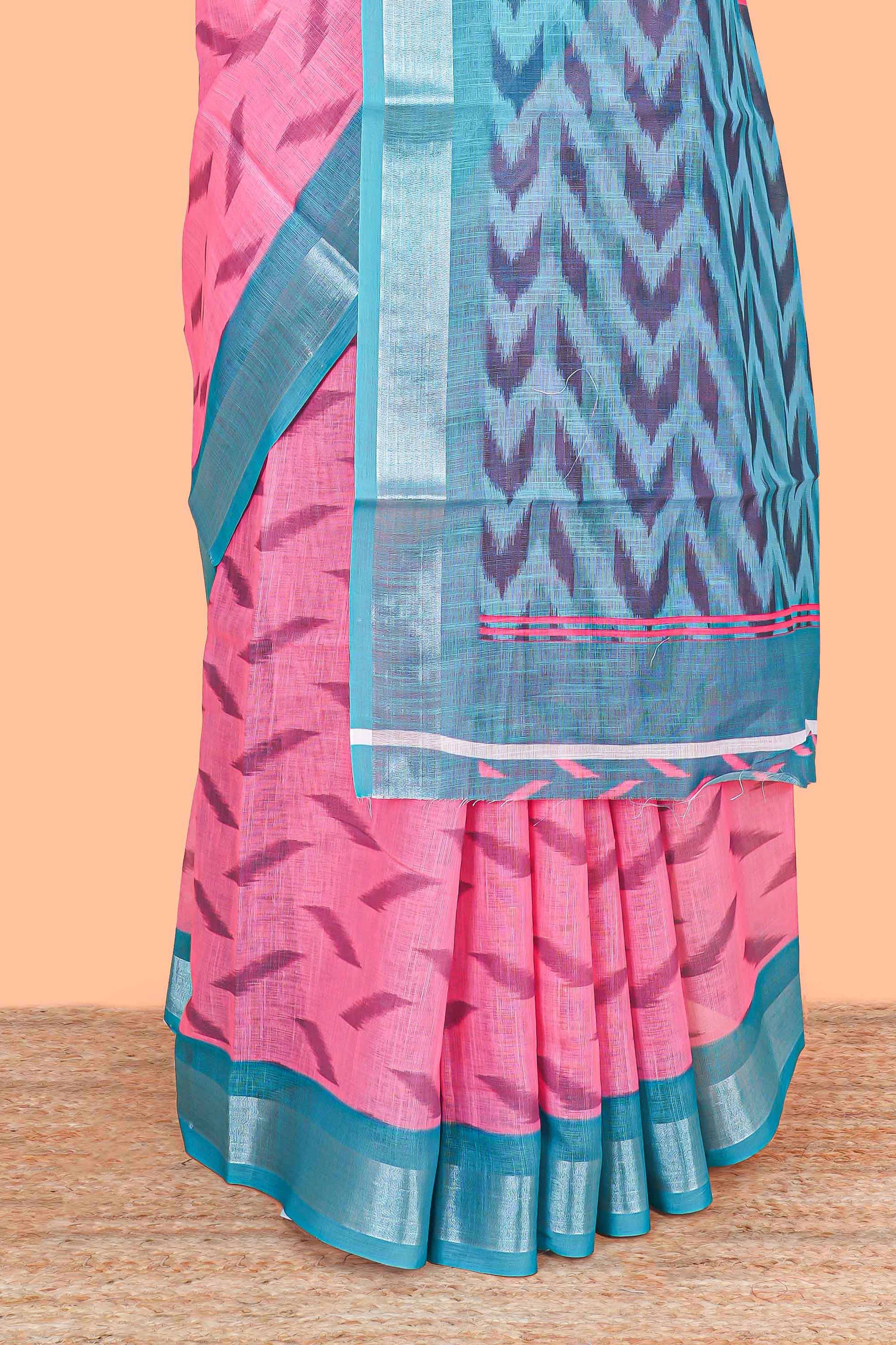 Pink Ikkat style linen cotton saree with contrast border and pallu