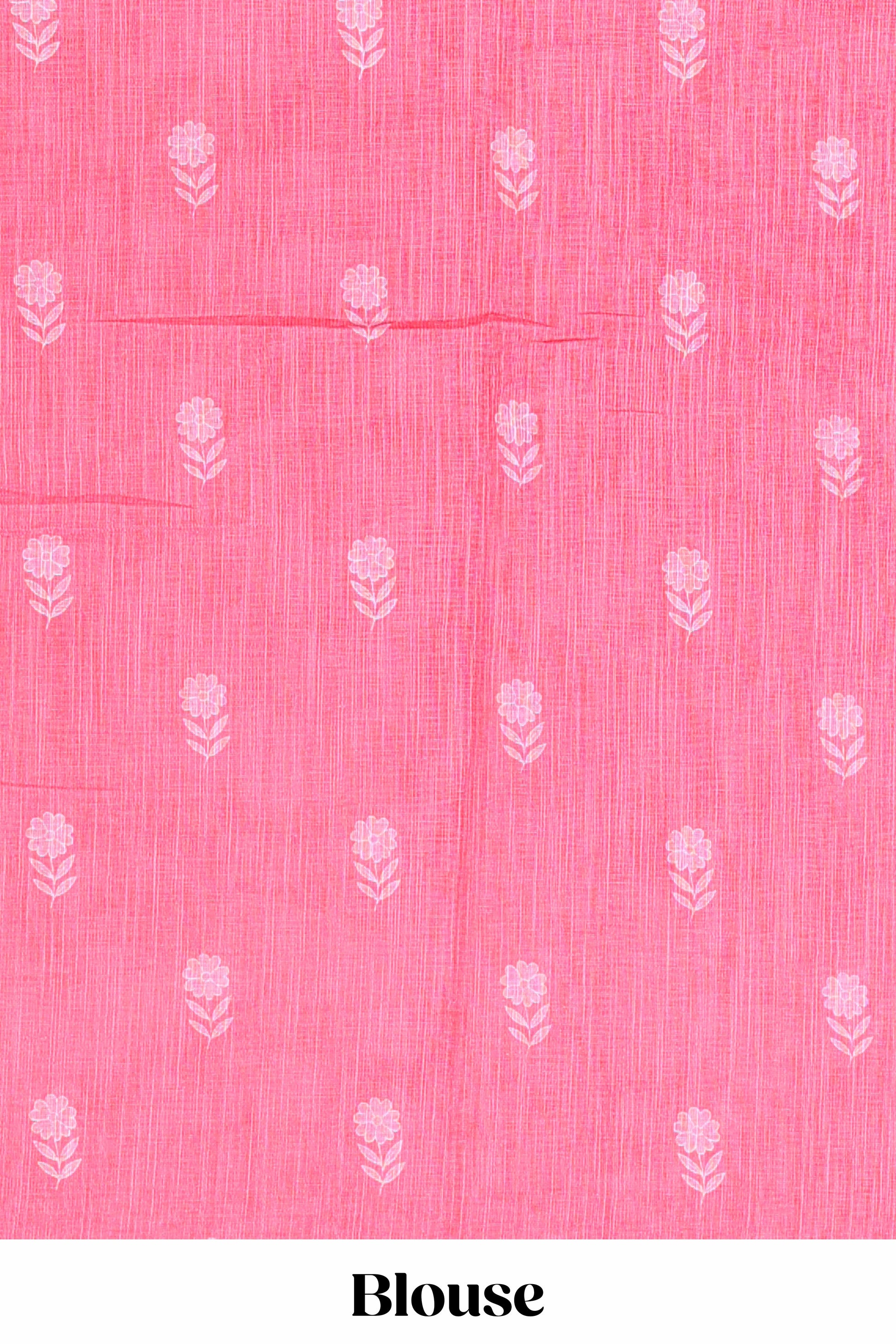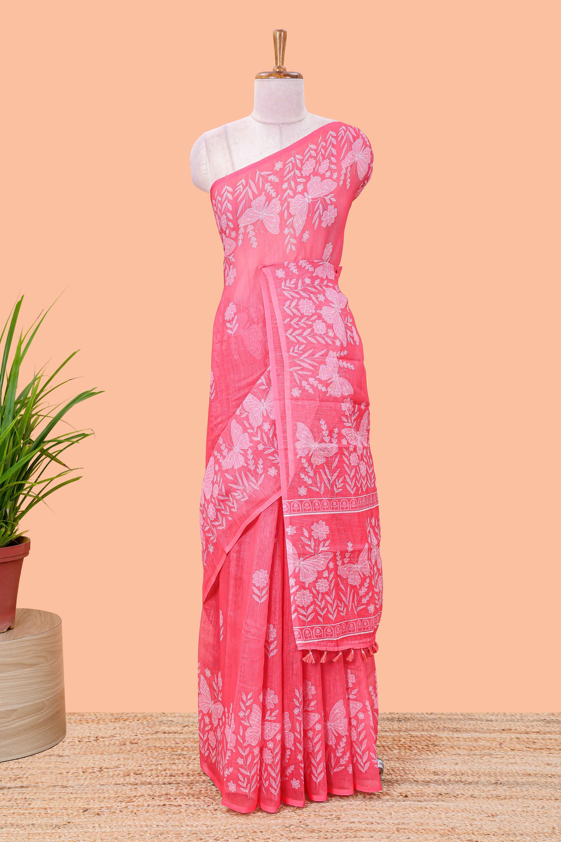 Pink linen cotton saree with floral buttas and butterfly motifs border, Printed self pallu and blouse