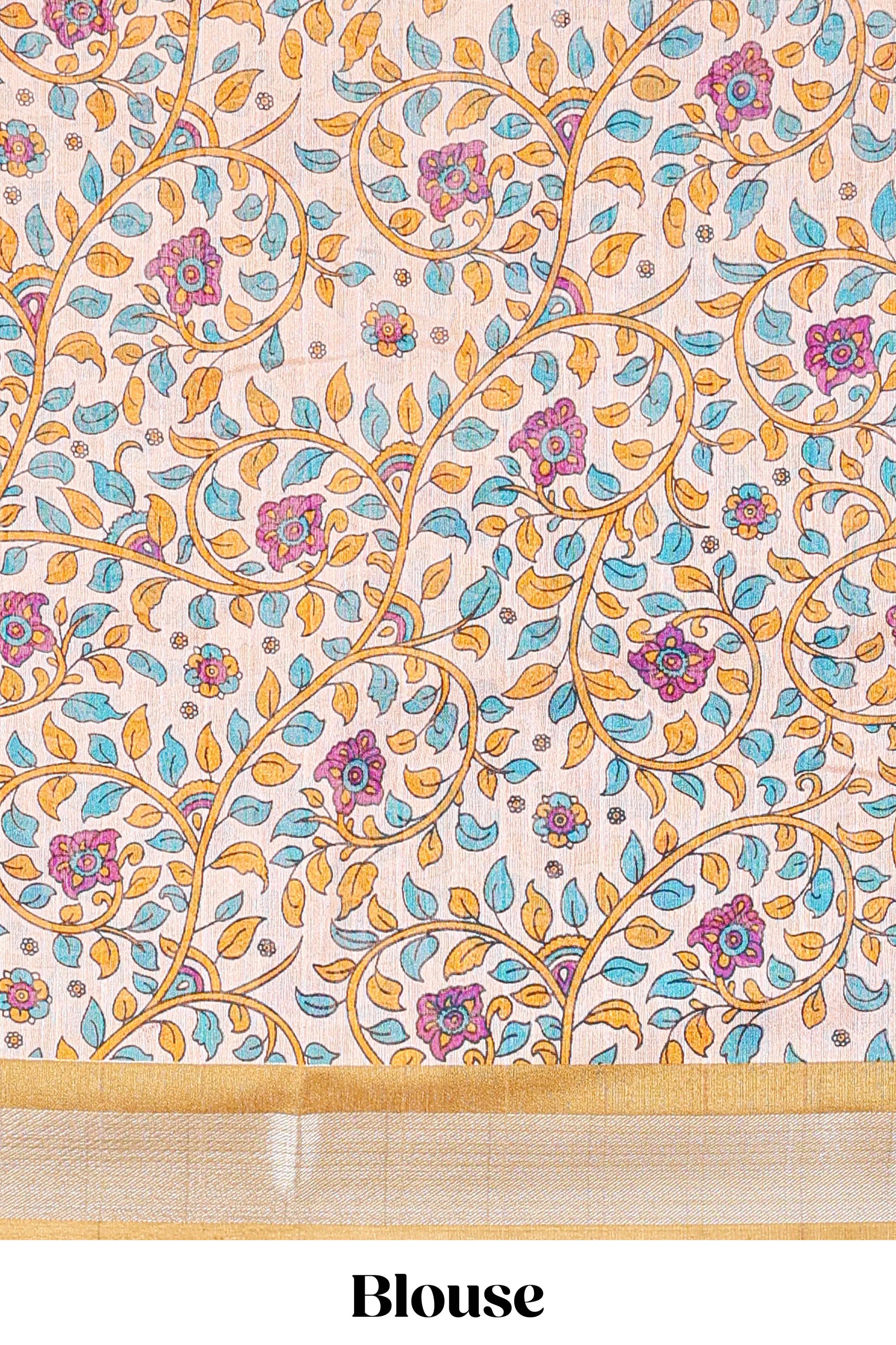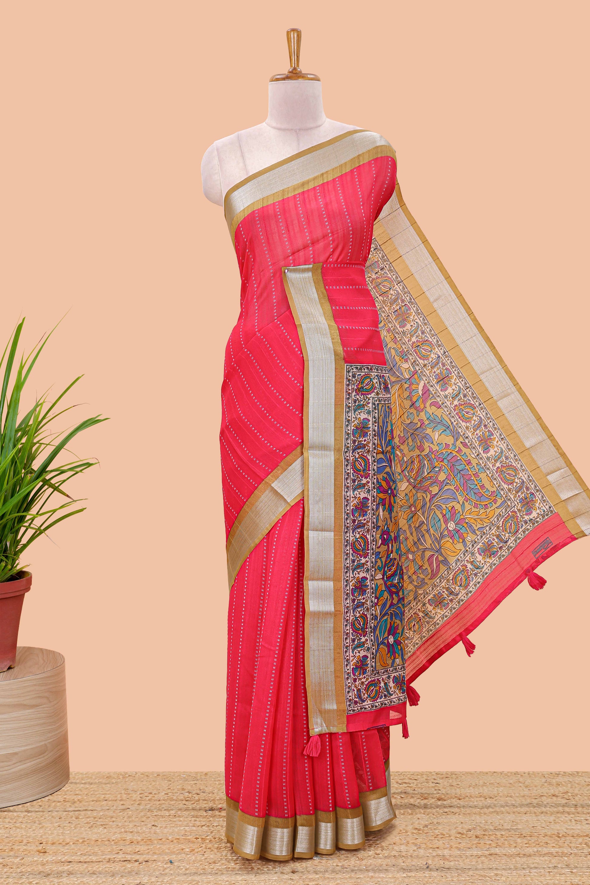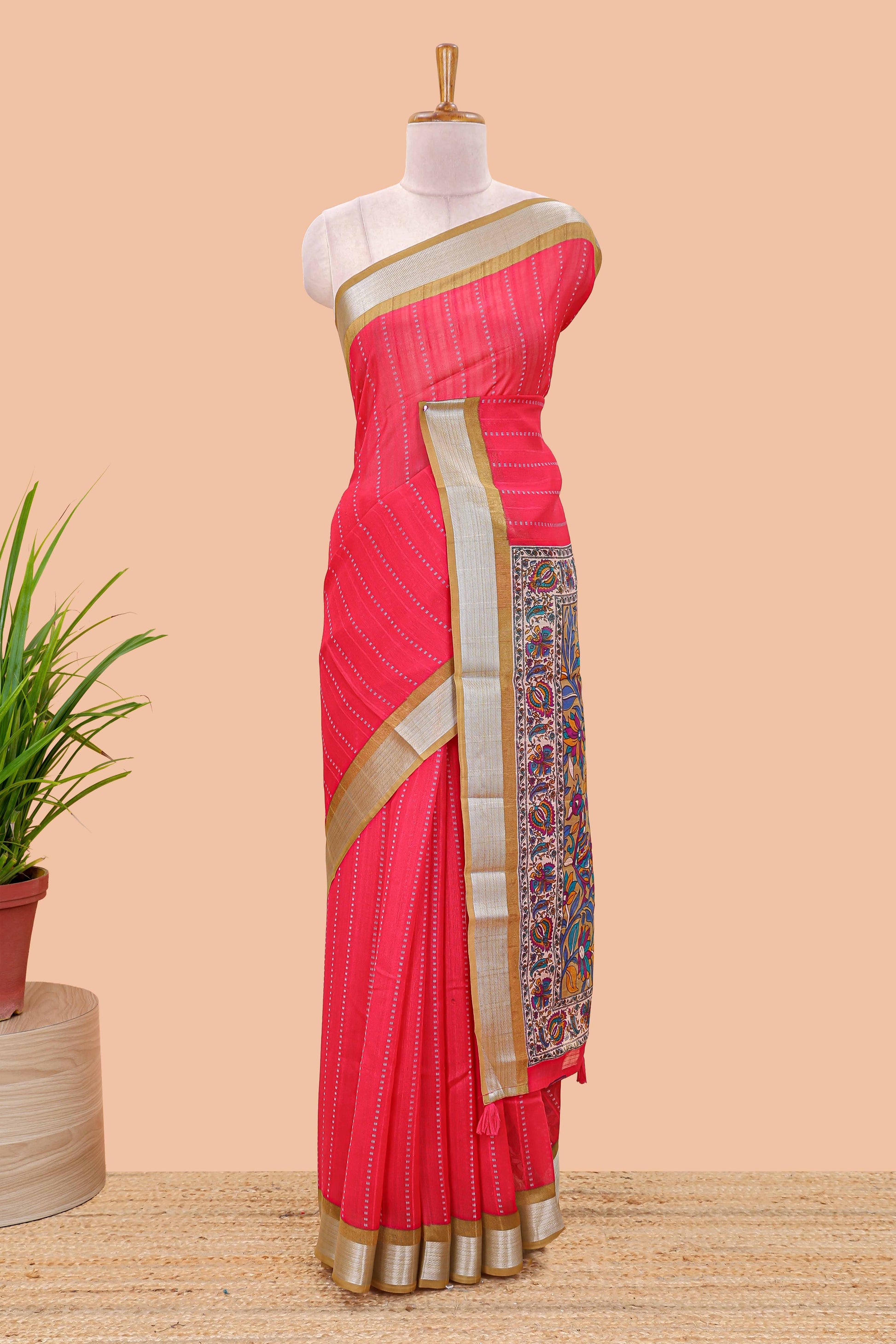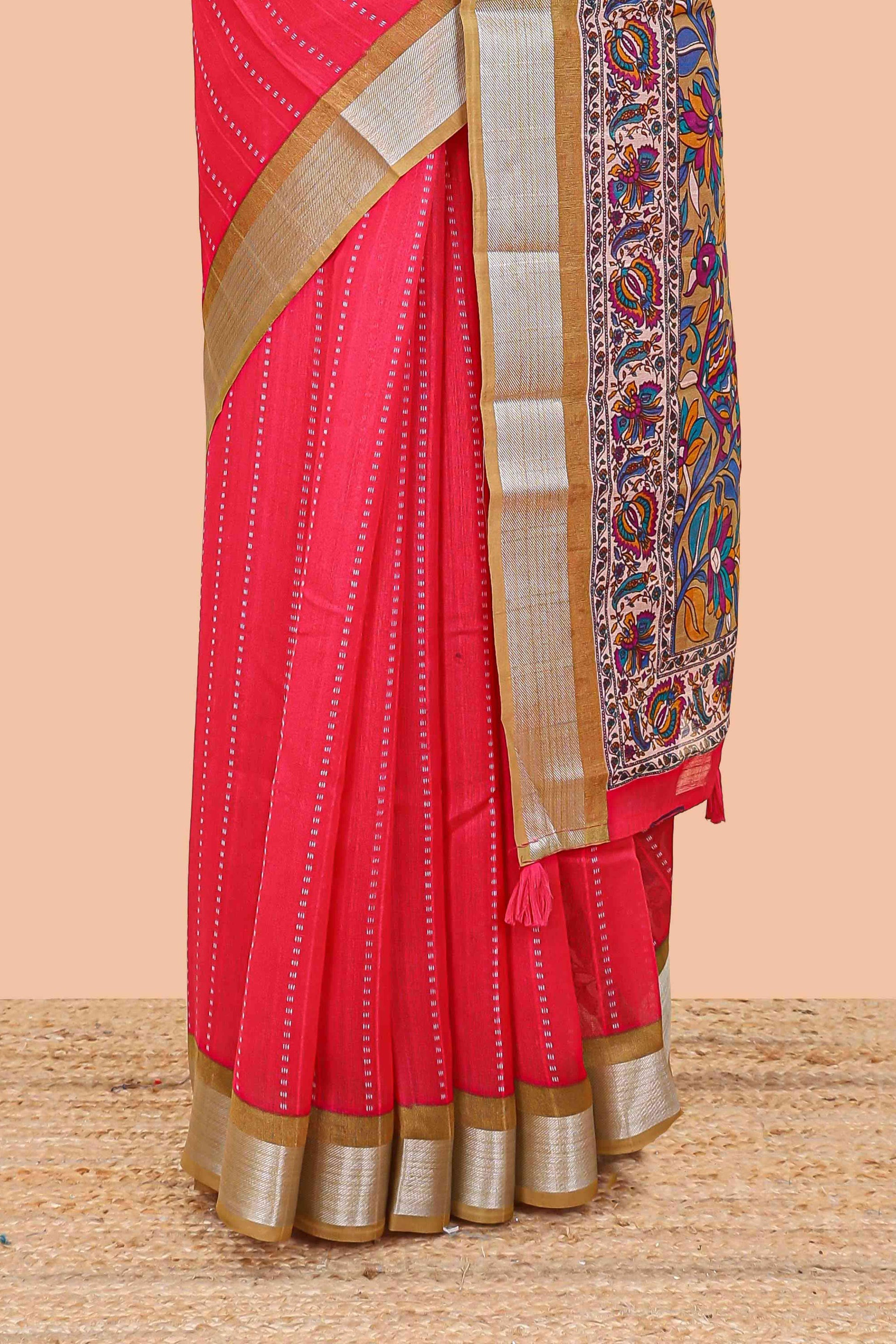 Pink linen cotton striped saree with contrast silver zari border and kalamkari pallu