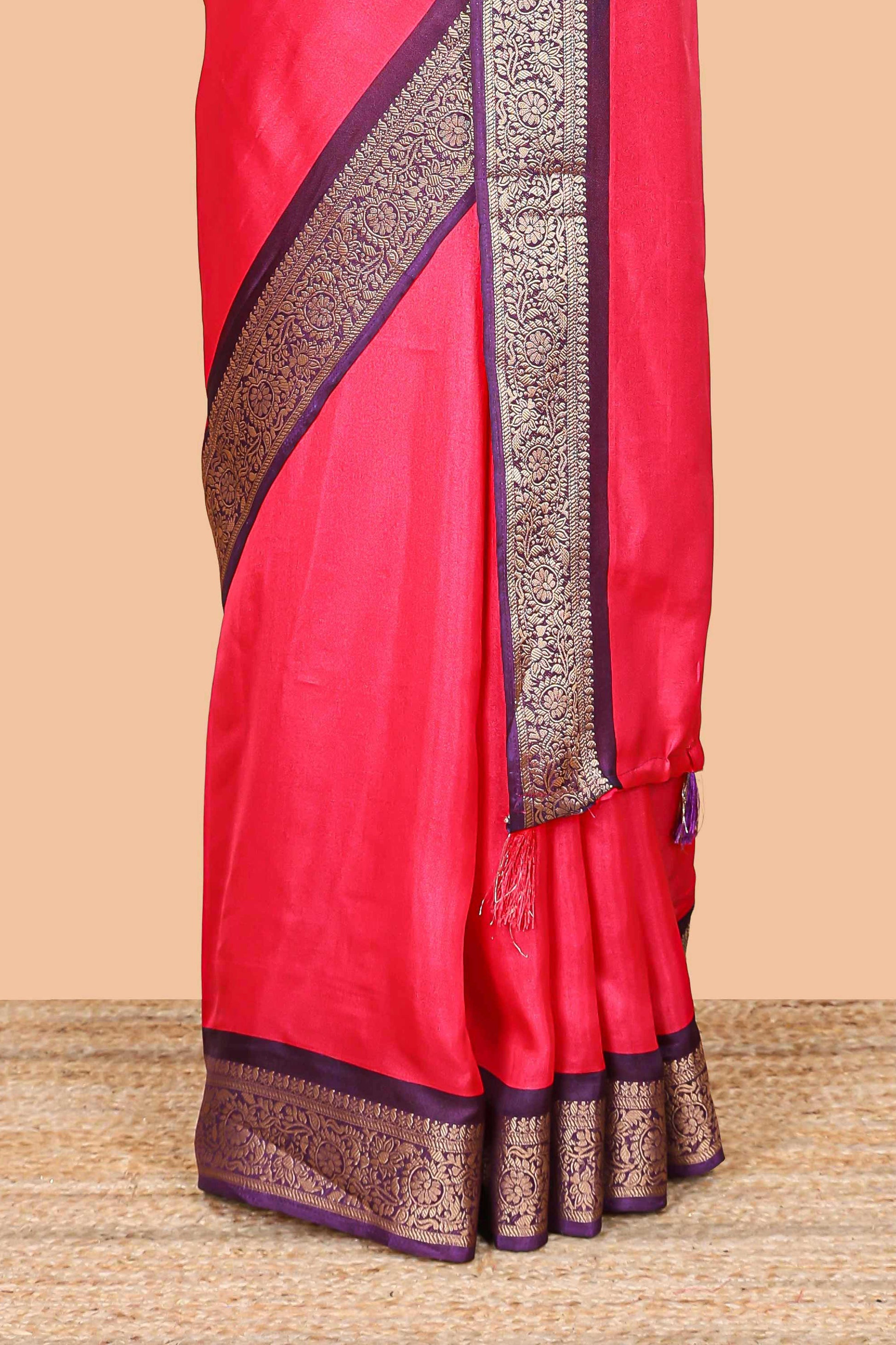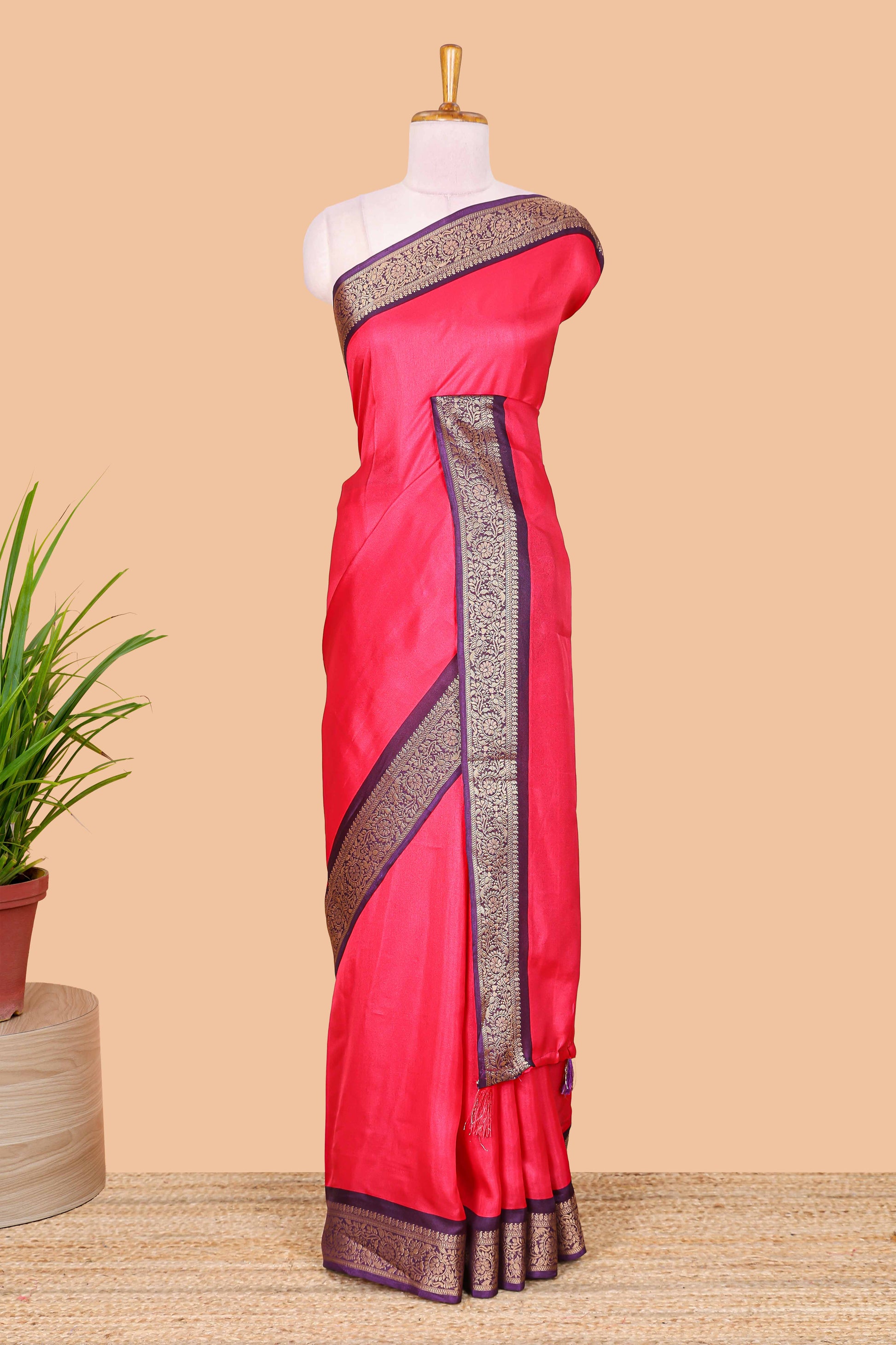 Pink marsh mellow plain saree with contrast gold zari border and butta blouse