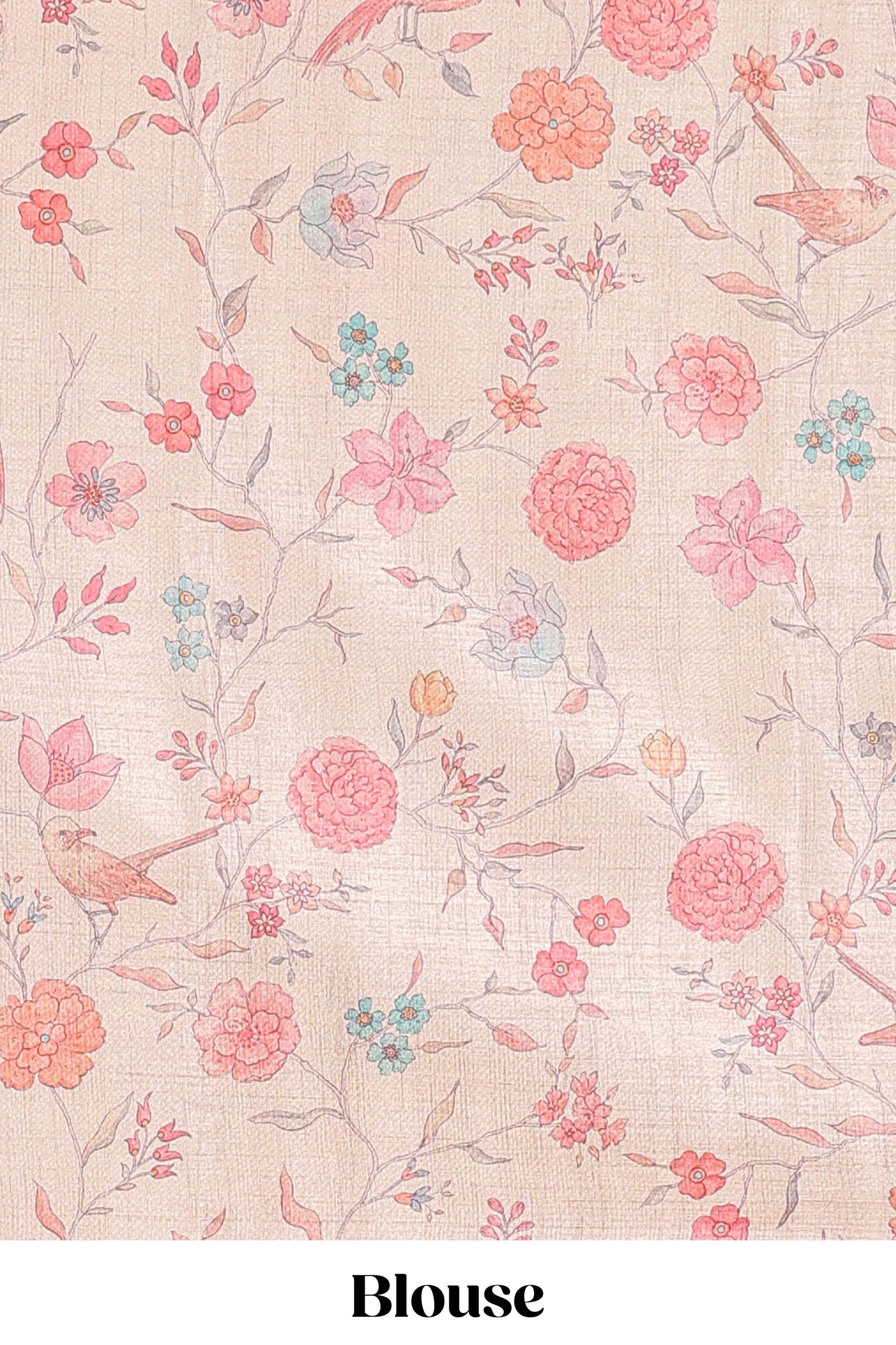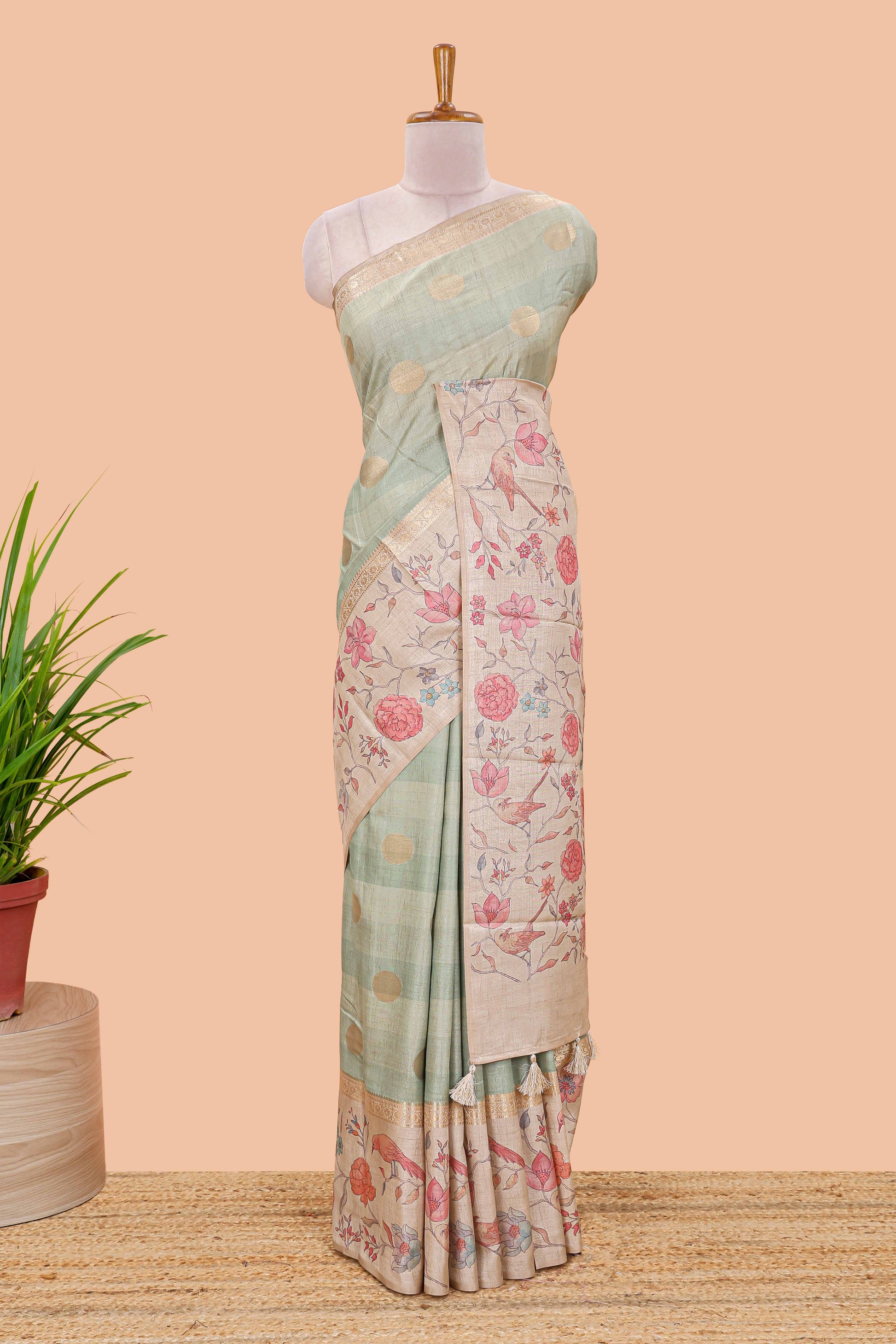 Pista green art tussar saree featuring round zari butta body with floral and bird motif printed border and pallu