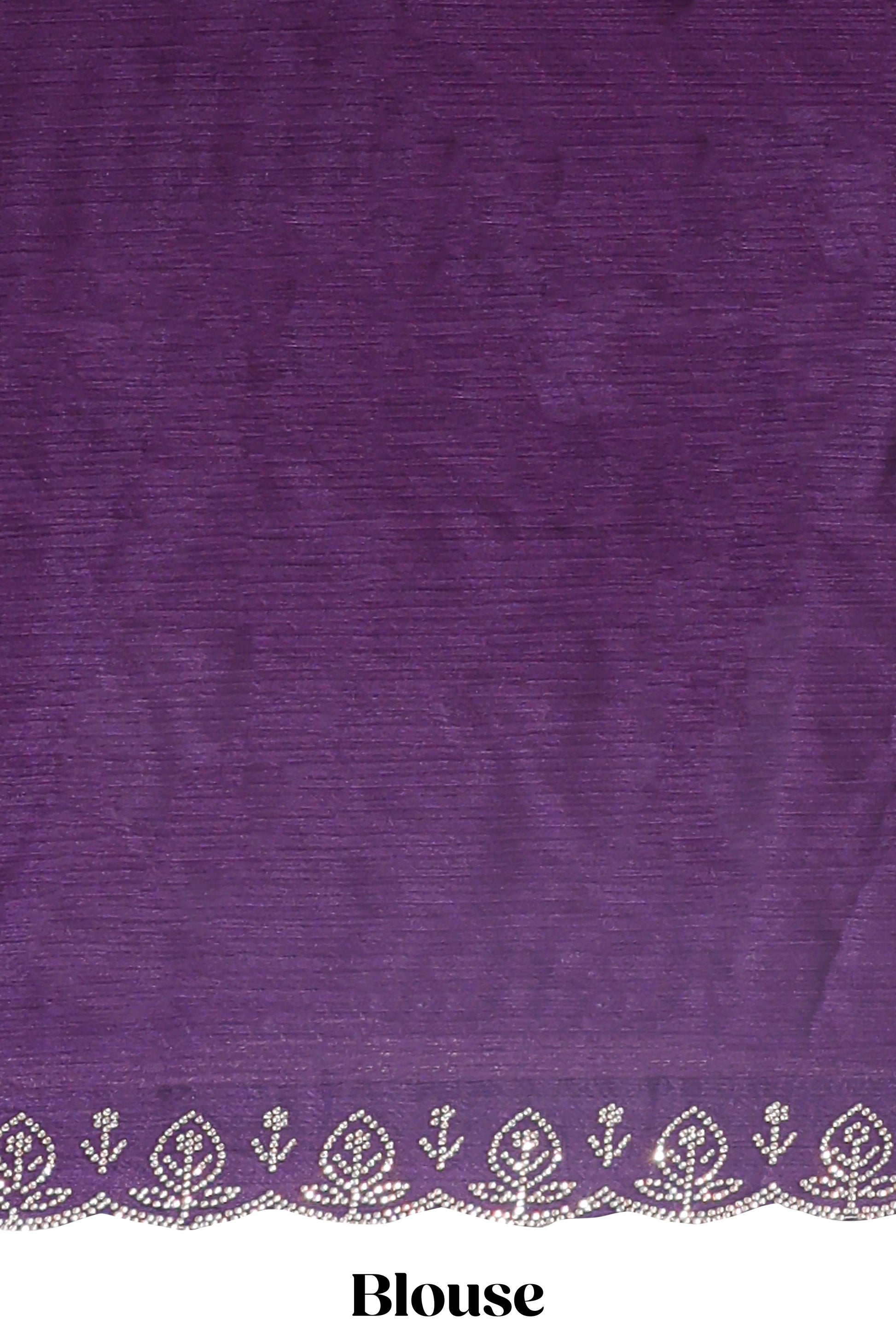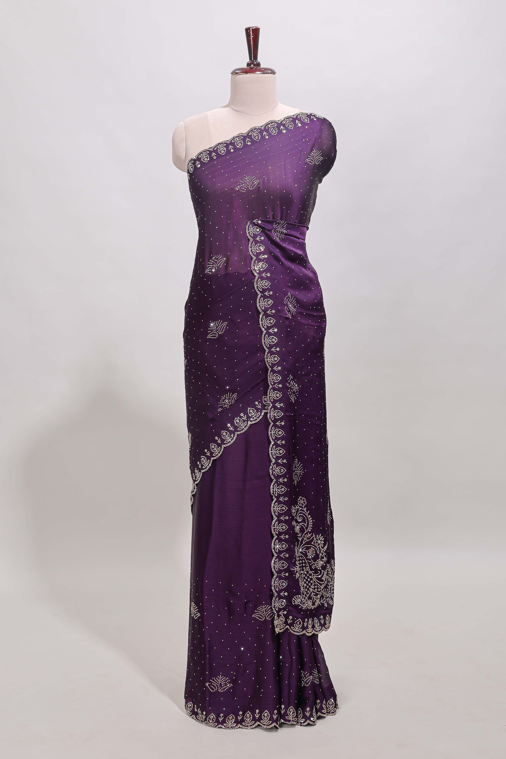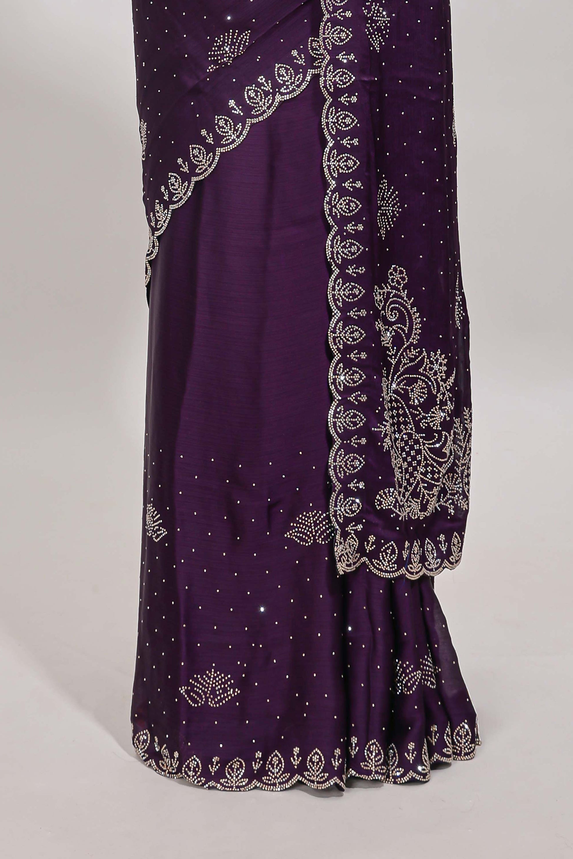 Plum lavender floral motifs design stone work designer saree with self floral scallop border and matching blouse